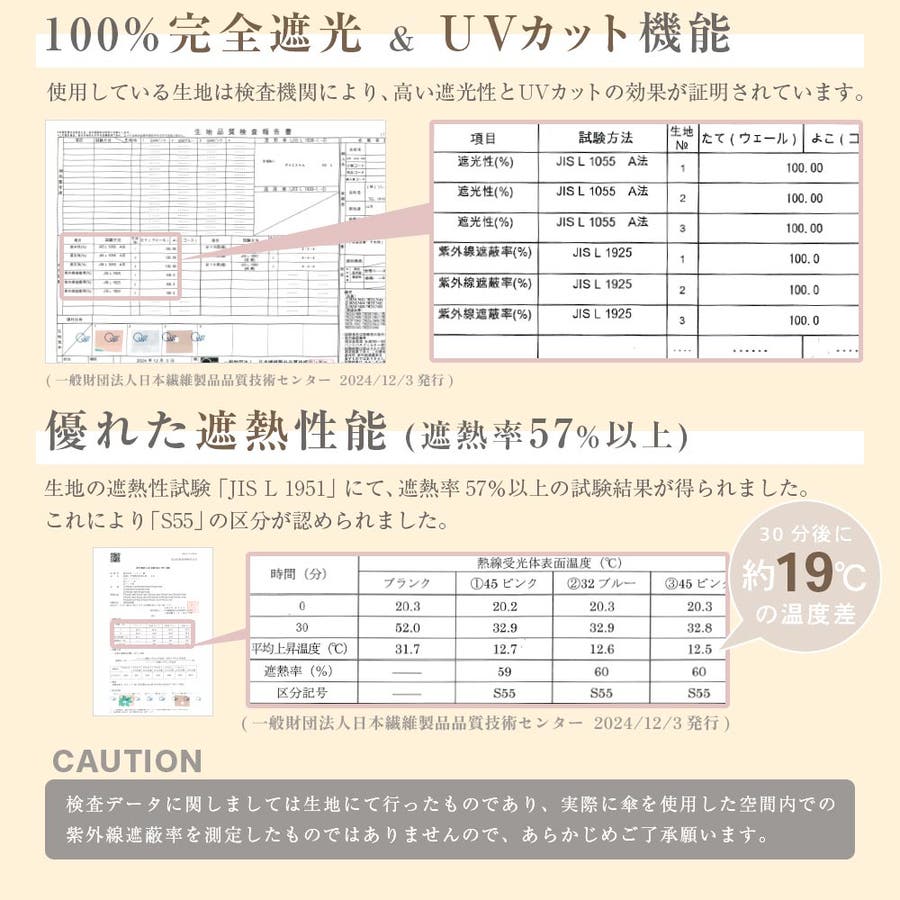 遮光率/100% 一級遮光 UV遮蔽率/100% 遮熱性試験 JIS L 1951/S55 晴雨兼用:撥水性等級4級 8本骨、手開き