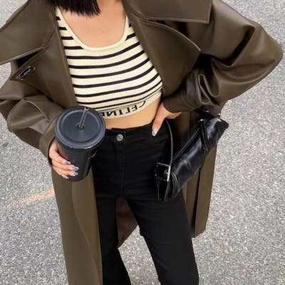 ガウン風の着こなしでこなれ感を出すフェイクレザースタンドカラーコート