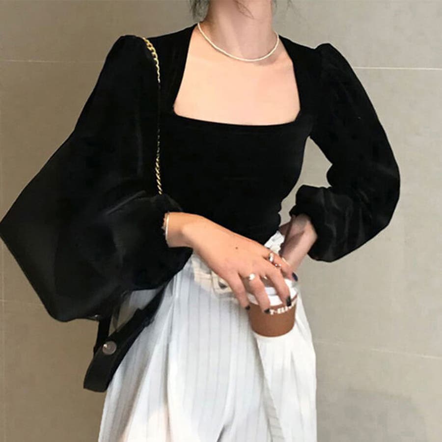 スクエアネックで大人っぽいパフスリーブブラウス 韓国 シック