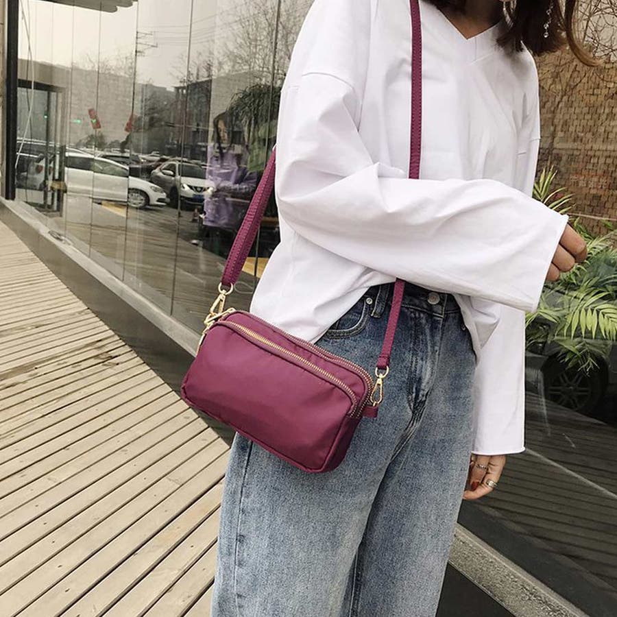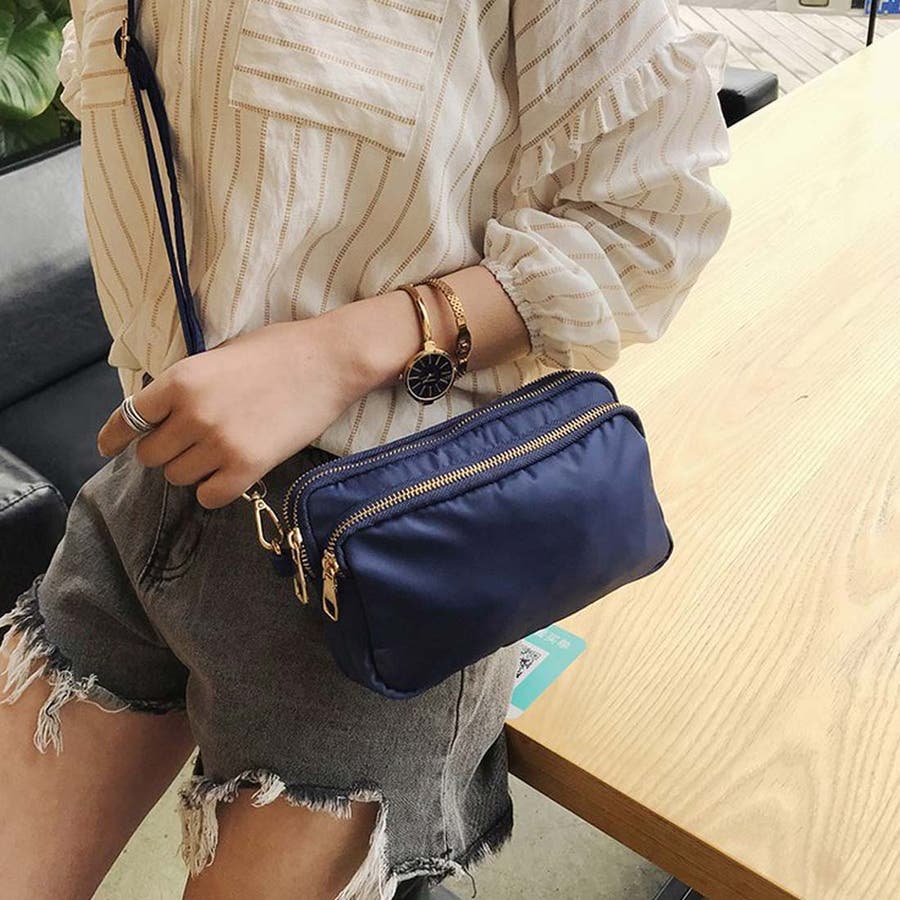 商品説明 | ゴールドのファスナーがアクセントのミニショルダーバッグ。 ナイロン素材でとても軽く、防水加工も施してあるので、レジャーにも活躍しそう◎ 中は3つのポケットで分けられているので、貴重品やコスメを分けて収納できるのが嬉しいポイントです。 ショルダー部分は取り外しが可能なので、ポーチとして使うこともできますよ♪ |