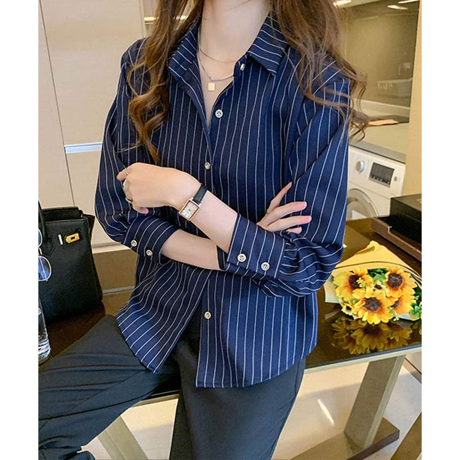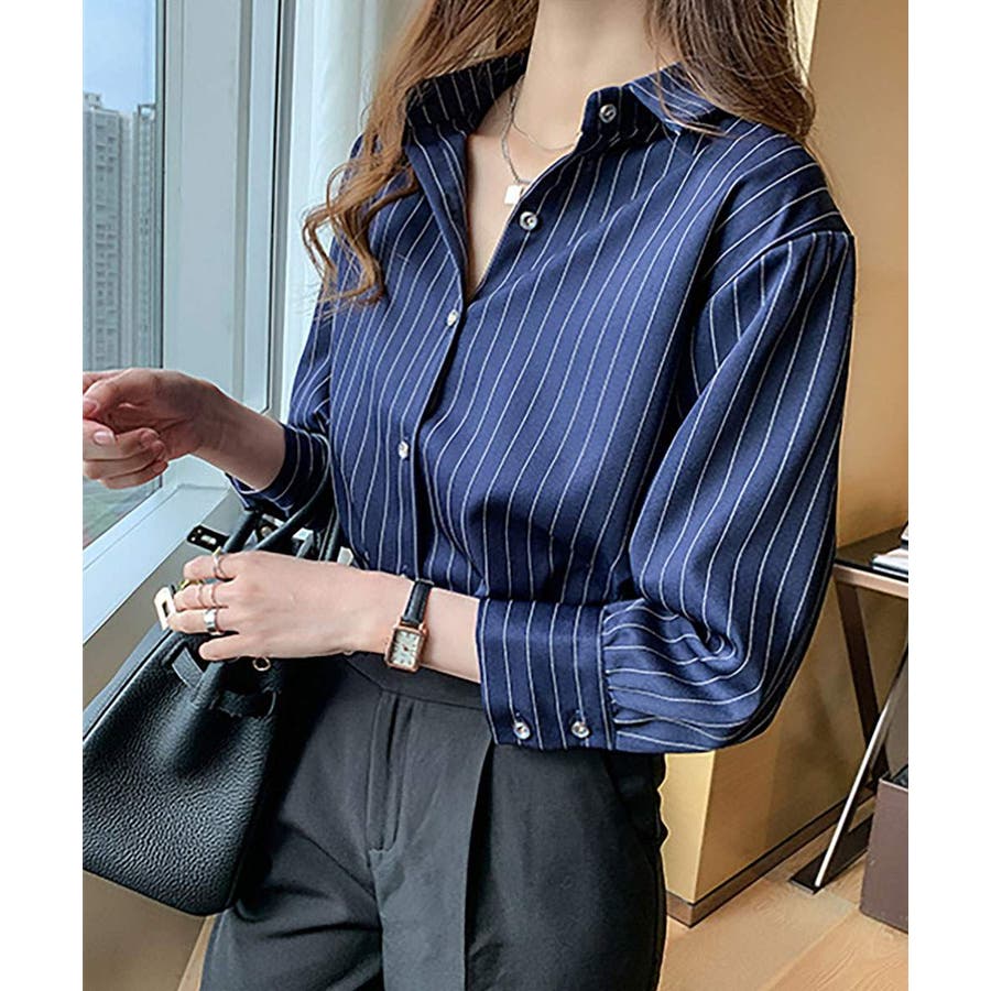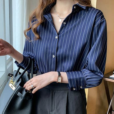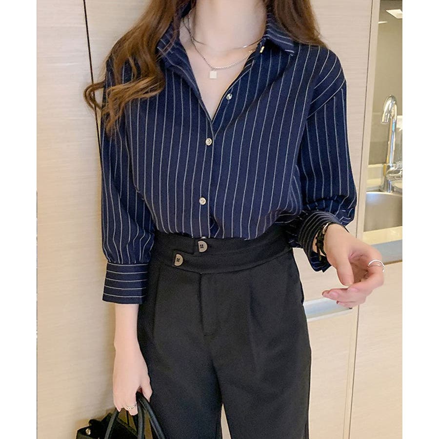 「上品ストライプデザイン&ゴールドボタンがオシャレなレディースシャツ」オフィス