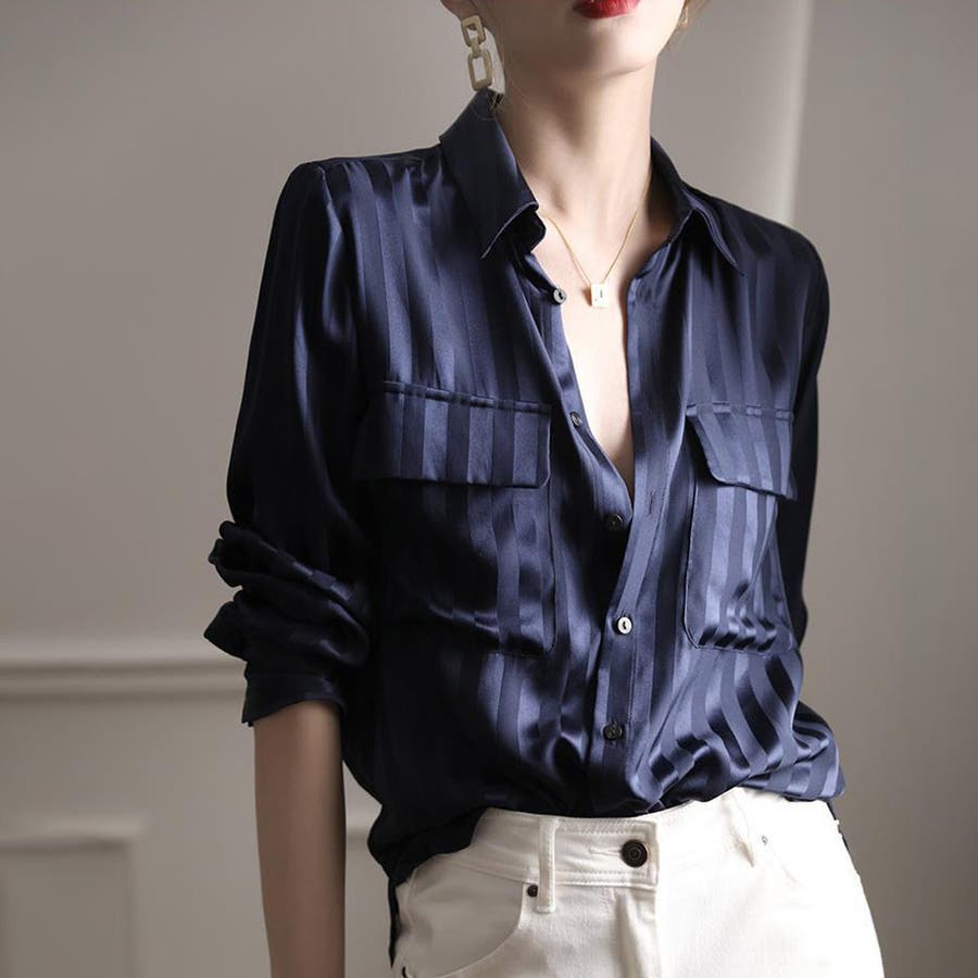 光沢感が上品なストライプデザイン長袖シャツ 秋 縦縞