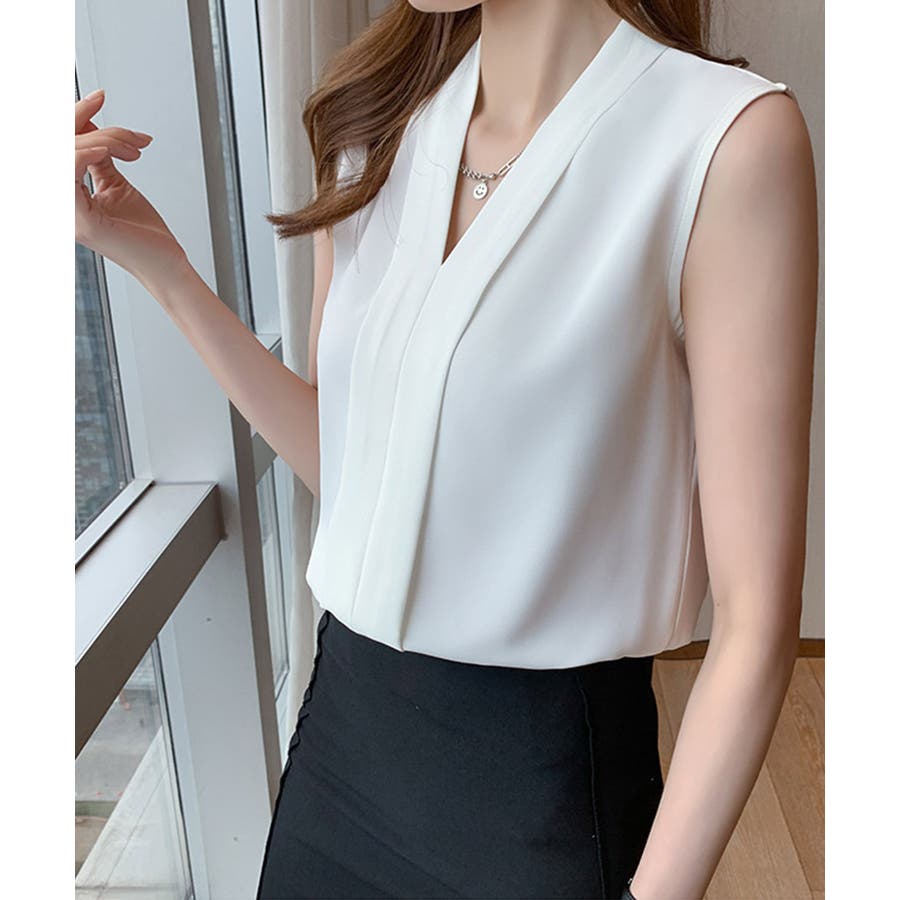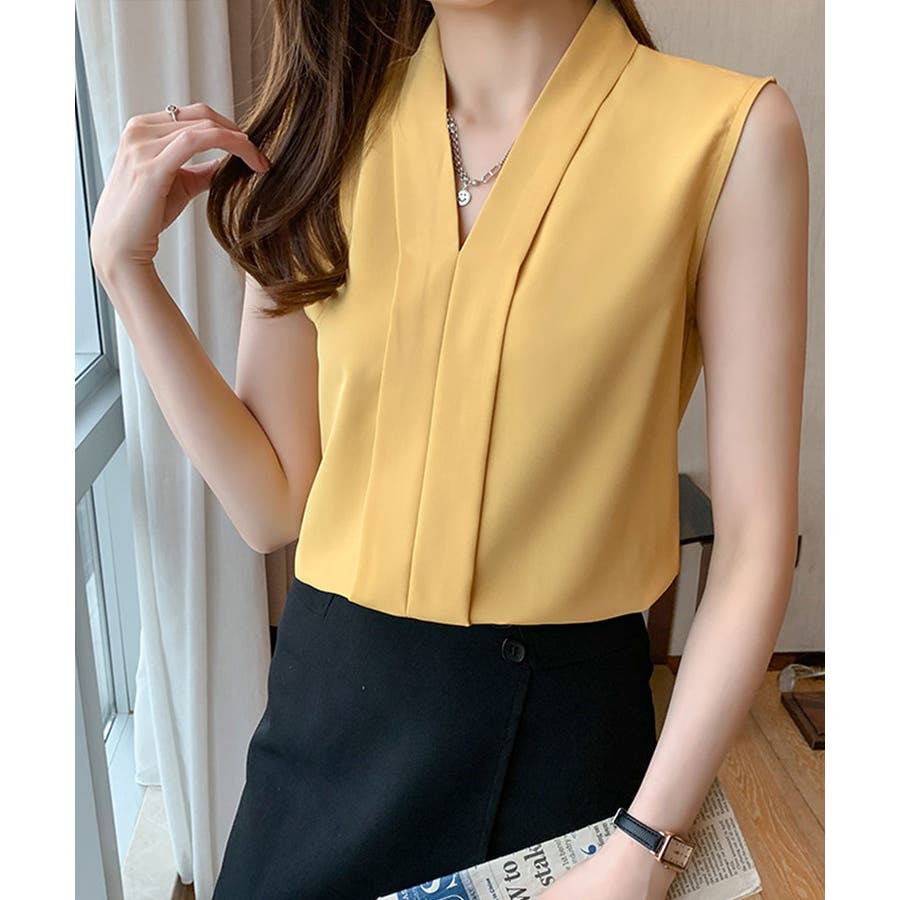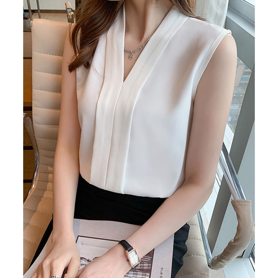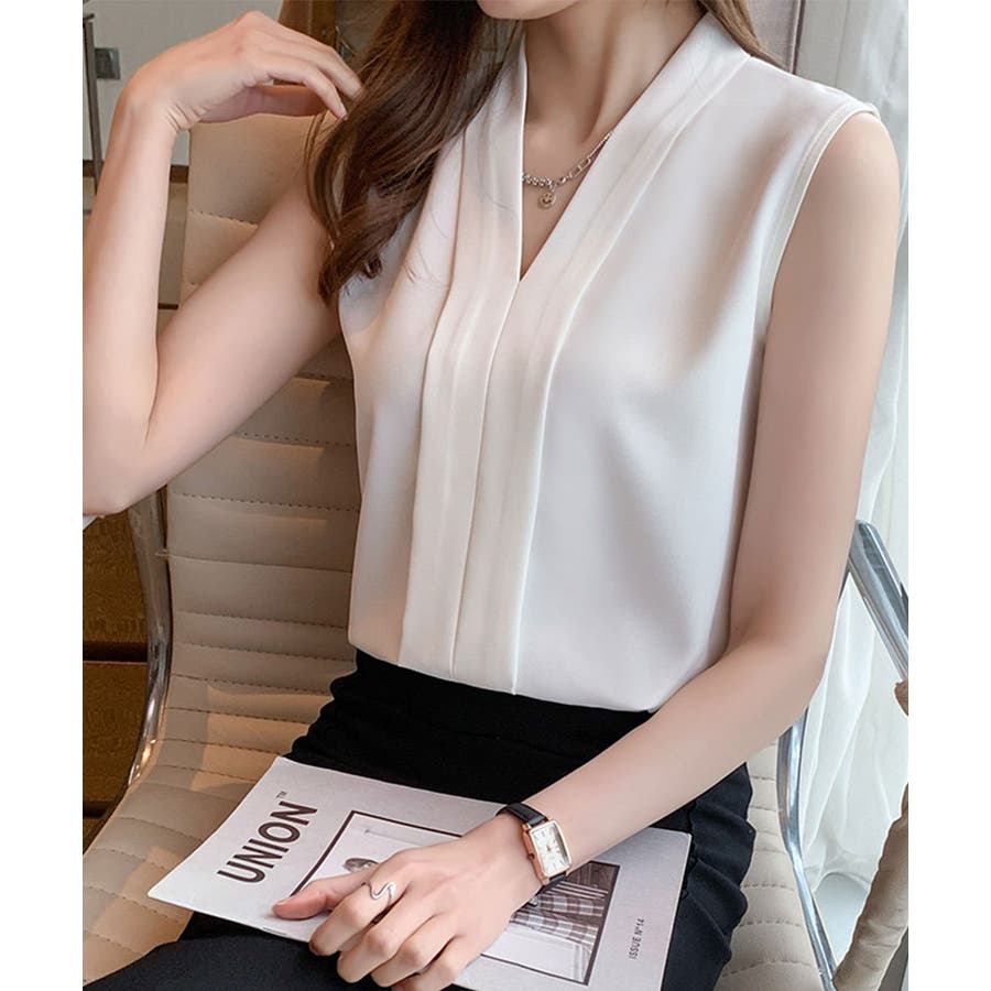 エレガントなコーデに仕上がるノースリーブシフォンブラウス Vネック 秋