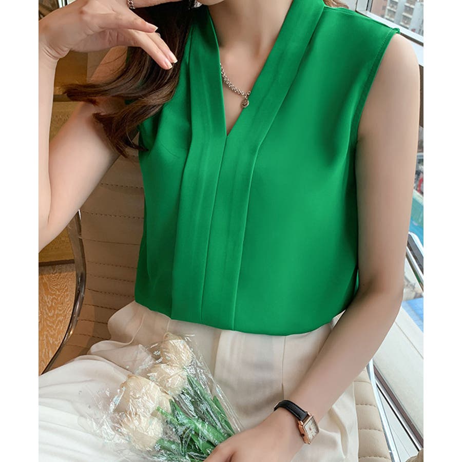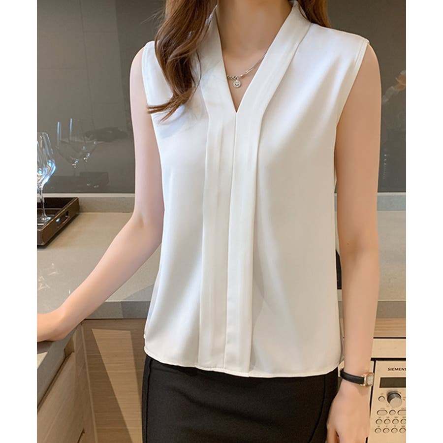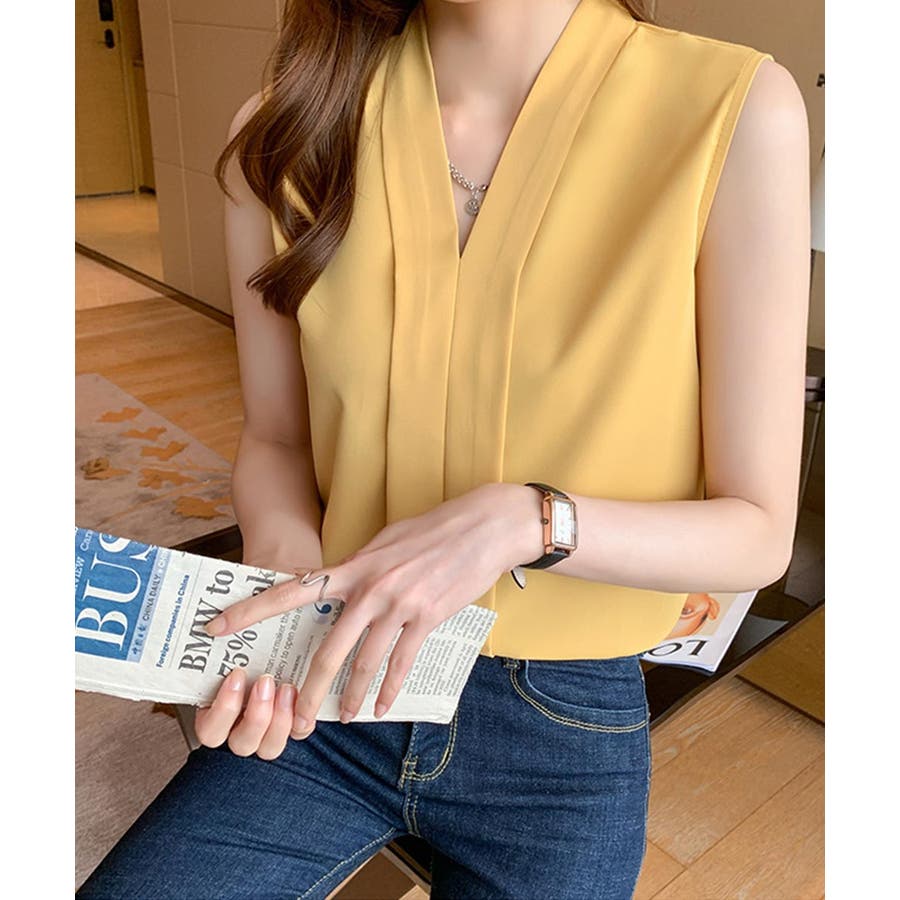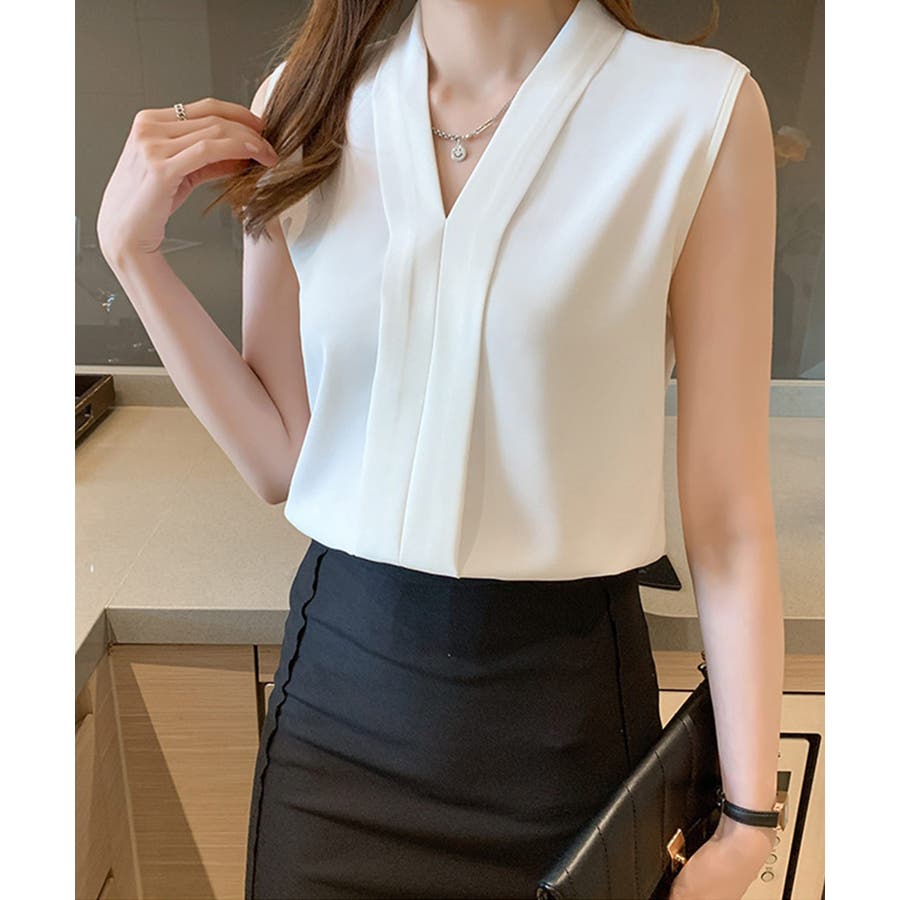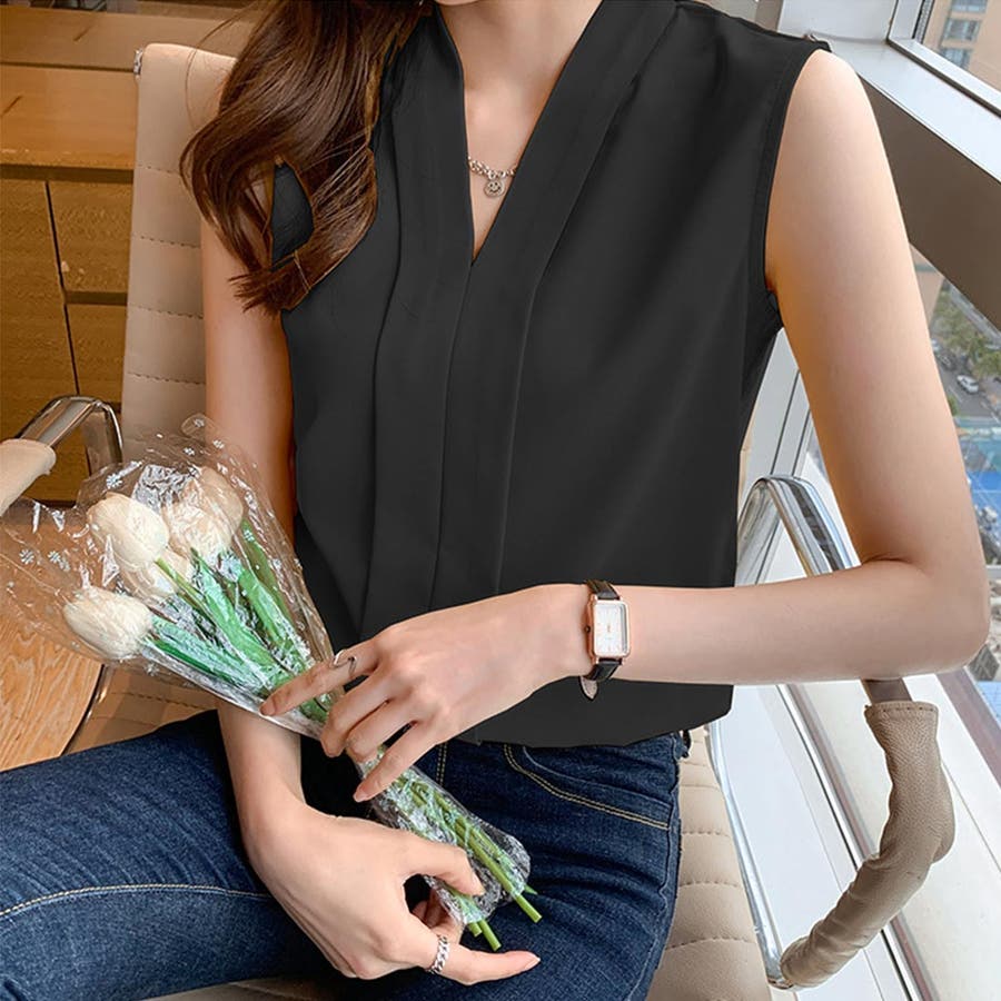 エレガントなコーデに仕上がるノースリーブシフォンブラウス Vネック 秋
