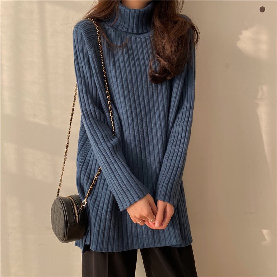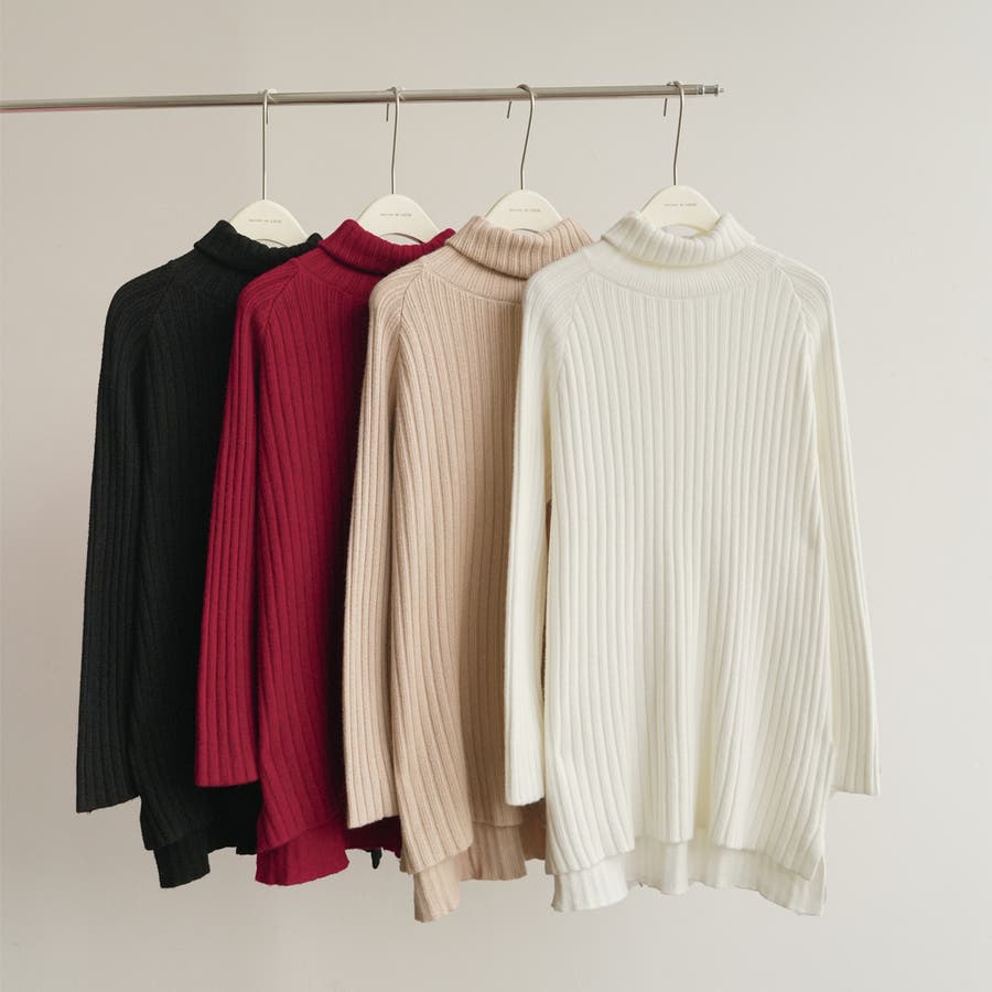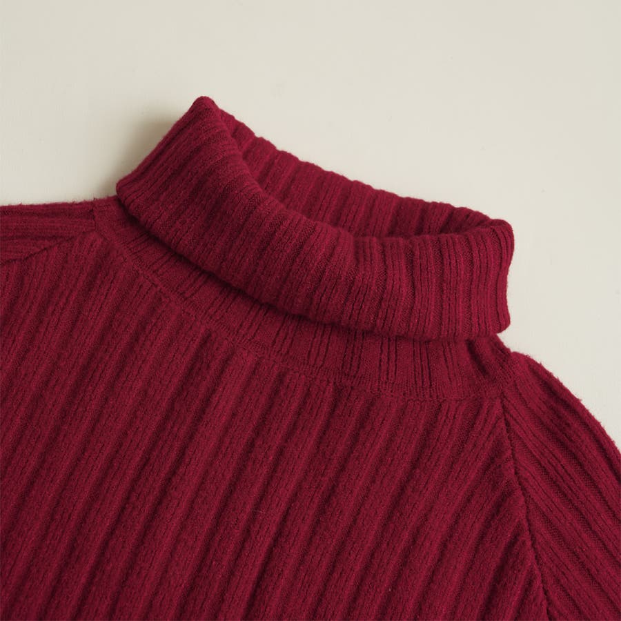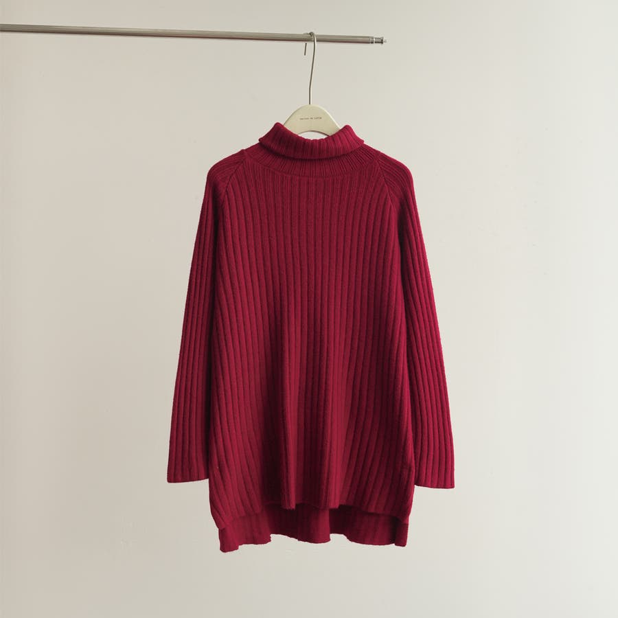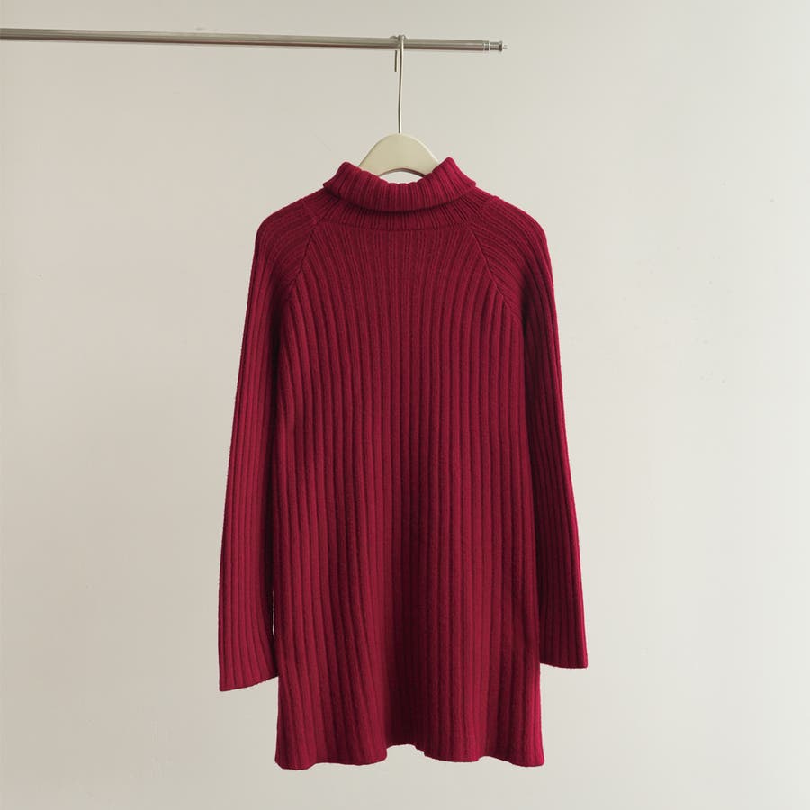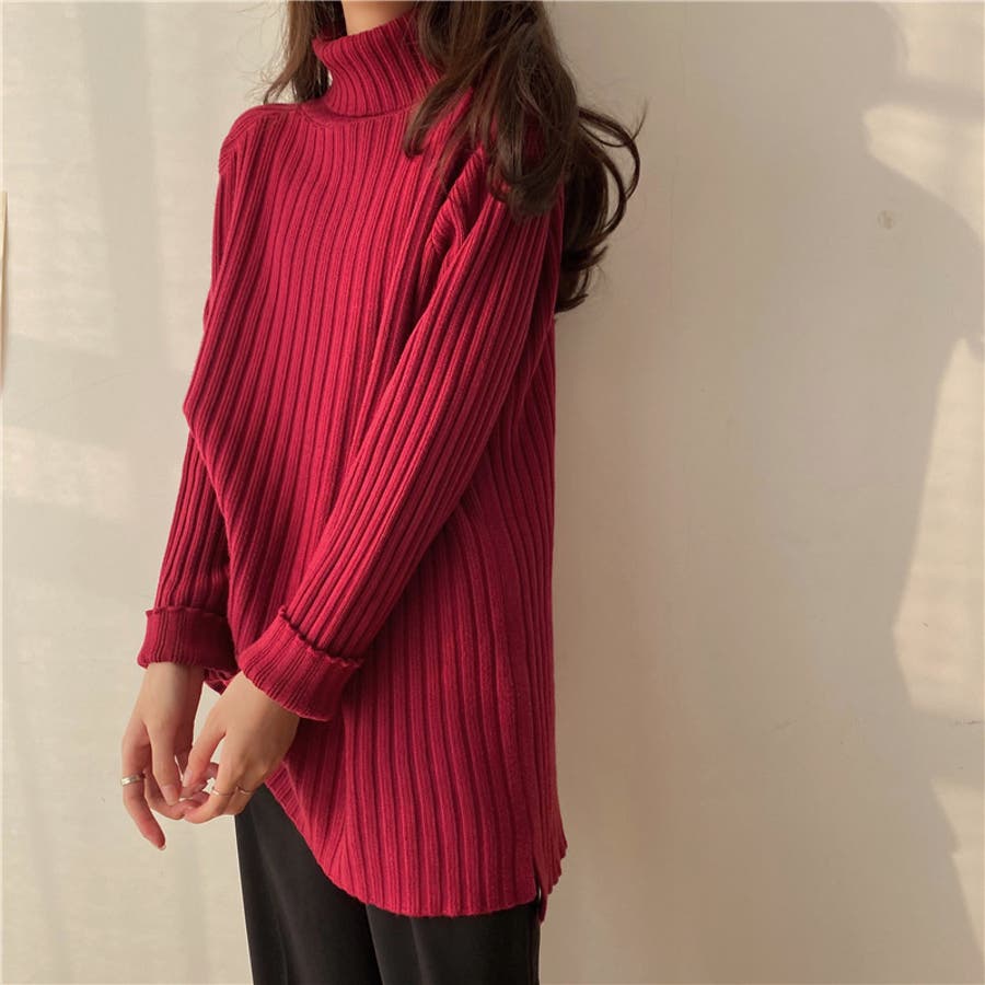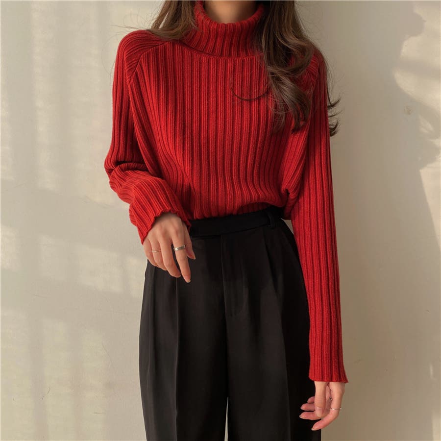 【レッド】優しい質感タートルネックで暖か美シルエットリブニット シンプル韓国ファッション