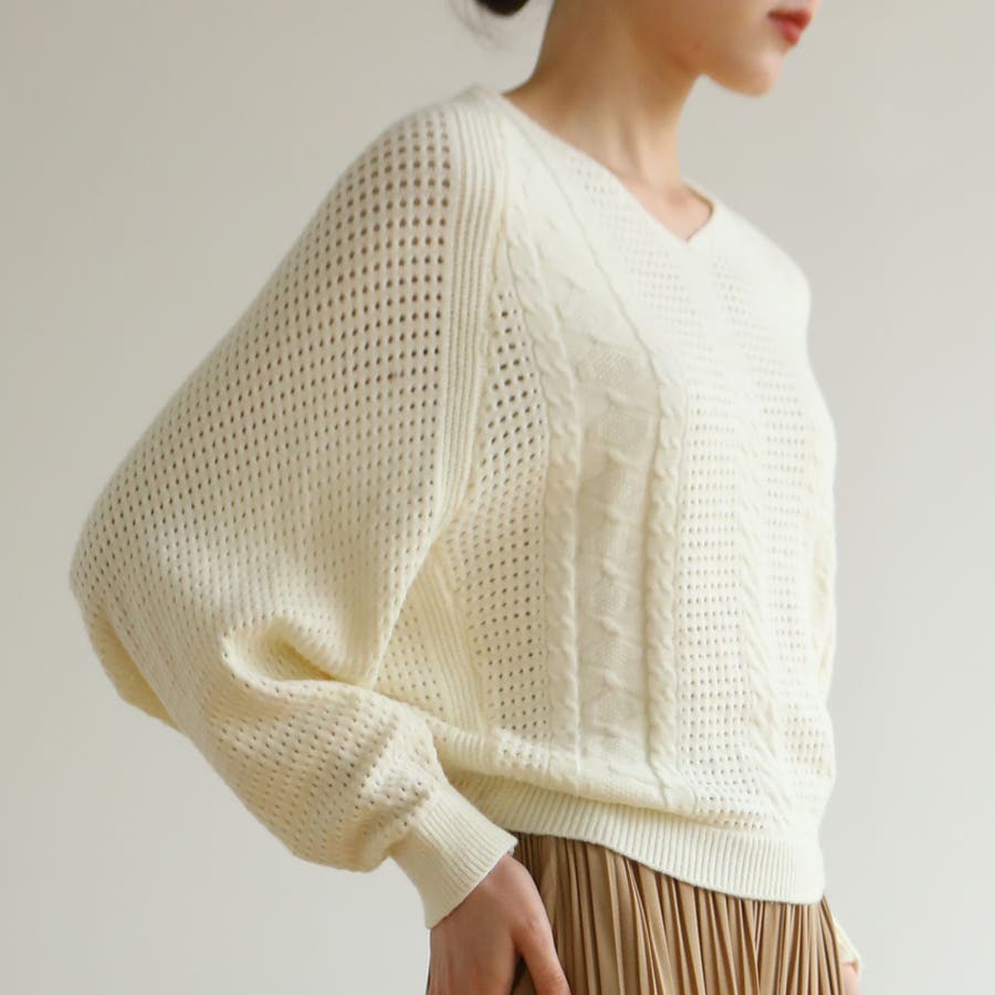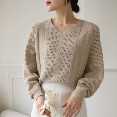 透かし編みデザインが大人可愛いVネックドルマンニット セーター トップス
