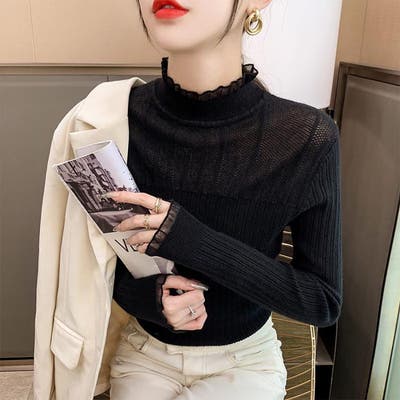 フリル使いがキュートでフェミニンなプチハイネックリブニット ニットプルオーバー