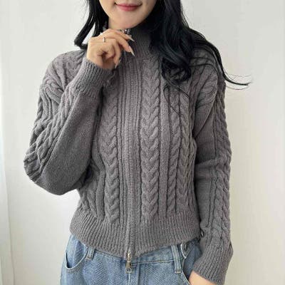 ダブルジップのショート丈ニット ケーブルニット ニット