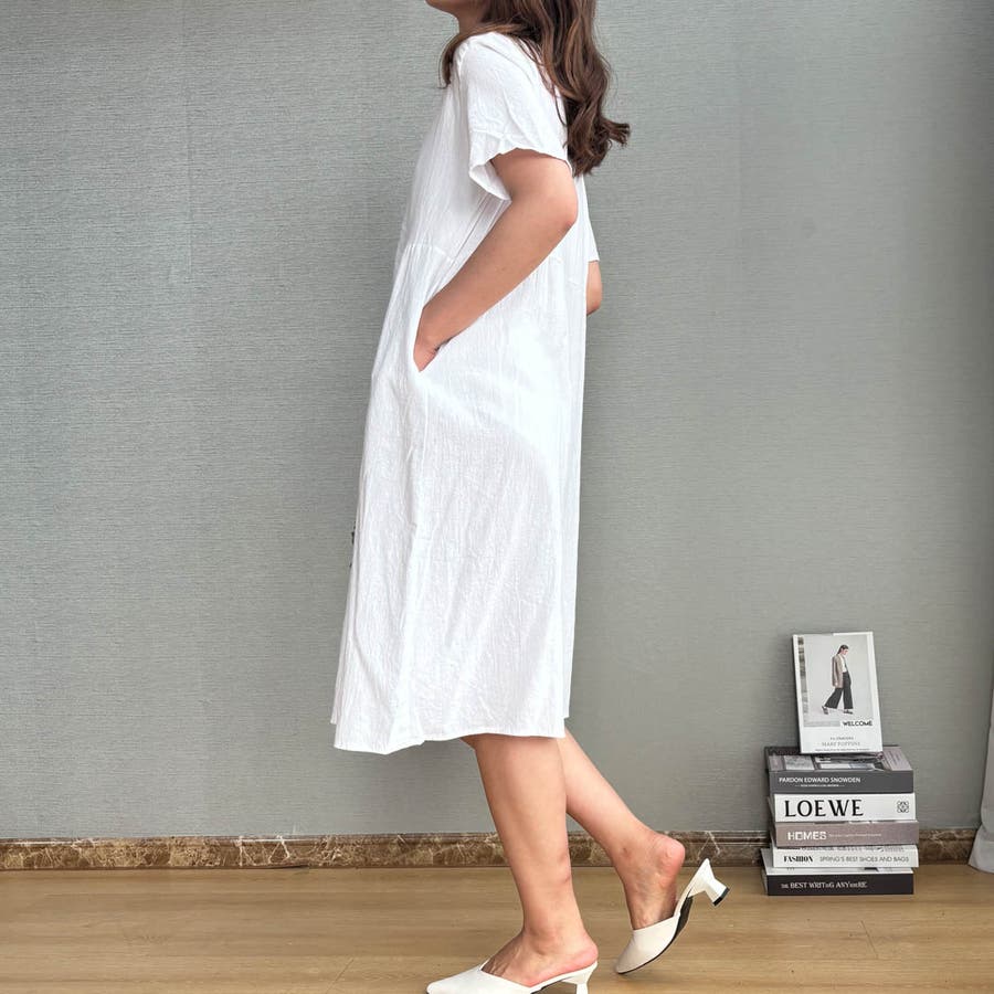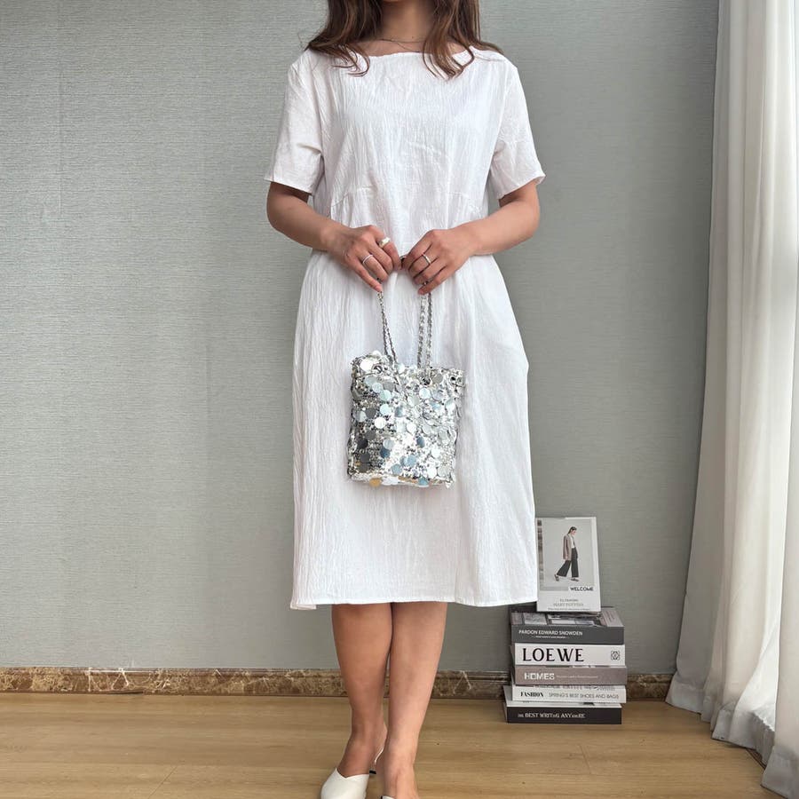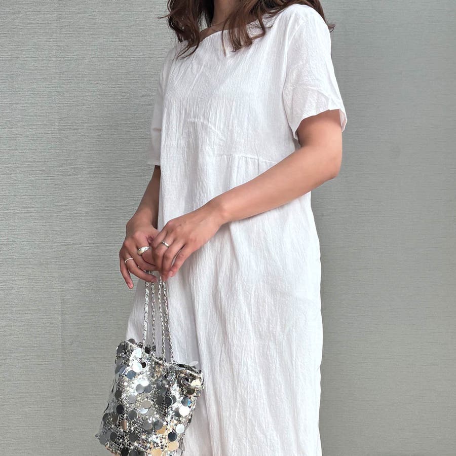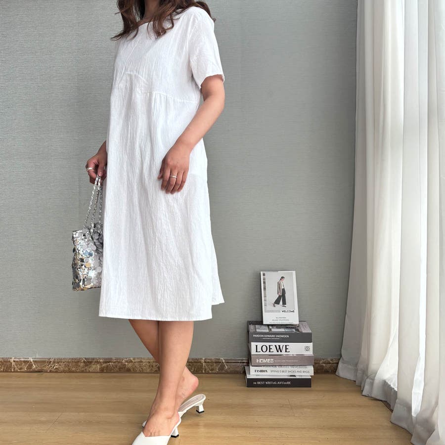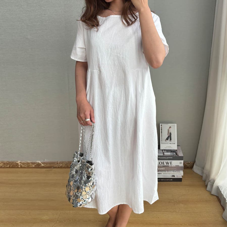 【ホワイト】ポケット付きミモレ丈麻素材サマーワンピース。1枚で華やかに仕上がるミモレ丈リネン…
