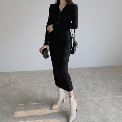 柔らかい風合いで心地よく綺麗にフィットするリブニットワンピース Vネック
