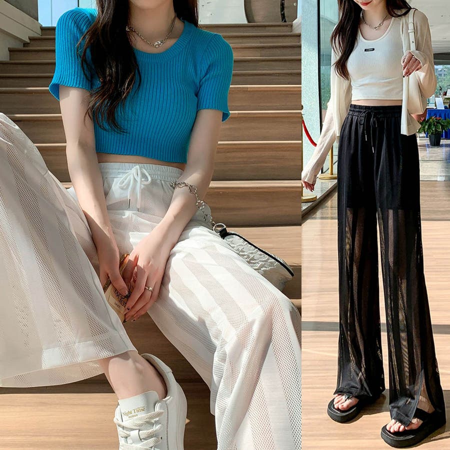 涼し気な素材が春らしい縦ストライプシースルーロングパンツ カジュアル ゆったり