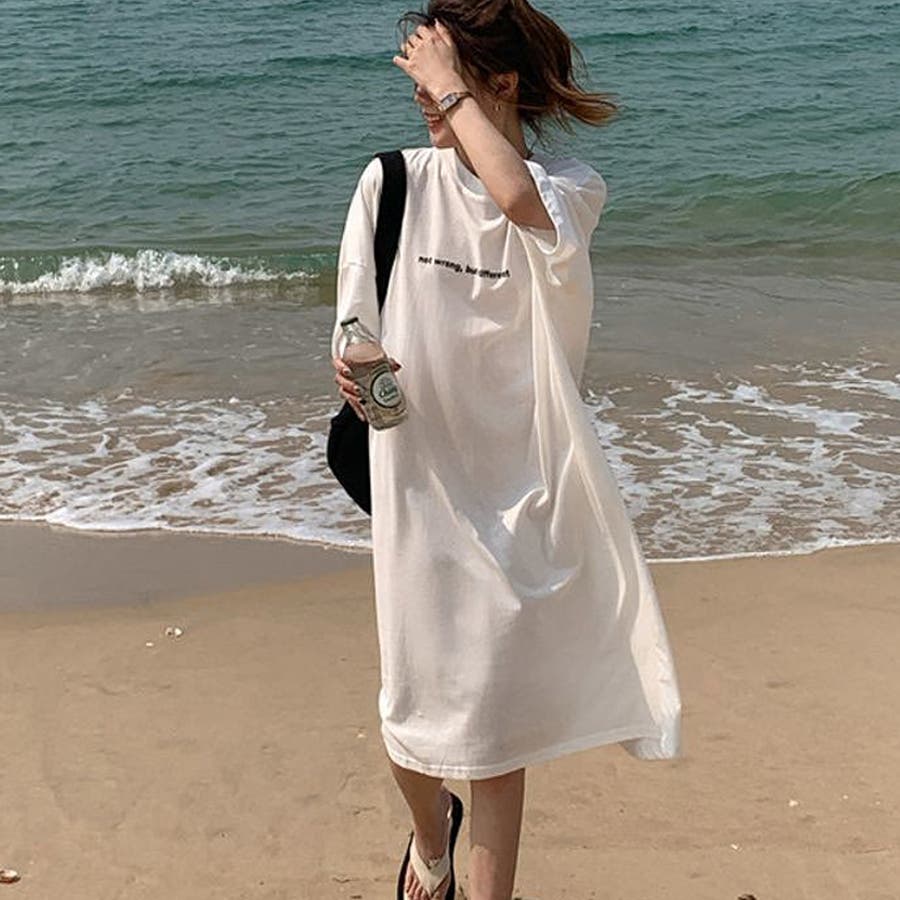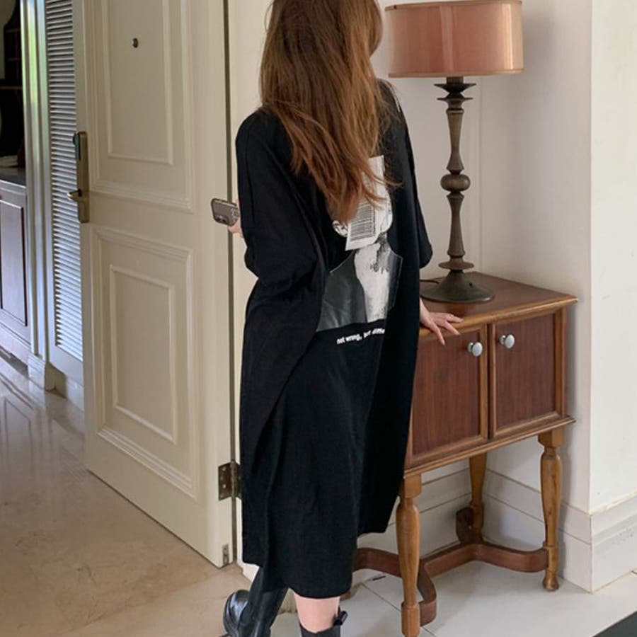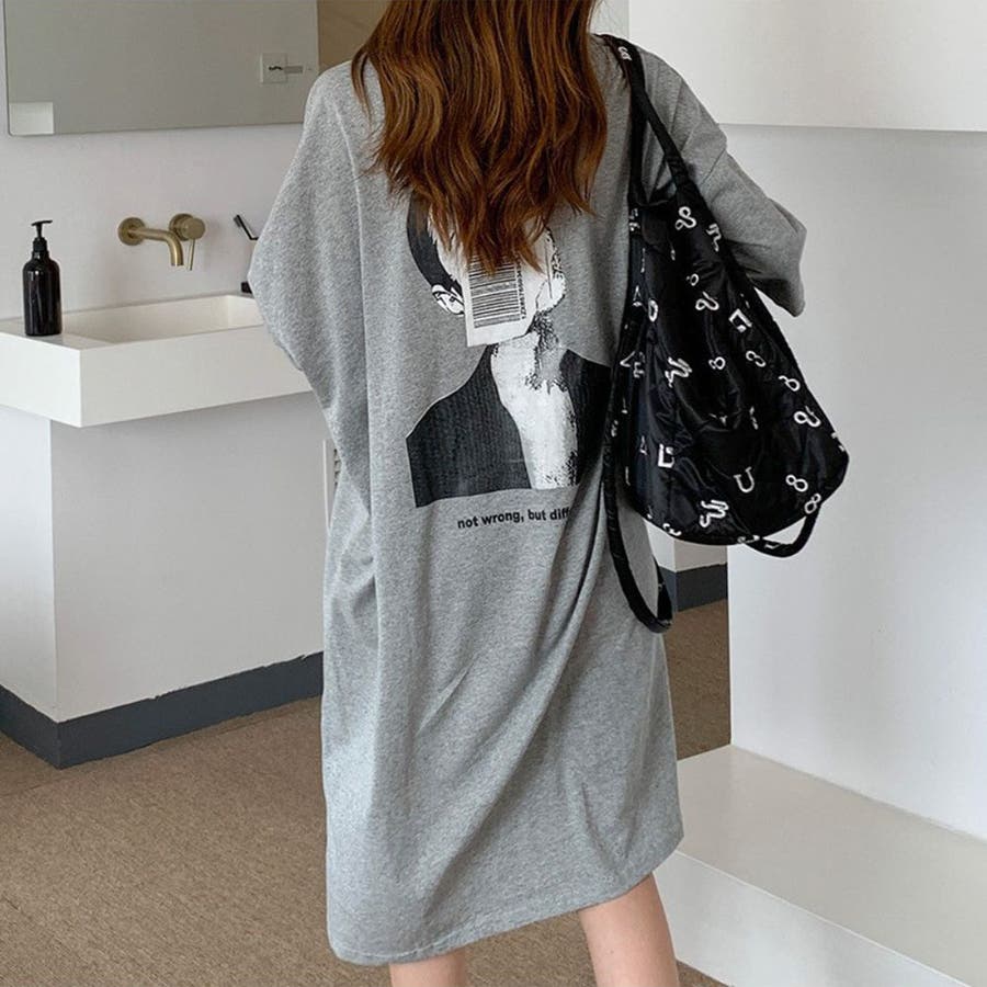 バックプリントがアクセントのロング丈Tシャツワンピース ルーズ 五分袖