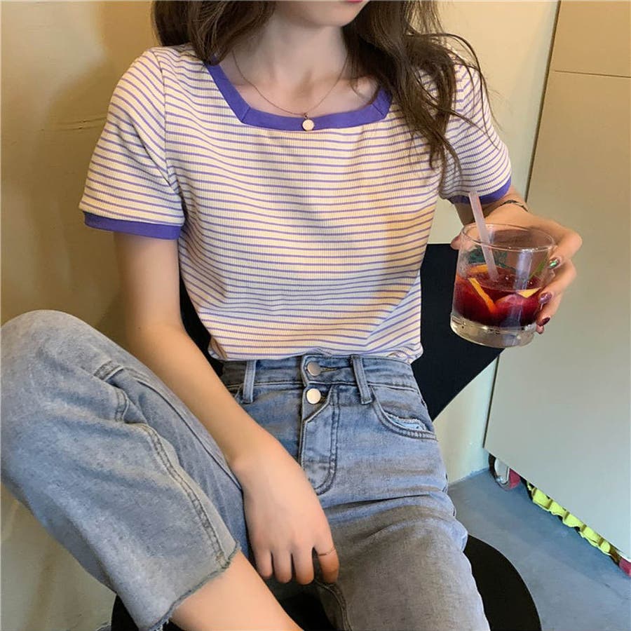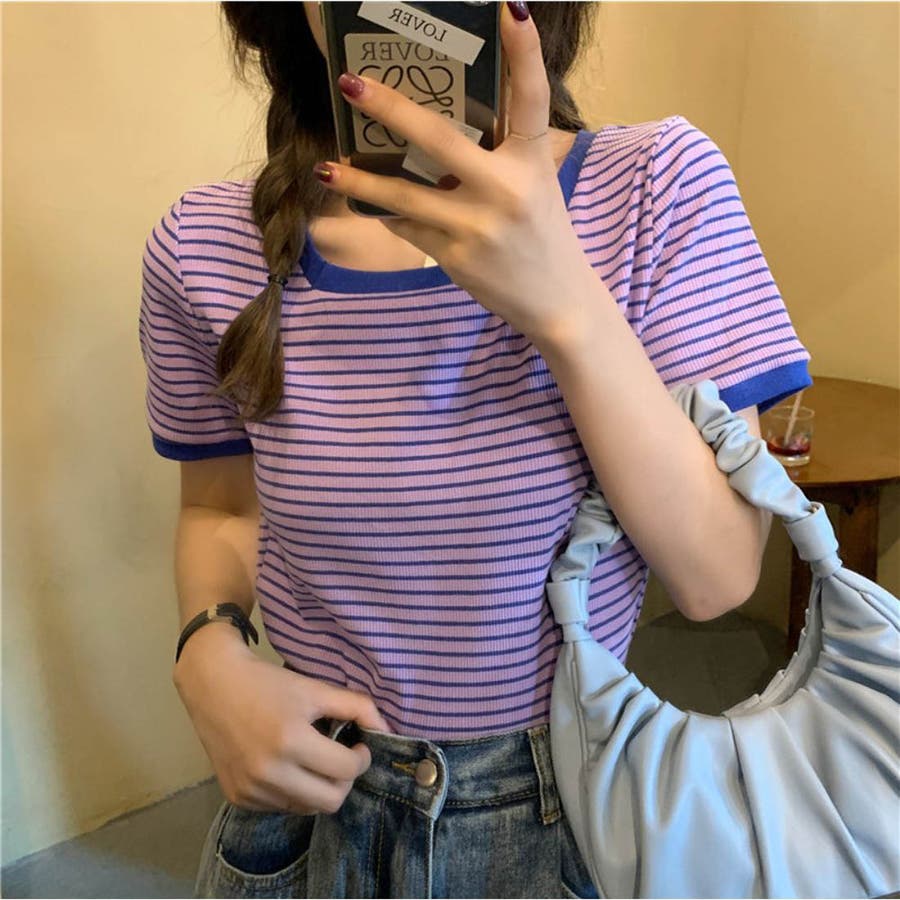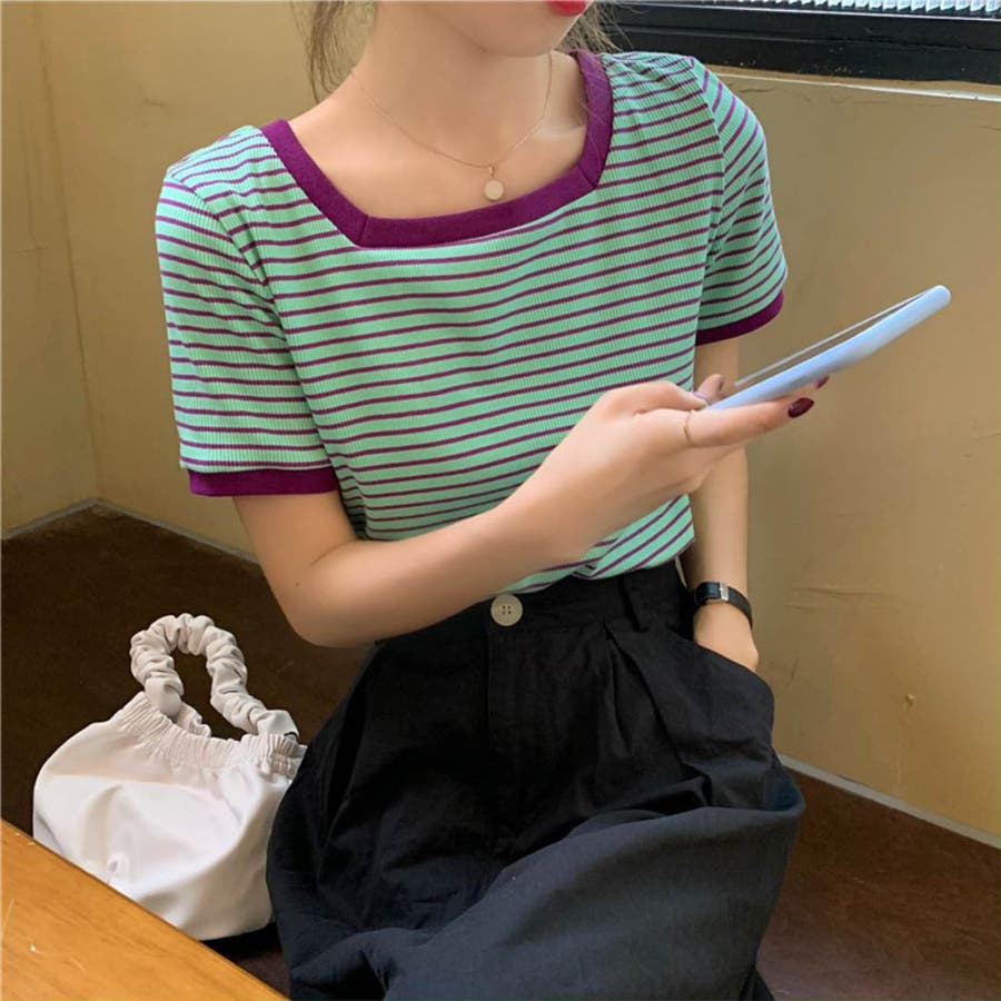 スクエアネックがオシャレなストライプ柄半袖ニット ショート丈 カジュアル