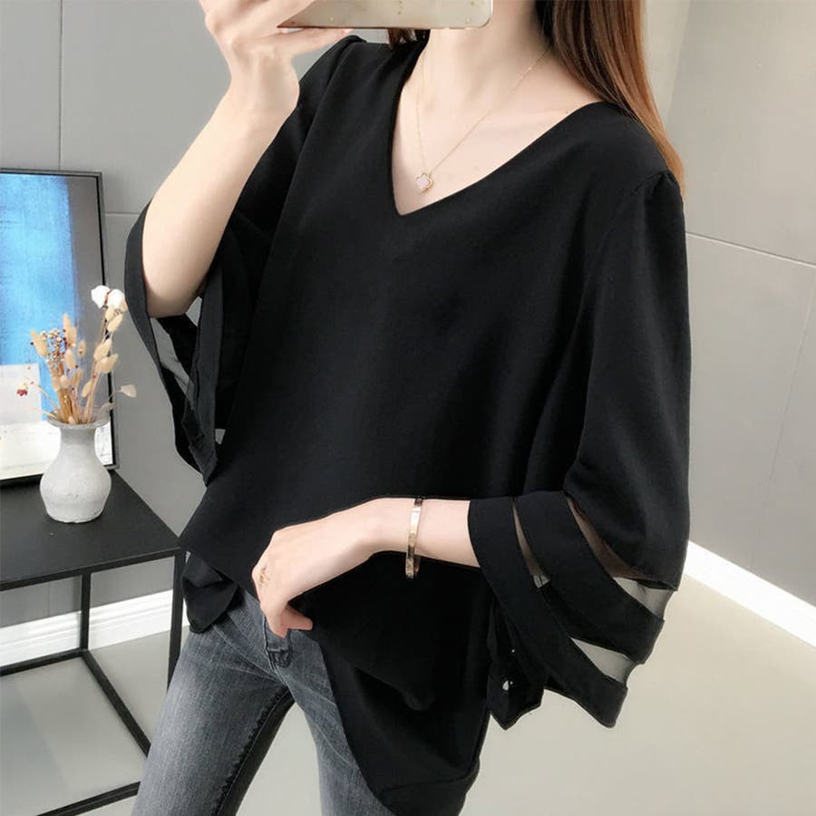 商品説明 | 顔周りをすっきりと見せるVネックブラウスが登場! シアー素材の切り替えで7分袖でも涼し気な印象を与えてくれます。 全体的にゆったりとしており、気になるボディラインもしっかりカバー◎ シンプルなデザインと艶やかな素材で通勤などきれいめコーデにもおすすめですよ♪ |