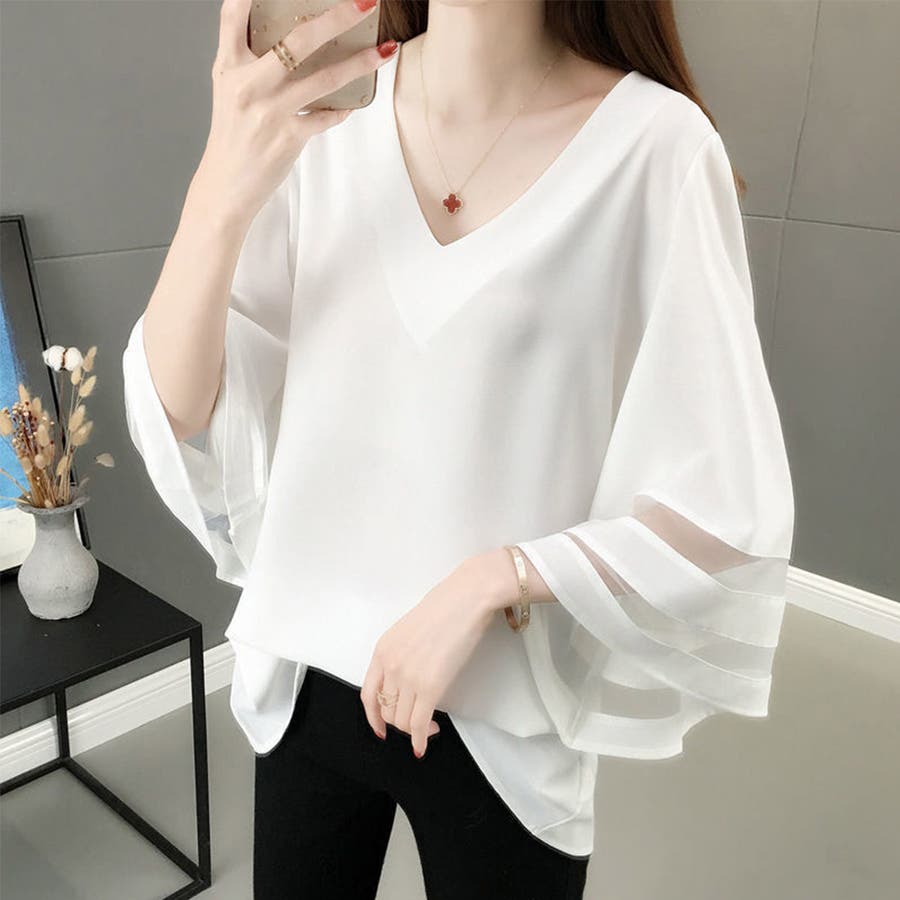 スマートなきれいめコーデに大活躍!シアー切り替え7分袖Vネックブラウス