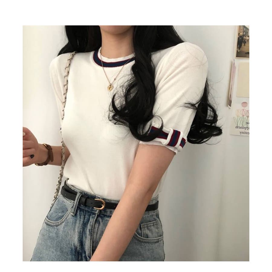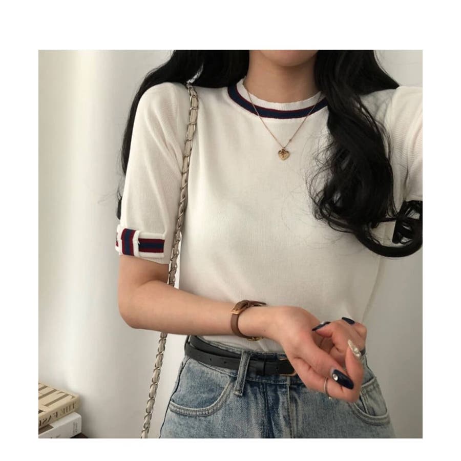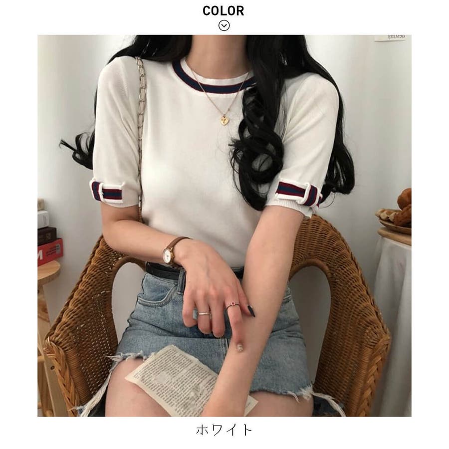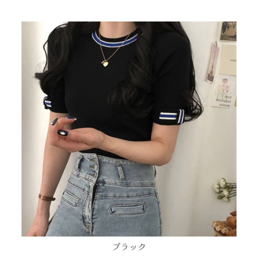 フレンチなデザインが可愛いリボンデザインリブ半袖トップス 半袖 ニット