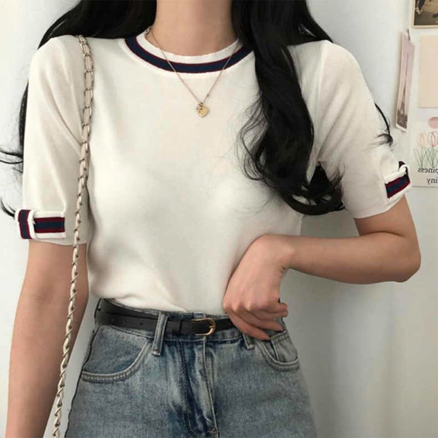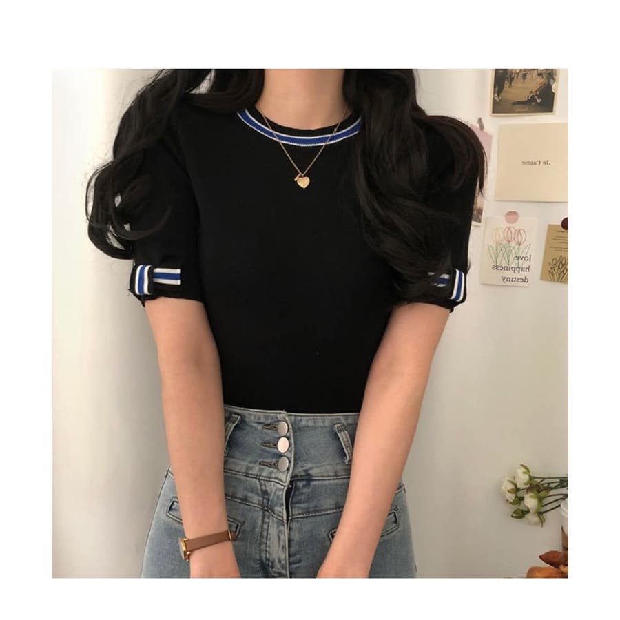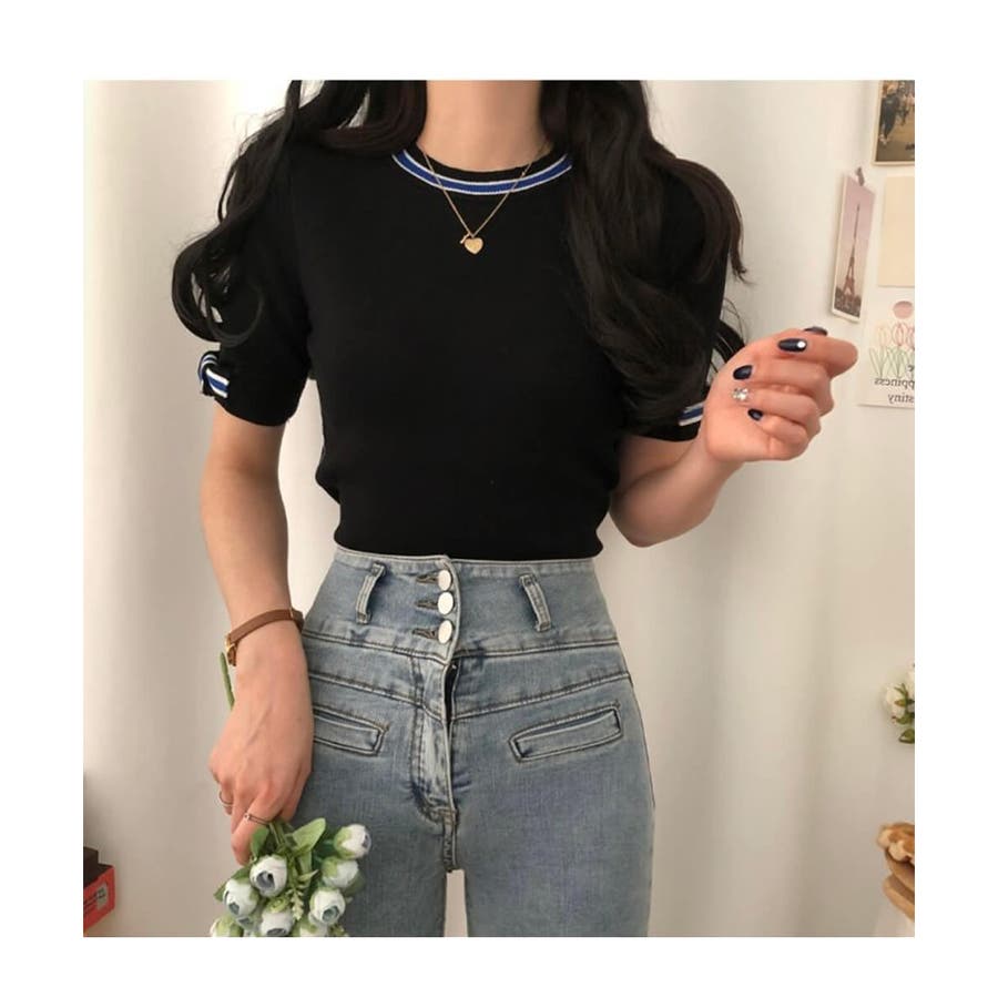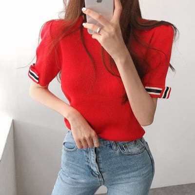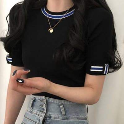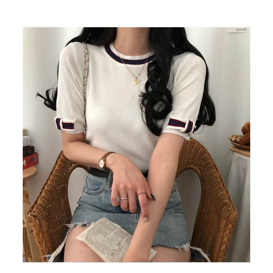 フレンチなデザインが可愛いリボンデザインリブ半袖トップス 半袖 ニット