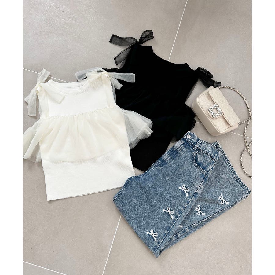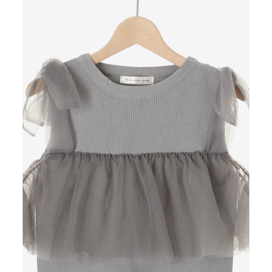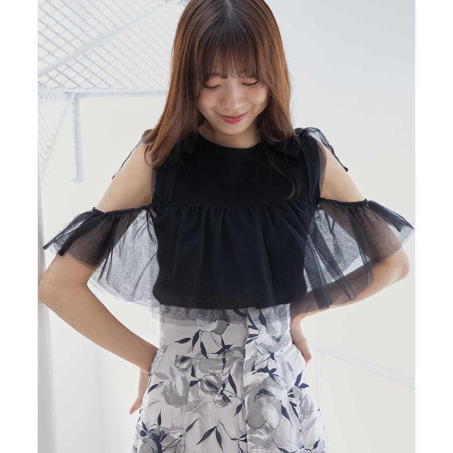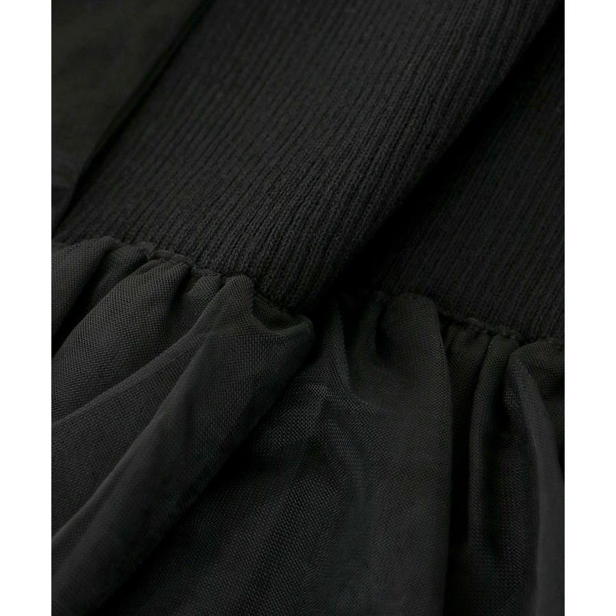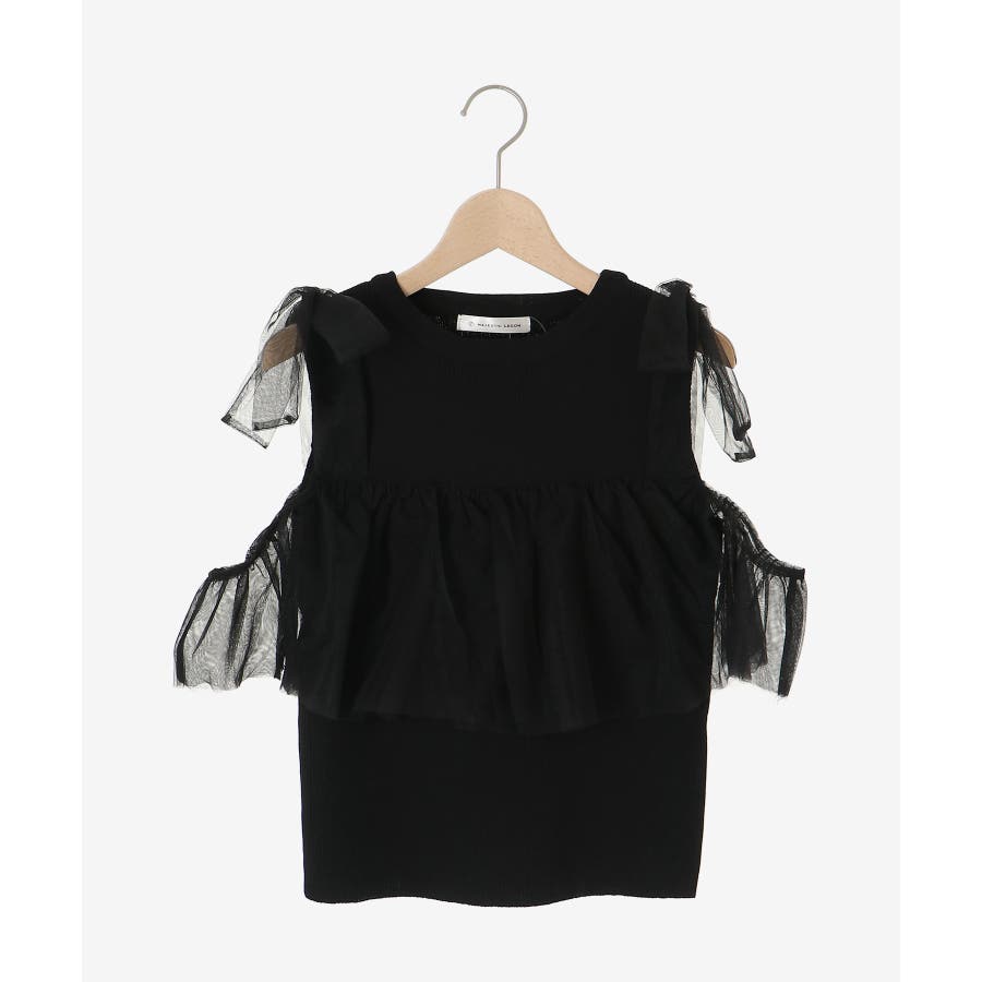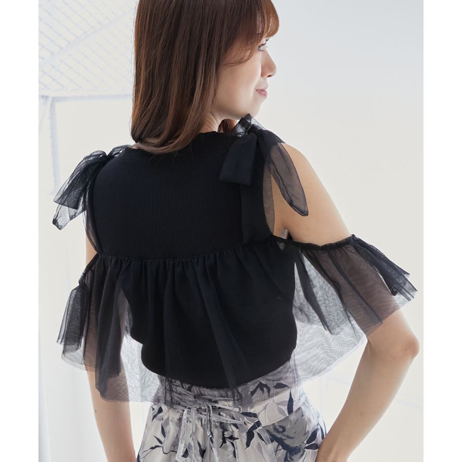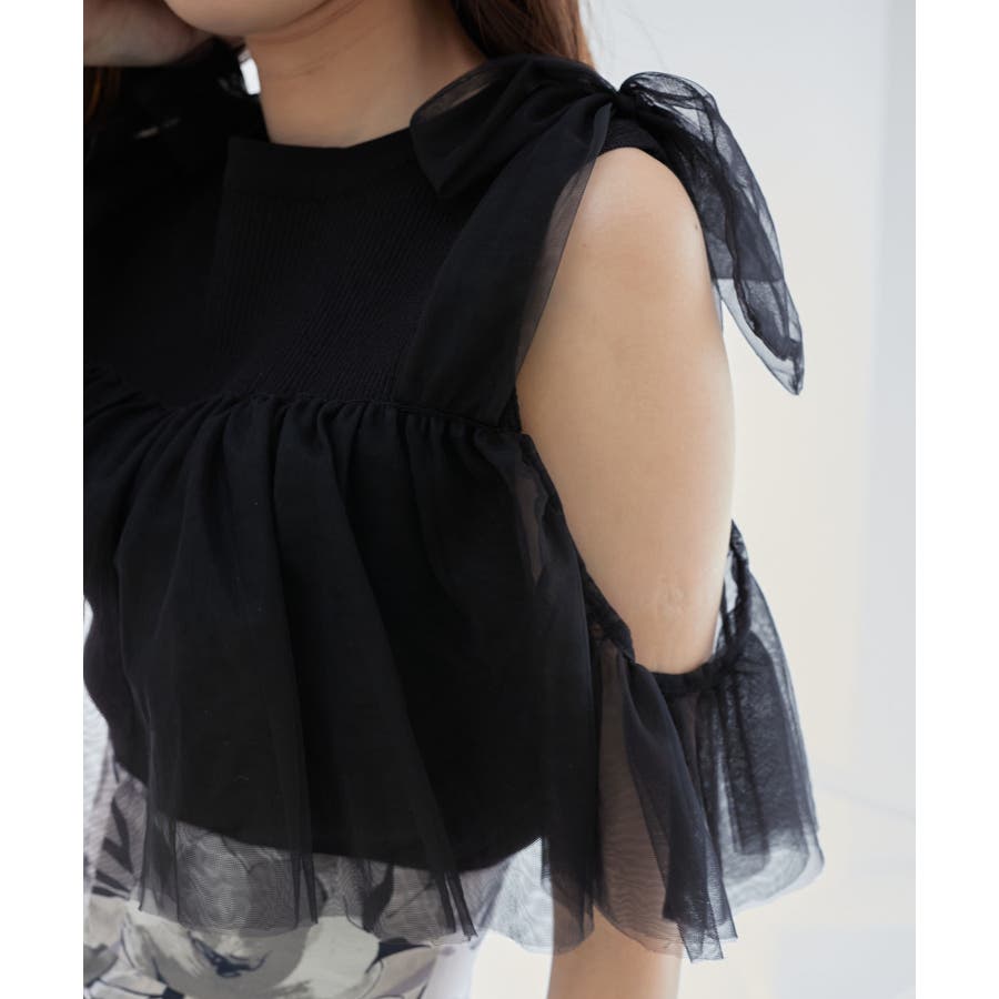 【ブラック】肩リボンチュールフリルニット