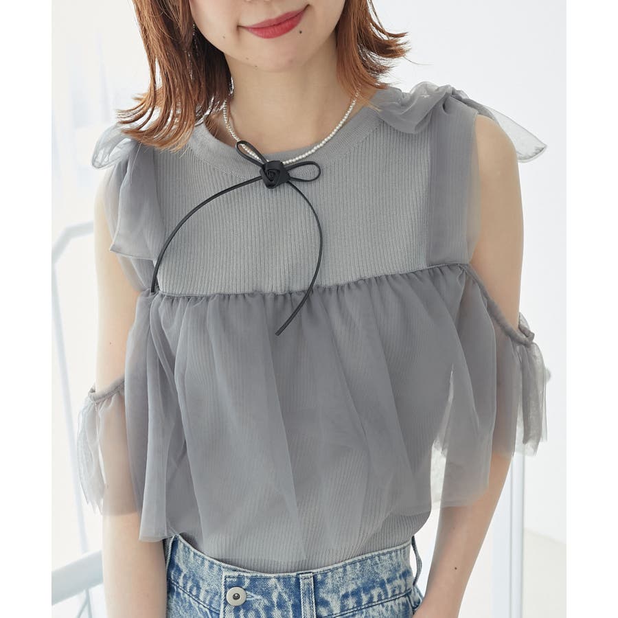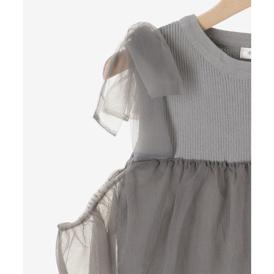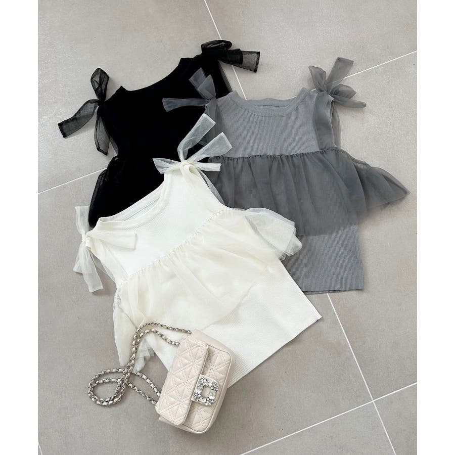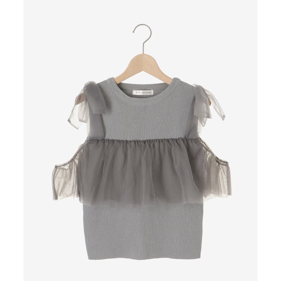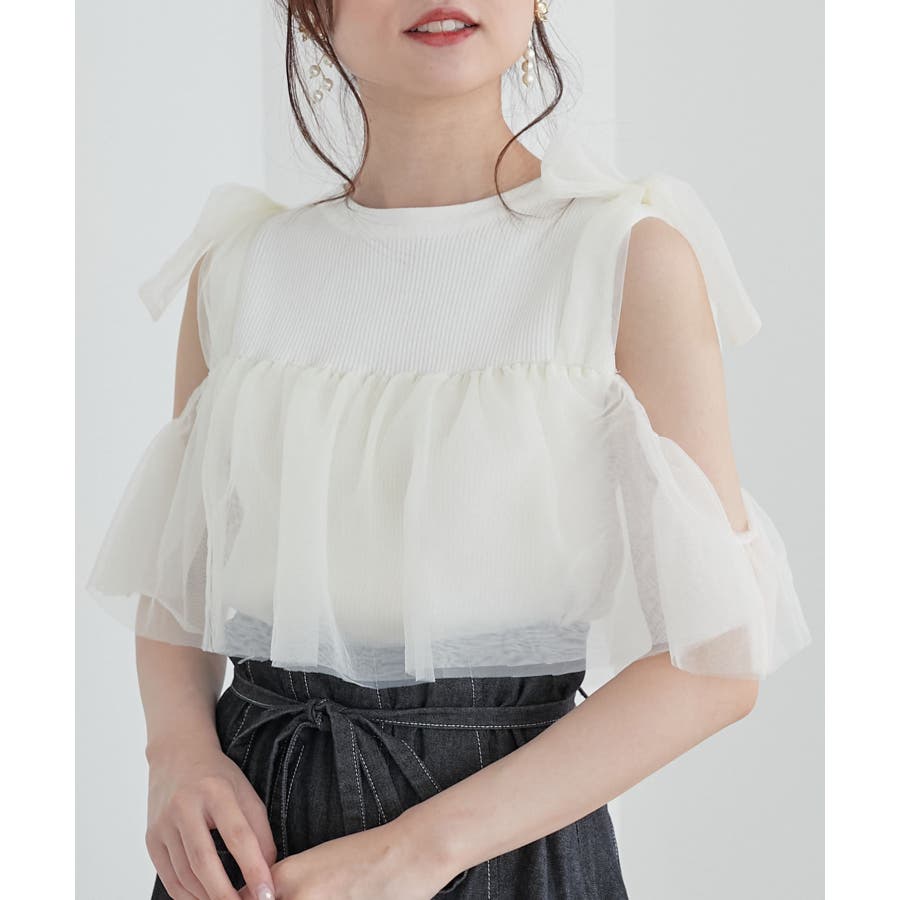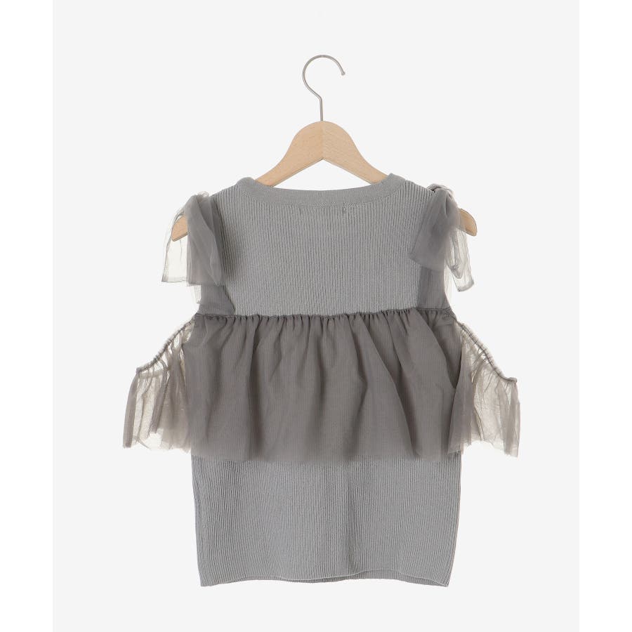 【ブラック】肩リボンチュールフリルニット