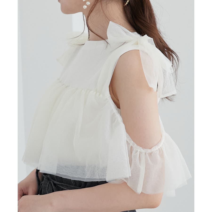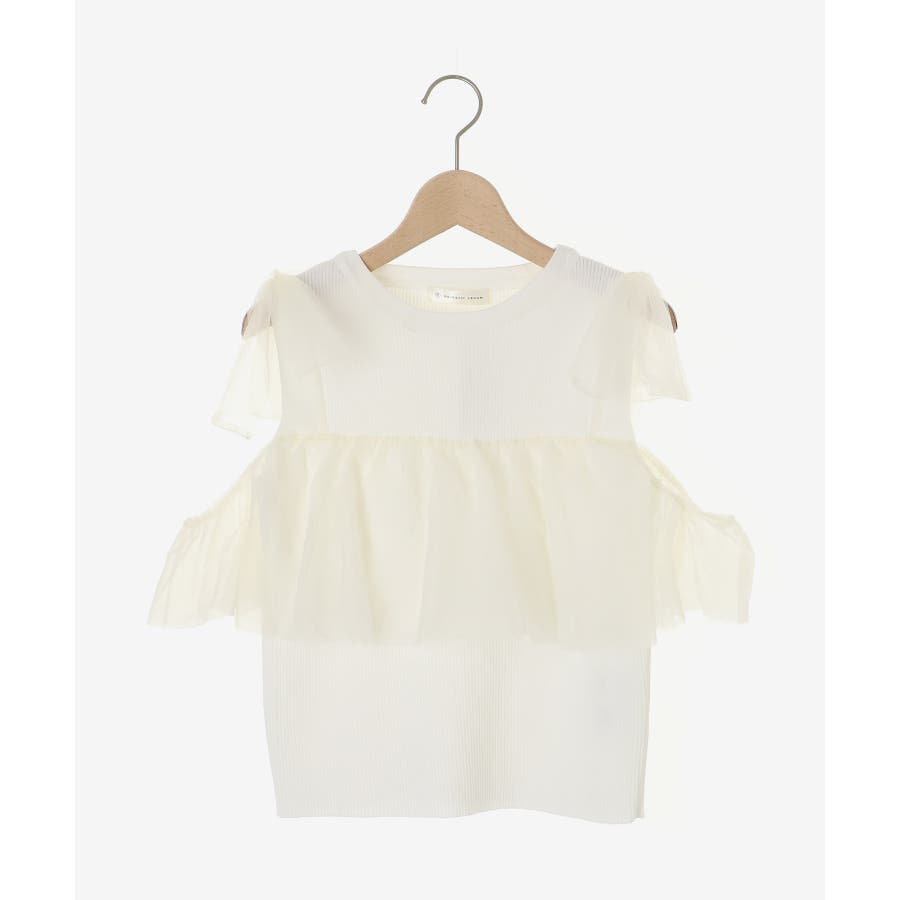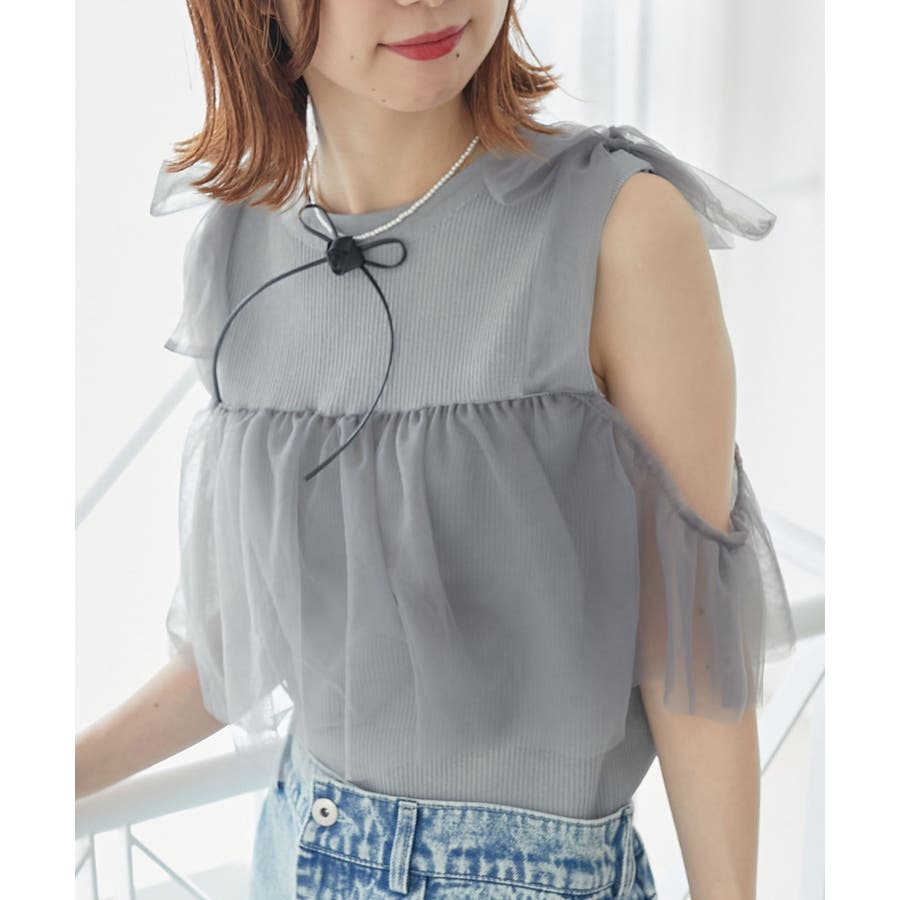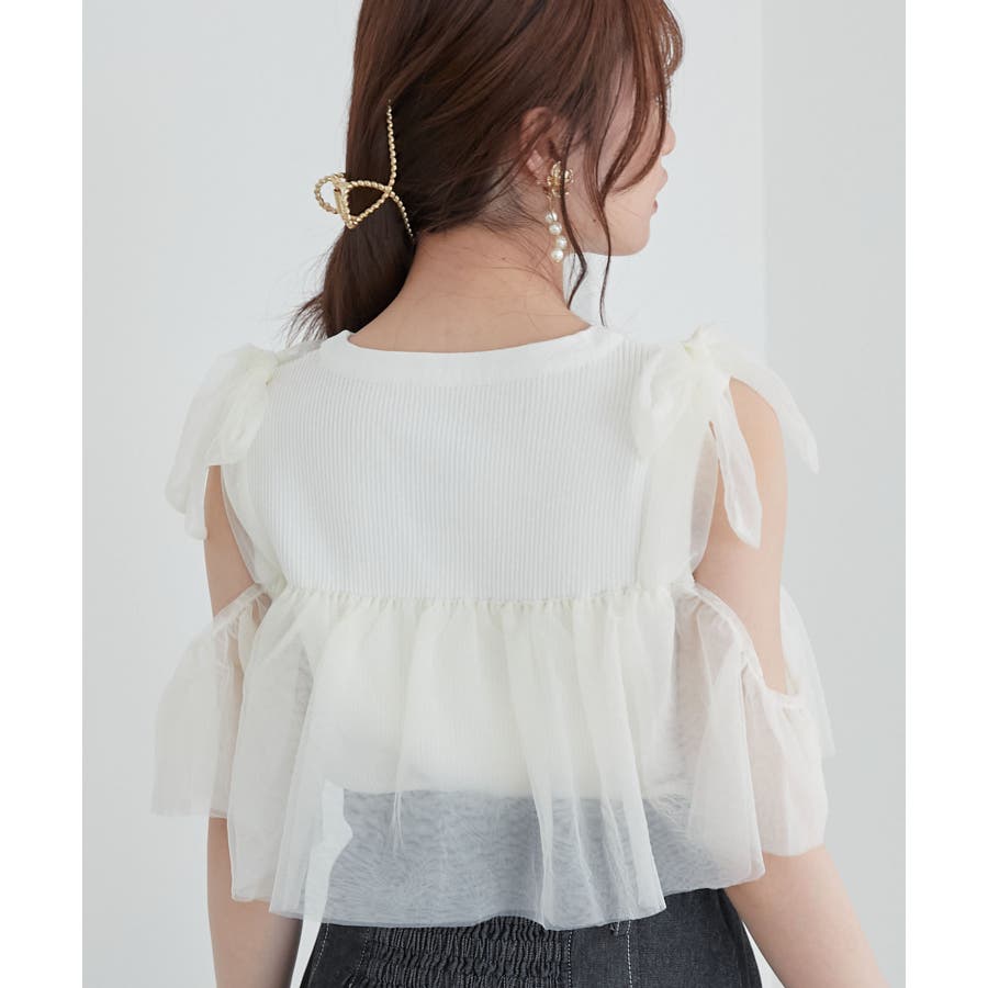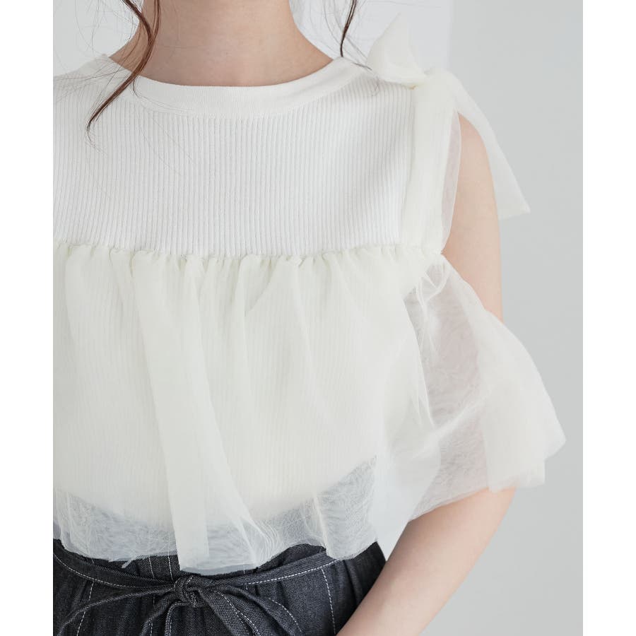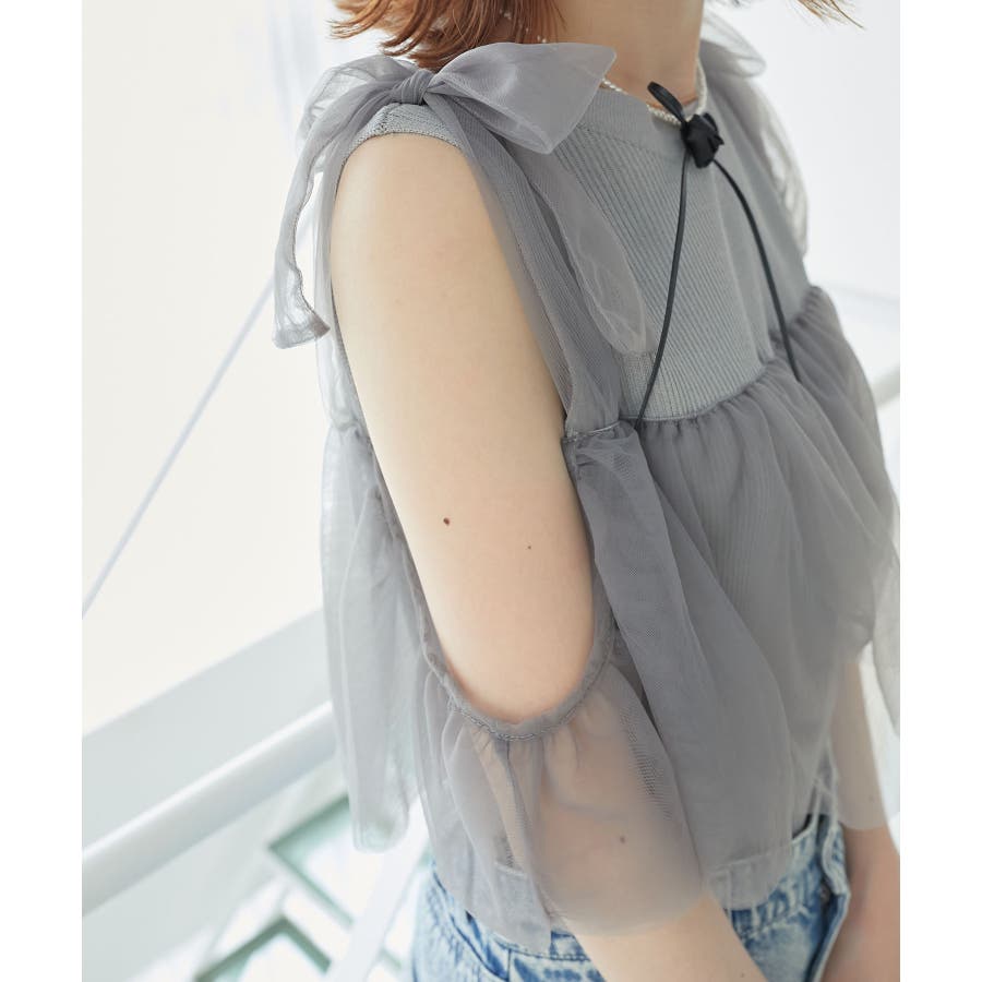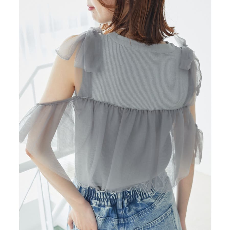 【ブラック】肩リボンチュールフリルニット