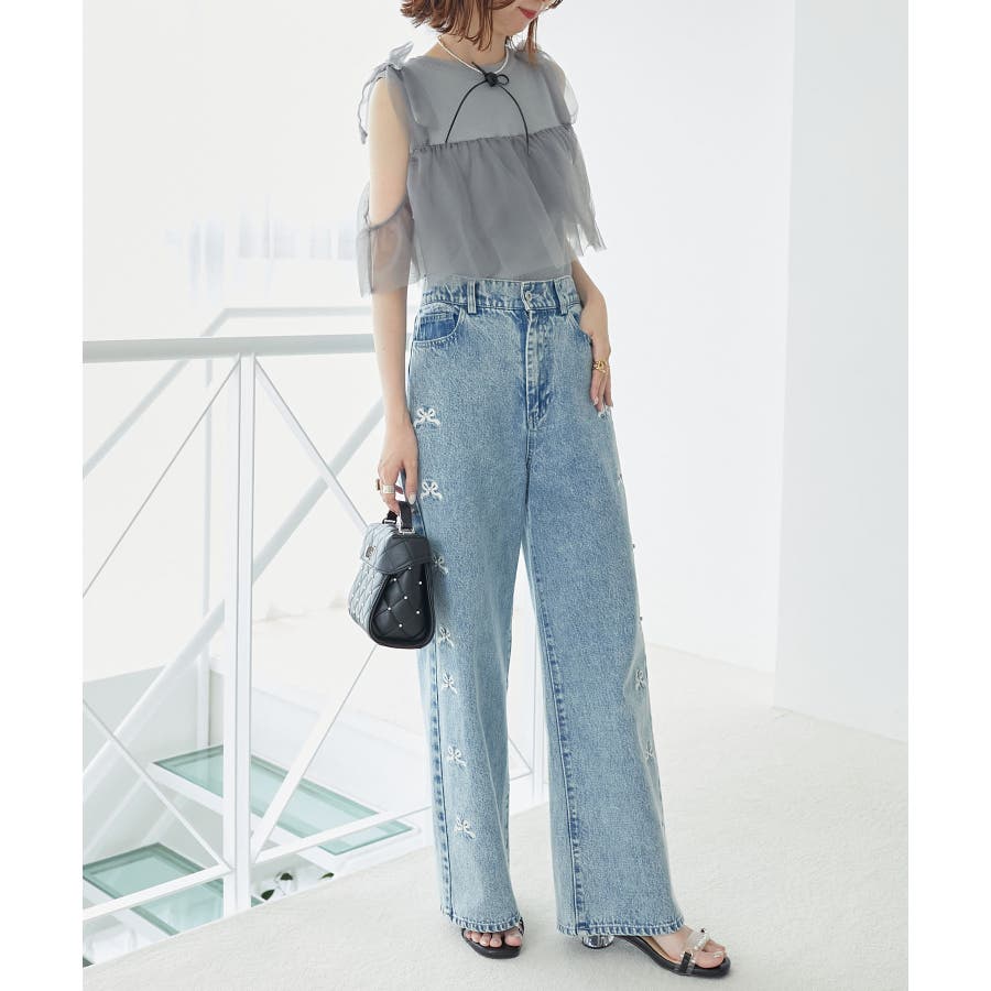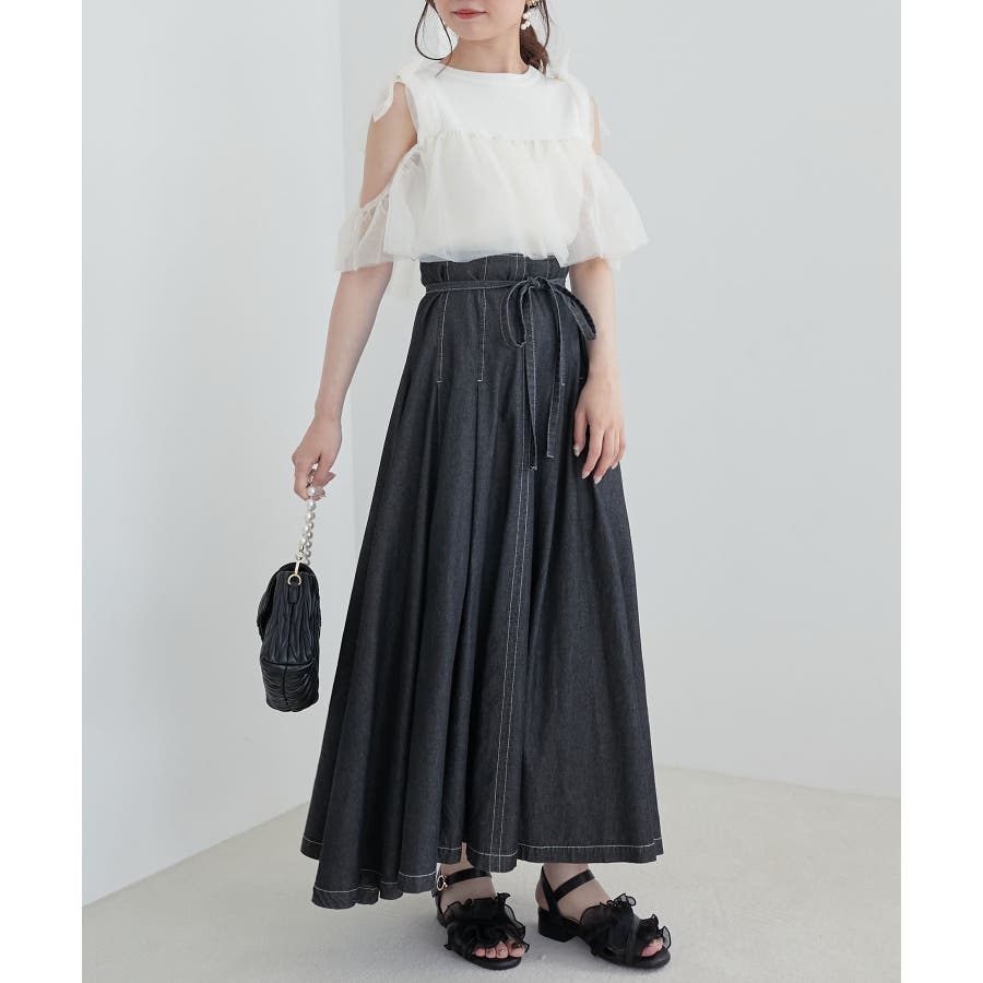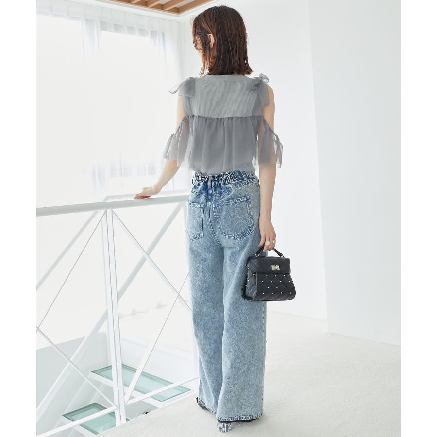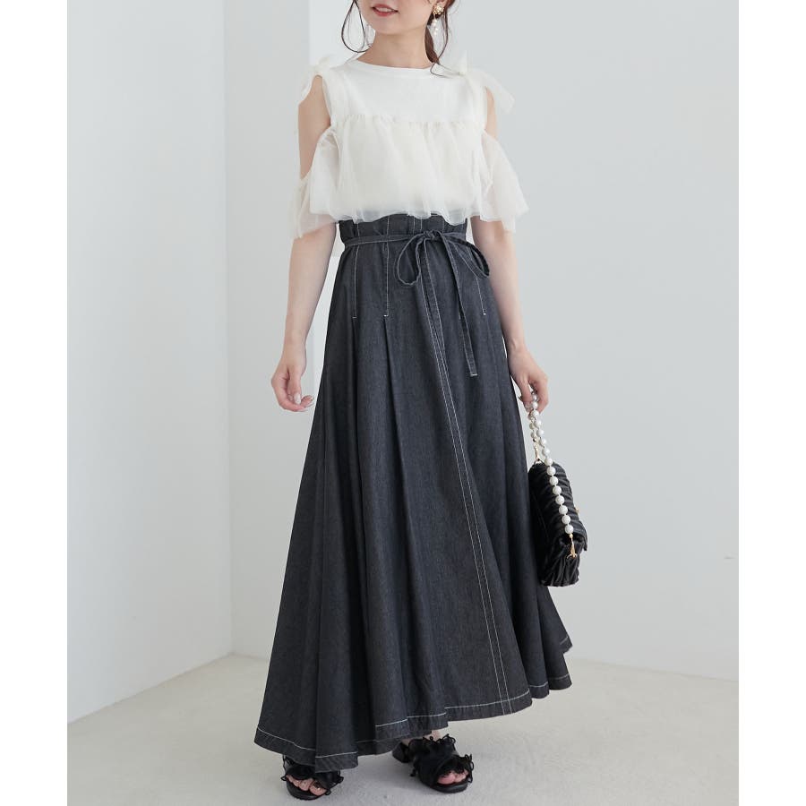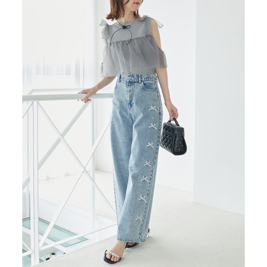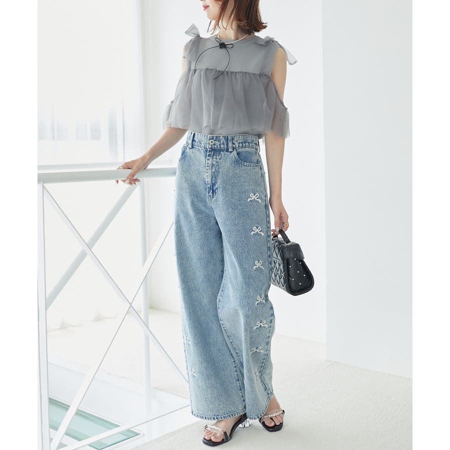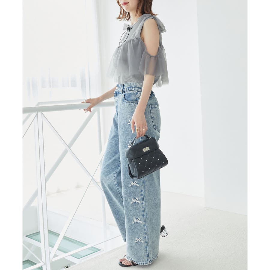【ブラック】肩リボンチュールフリルニット