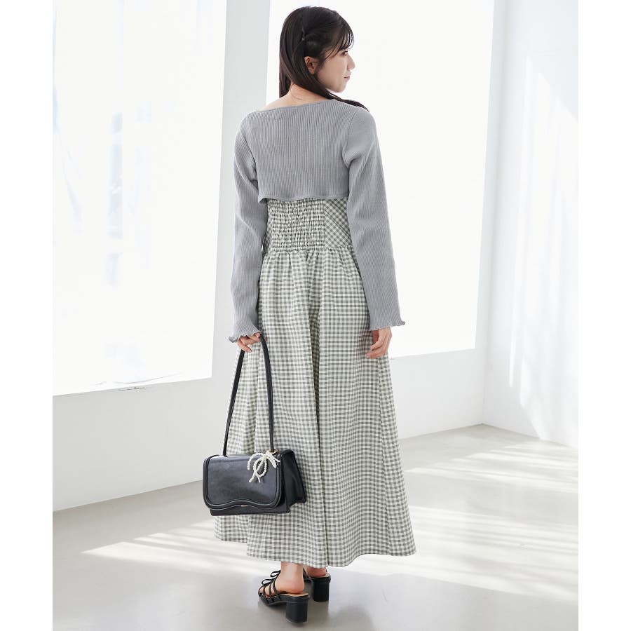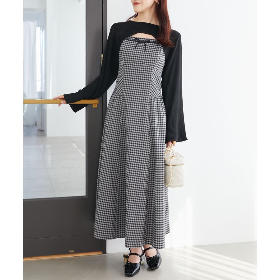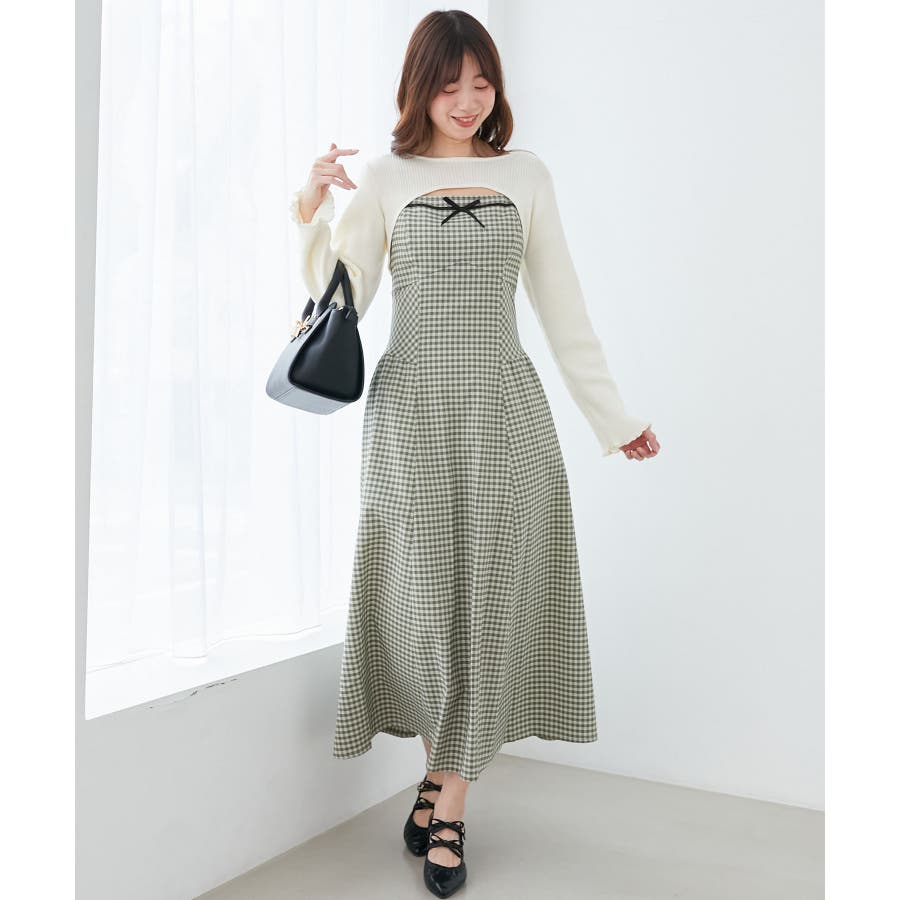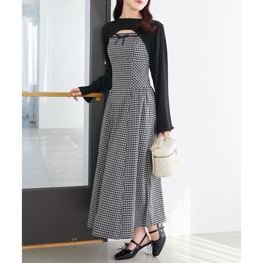 リブニット×デコルテオープンワンピ