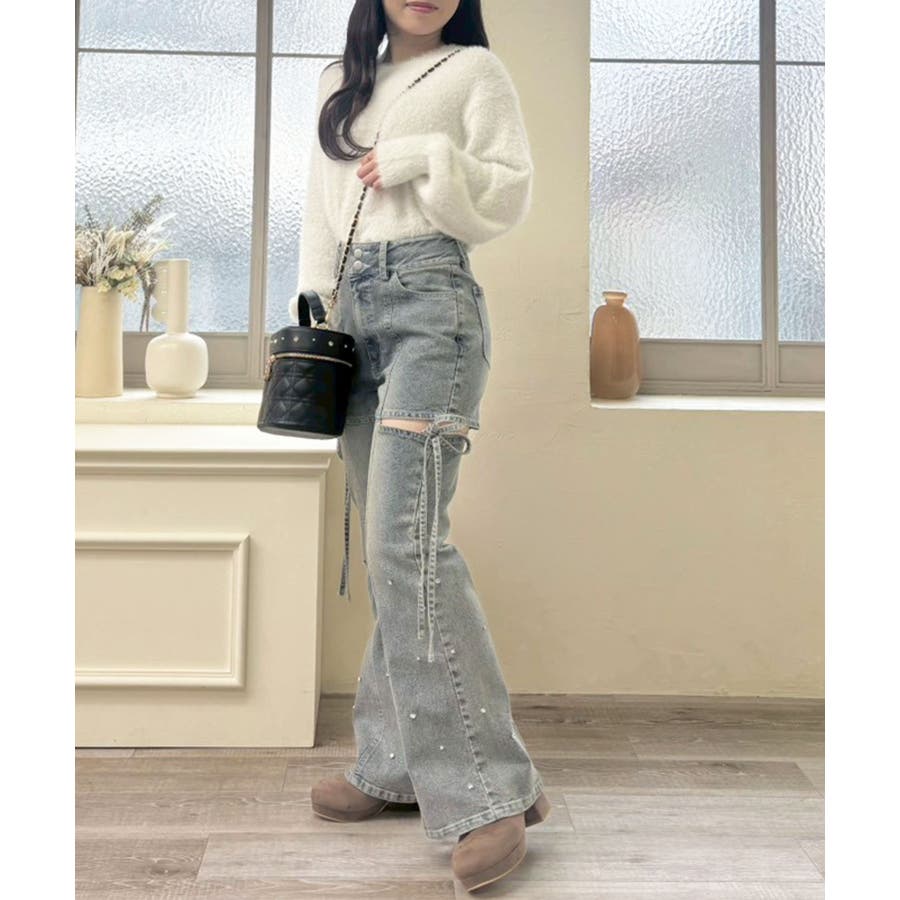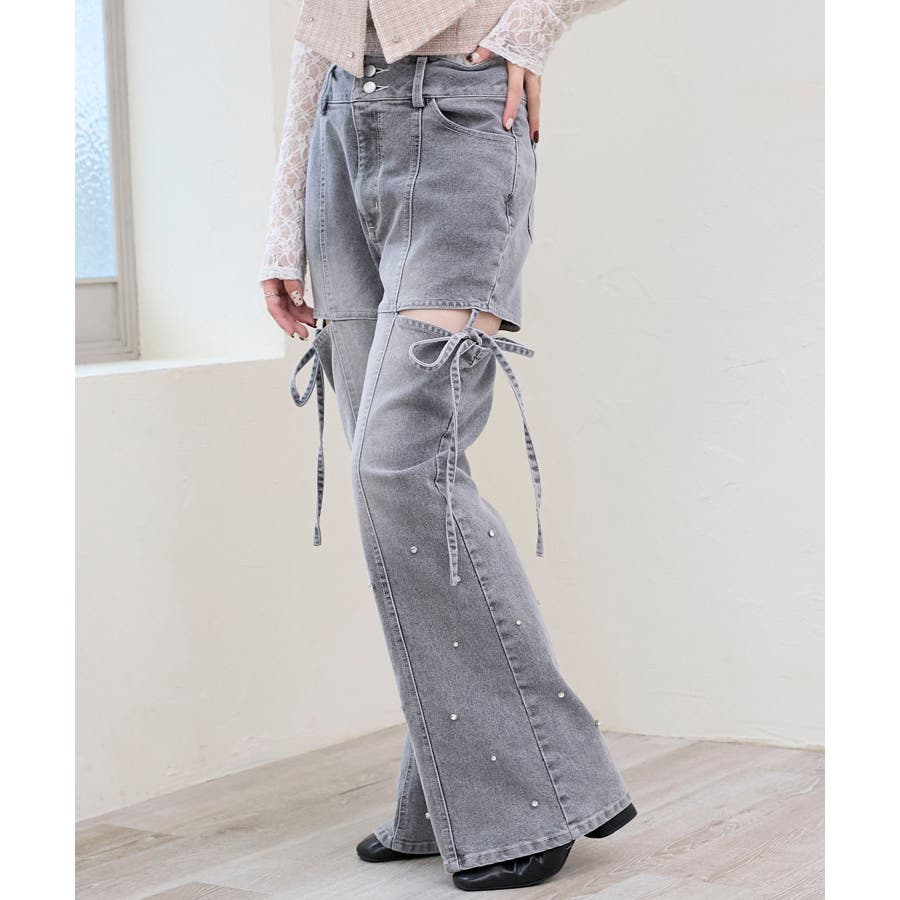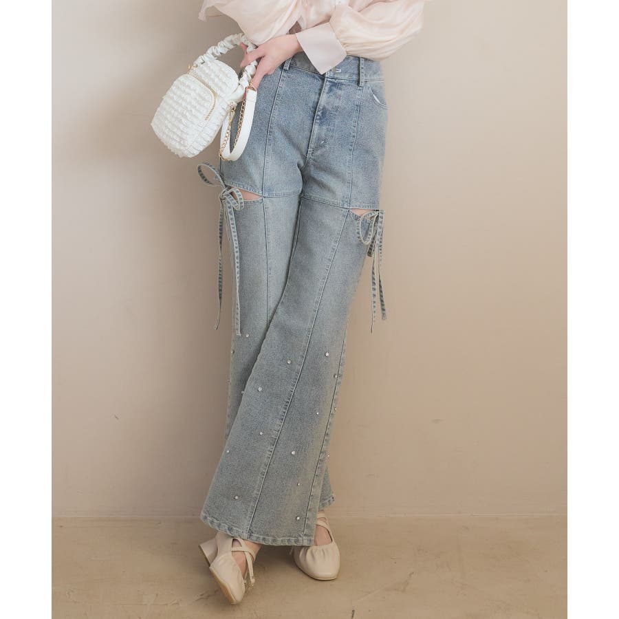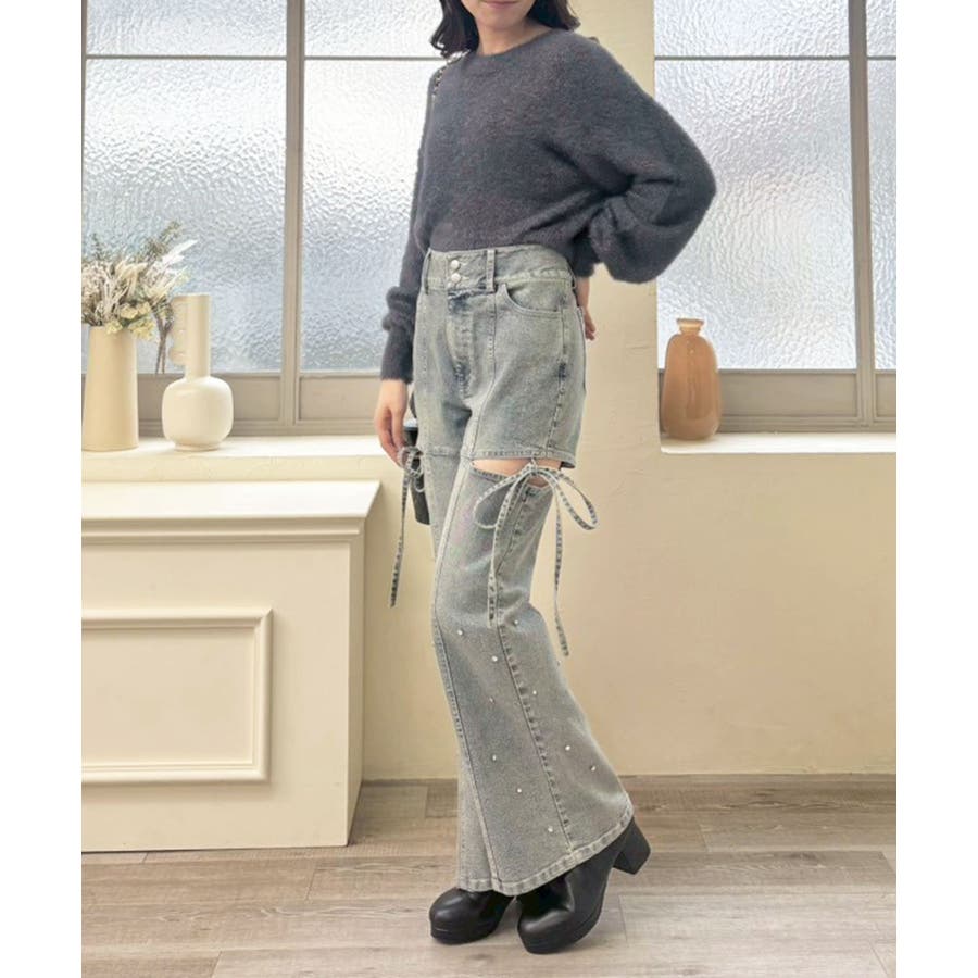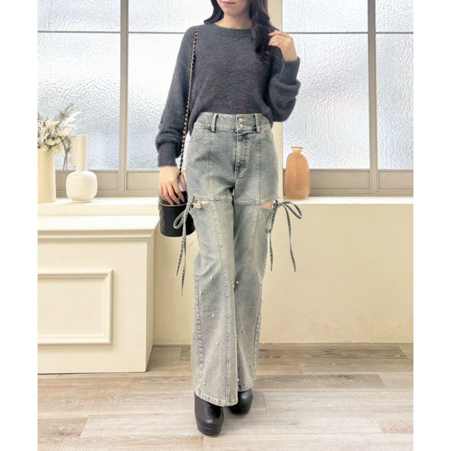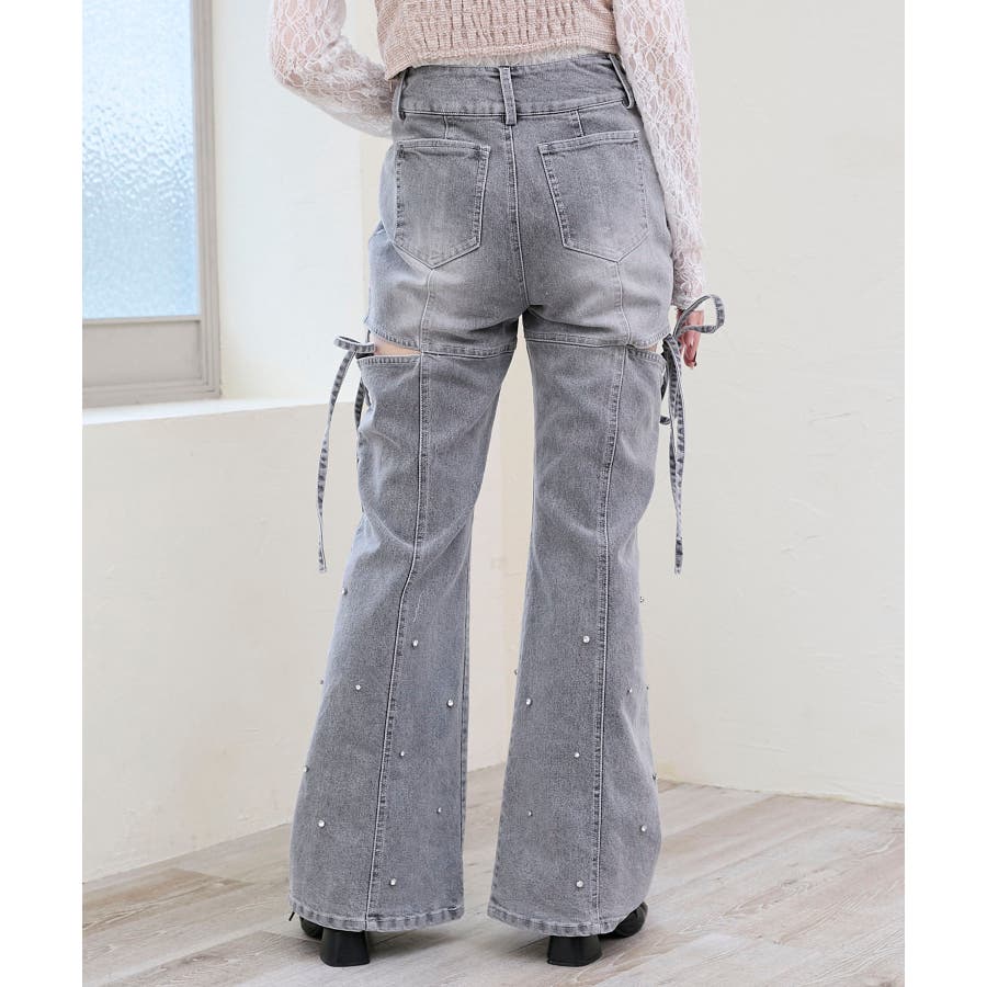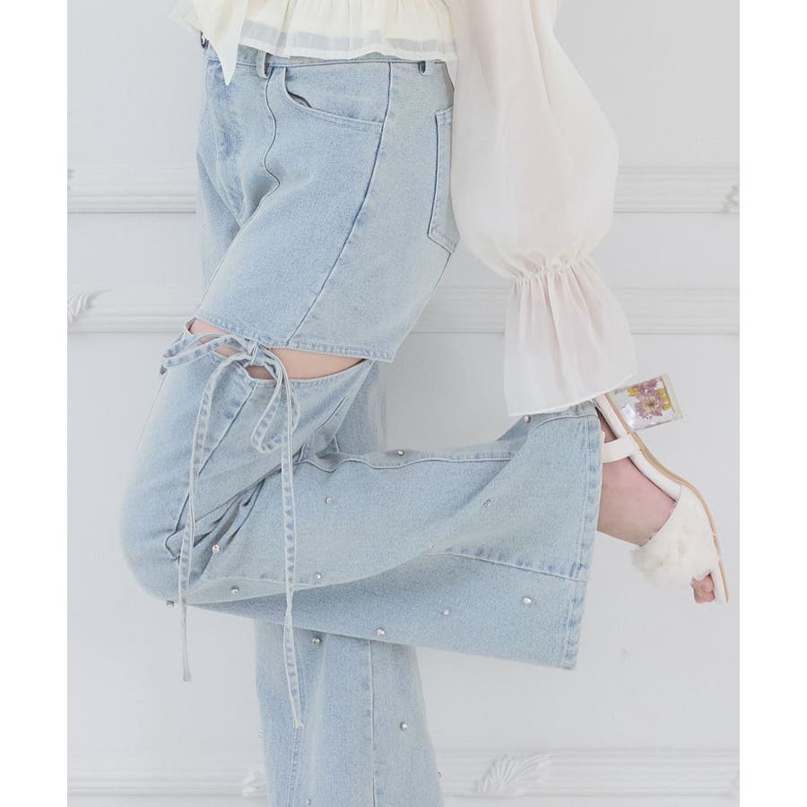 スリットビジューフレアデニムパンツ