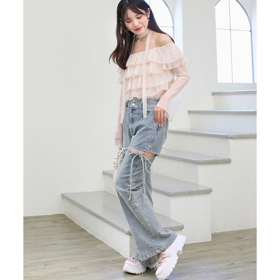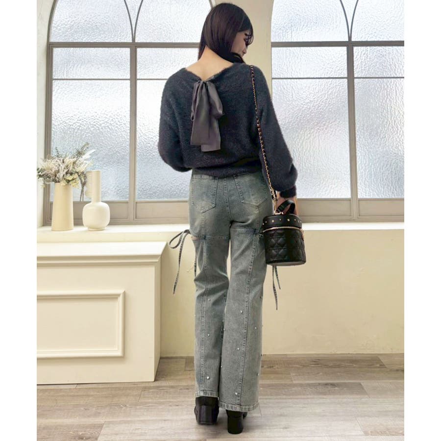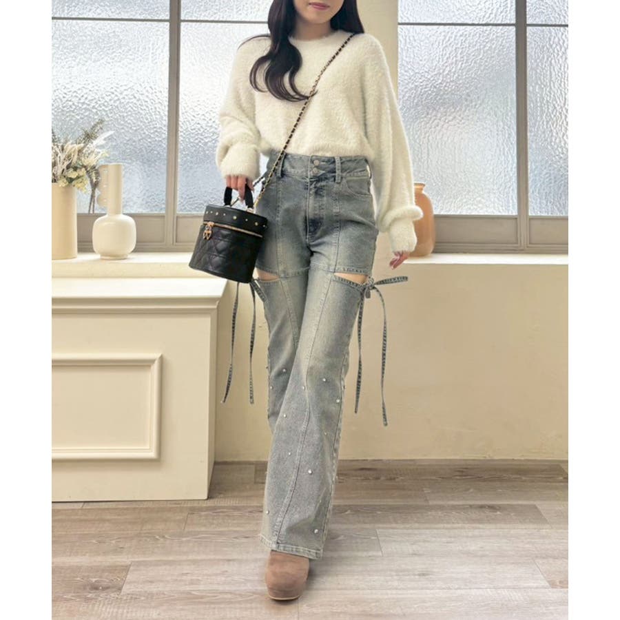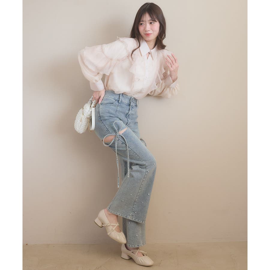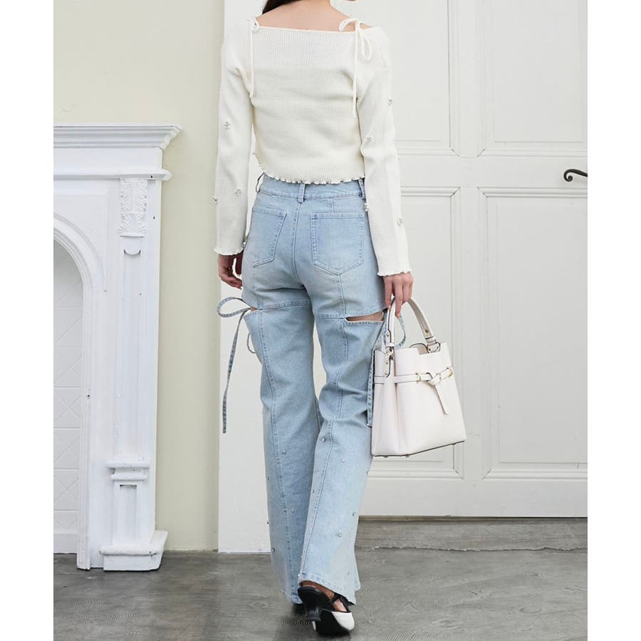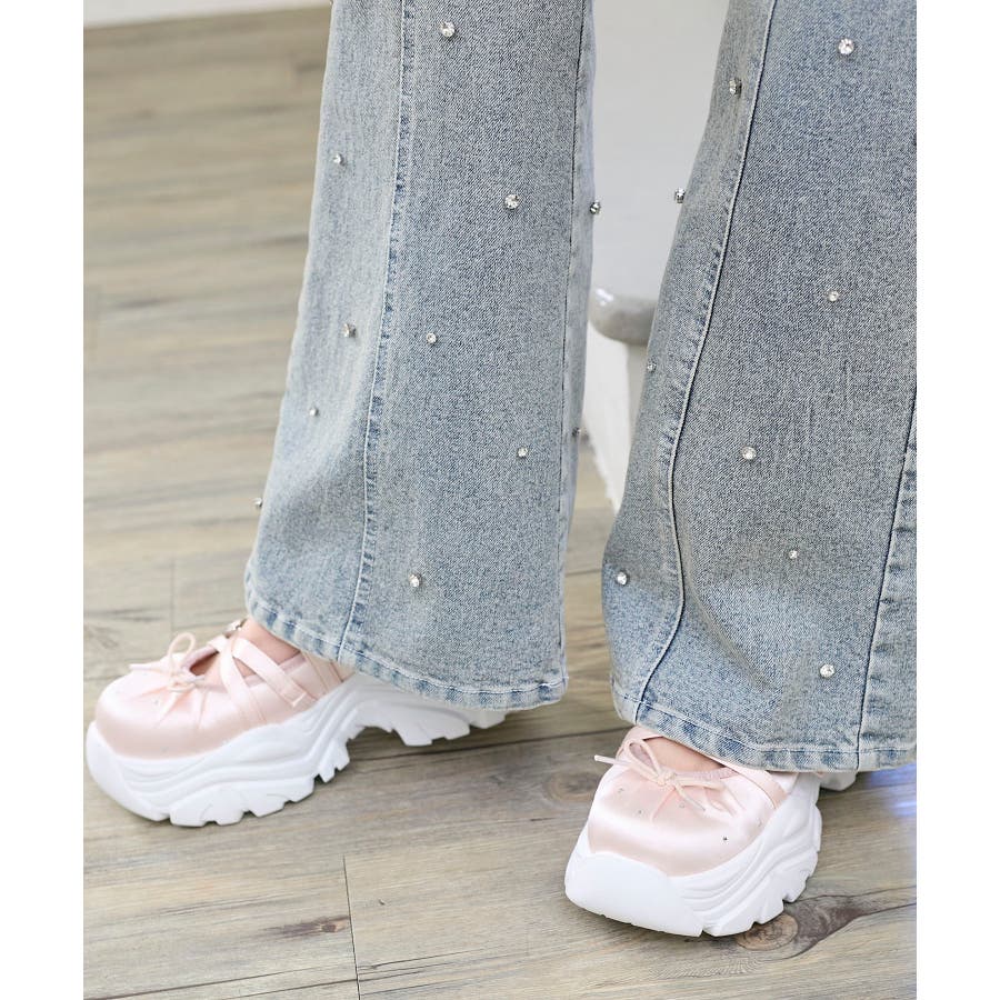 スリットビジューフレアデニムパンツ