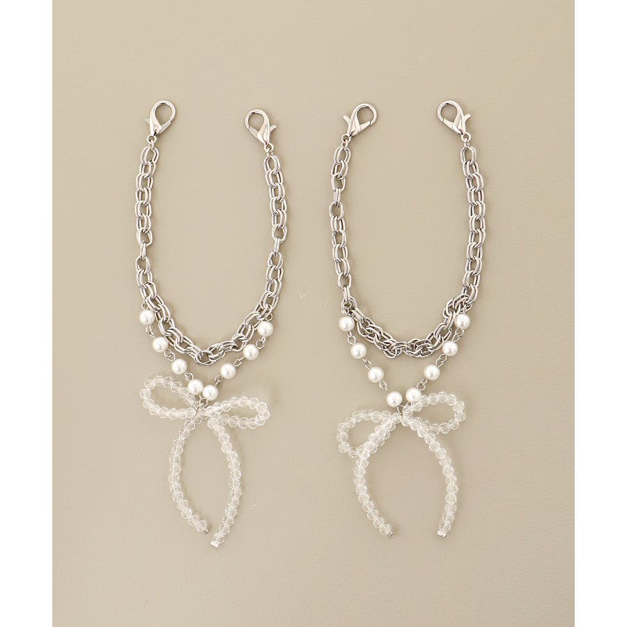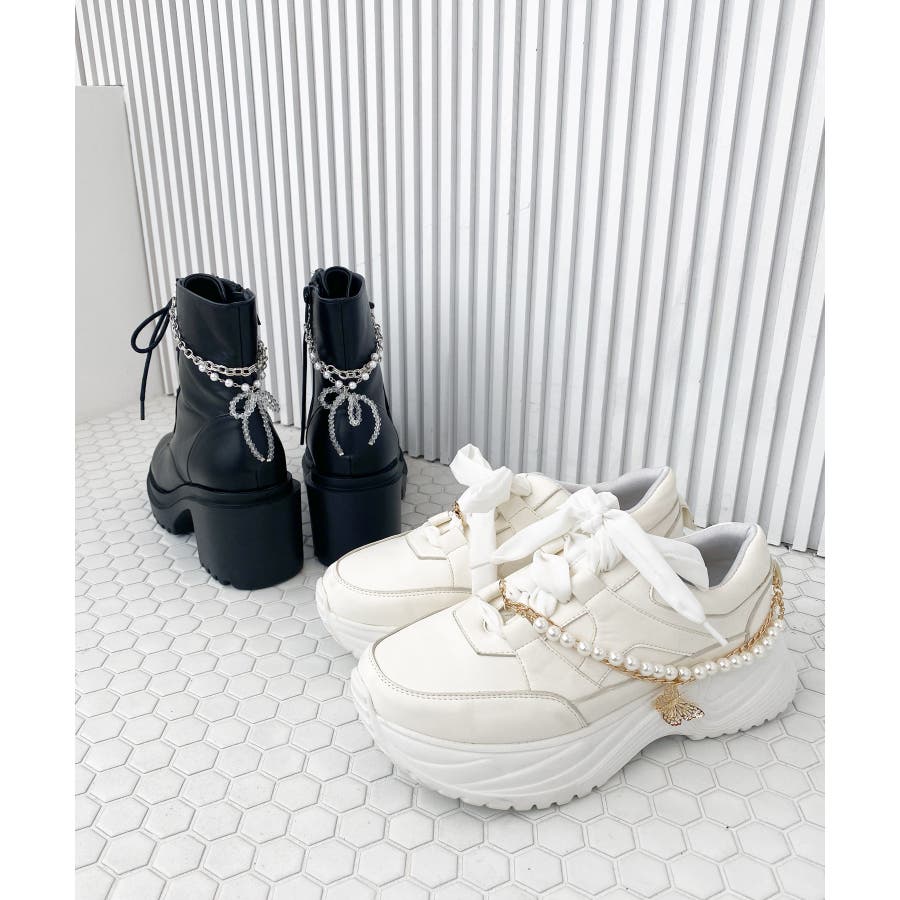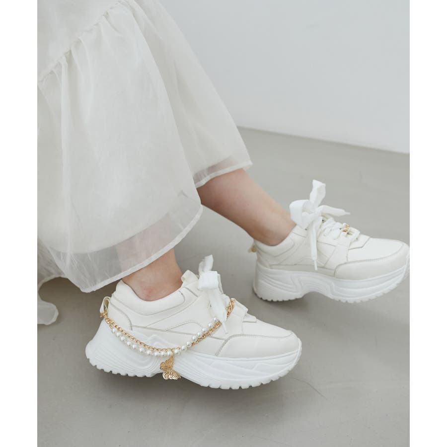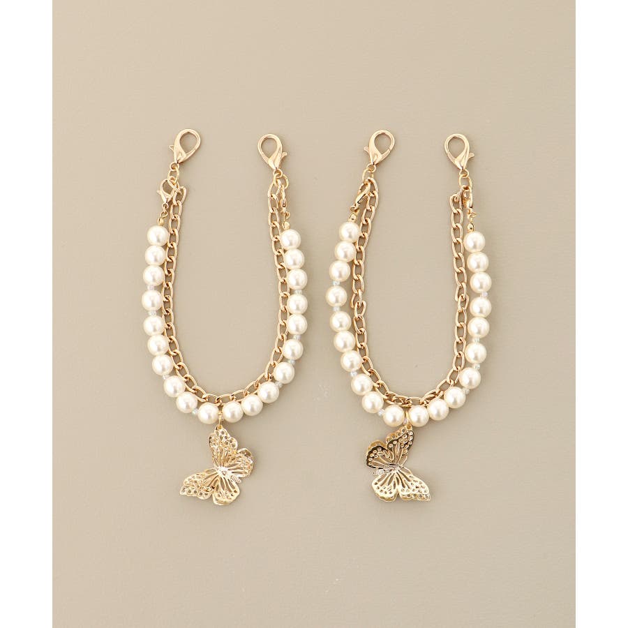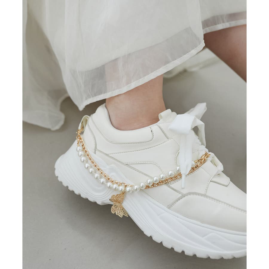 アクセサリー感覚で足元を華やかにデコるシューズチェーン。パールにリボン・蝶々のモチーフでトレンドライクなポイントをプラス。普段のスニーカーやブーツの紐部分に簡単に取り付け可能◎※こちらの商品はWEB限定販売商品となっております。*商品の実測サイズはシルバーです。[ゴールド]全長25cm/パール直径0.8cm/モチーフタテ2.3cm×ヨコ3cm