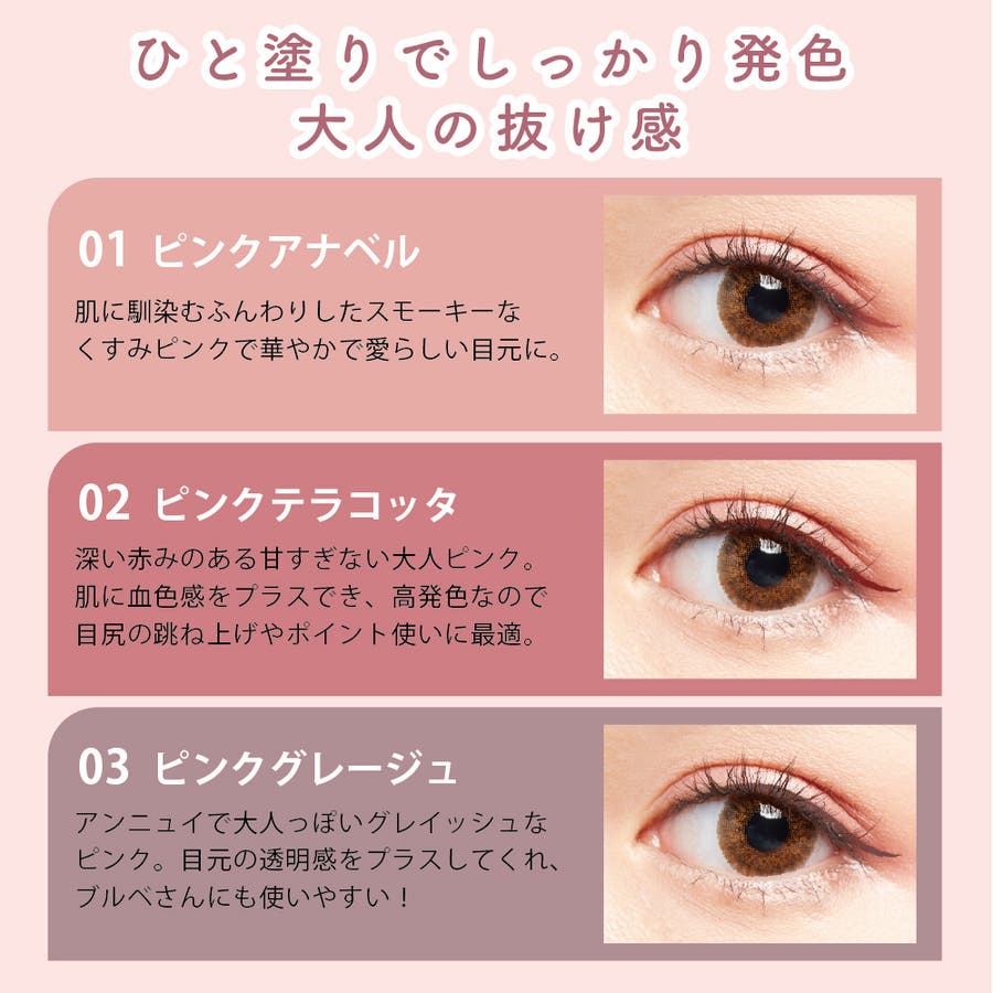 アンニュイで大人っぽいグレイッシュなピンク。目元の透明感をプラスしてくれ、ブルベさんにも使いやすい!太めにひいてもやりすぎ感がなくニュアンスカラーでありながらしっかりと目元を引き締めます。