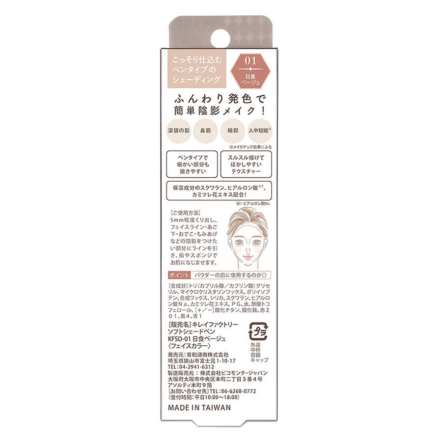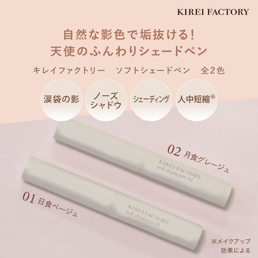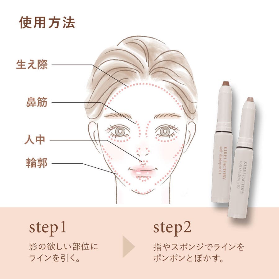自然な影色で垢抜ける!天使のふんわりシェードペンsoft shadepenマルチに使える自然な影色涙袋の影 ノーズシャドウ シェーディング 人中短縮※※メイクアップ効果によるこっそり仕込むペンタイプのシェーディングふんわり発色で簡単陰影メイク!涙袋の影 鼻筋 輪郭 人中短縮※※メイクアップ効果による・ペンタイプで細かい部分も描きやすい・スルスル描けてぼかしやすいテクスチャー・保湿成分のスクワラン、ヒアルロン酸※1、カミツレ花エキス配合!※1 ヒアルロン酸Naポイント:パウダーの前に使用するのが◎[販売名]キレイファクトリーソフトシェードペンKFSD-01 日食ベージュ 〈フェイスカラー〉