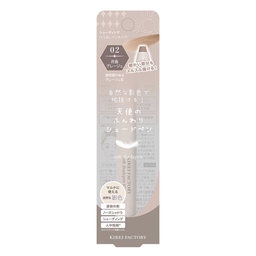 シェーディング(くり出しペンタイプ)細かい部分もスルスル描ける!02 月食グレージュ 透明感のあるグレージュ自然な影色で垢抜ける!天使のふんわりシェードペンsoft shadepenマルチに使える自然な影色涙袋の影 ノーズシャドウ シェーディング 人中短縮※※メイクアップ効果によるこっそり仕込むペンタイプのシェーディングふんわり発色で簡単陰影メイク!涙袋の影 鼻筋 輪郭 人中短縮※※メイクアップ効果による・ペンタイプで細かい部分も描きやすい・スルスル描けてぼかしやすいテクスチャー・保湿成分のスクワラン、ヒアルロン酸※1、カミツレ花エキス配合!※1 ヒアルロン酸Naポイント:パウダーの前に使用するのが◎[販売名]キレイファクトリーソフトシェードペンKFSD-02 月食グレージュ 〈フェイスカラー〉
