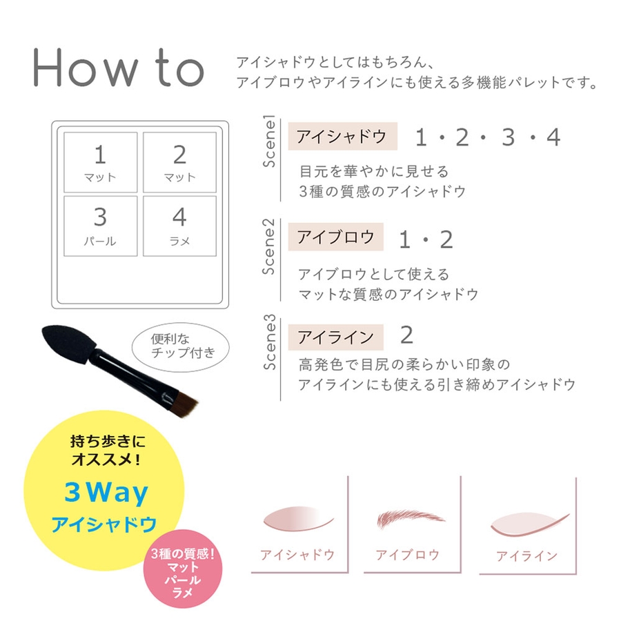 | 素材 | ナチュラルなブラウンで好感度抜群の目元に★ アイシャドウ×アイライン×アイブロウに使える、持ち運びに便利な3wayアイシャドウ。 マット・パール・ラメの質感で好みに合わせた仕上がりに。1つのパレットで簡単に統一感のあるメイクが楽しめます。 ブラウン系でシーンを選ばずに使いやすいカラーを厳選。 まるで愛犬のように愛でてしまうような、 いつでも一緒に持ち歩きたくなるパレット。 |