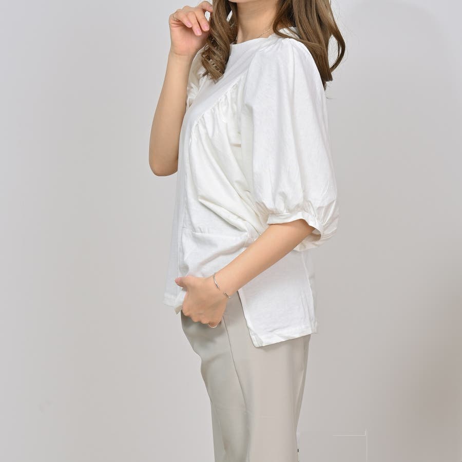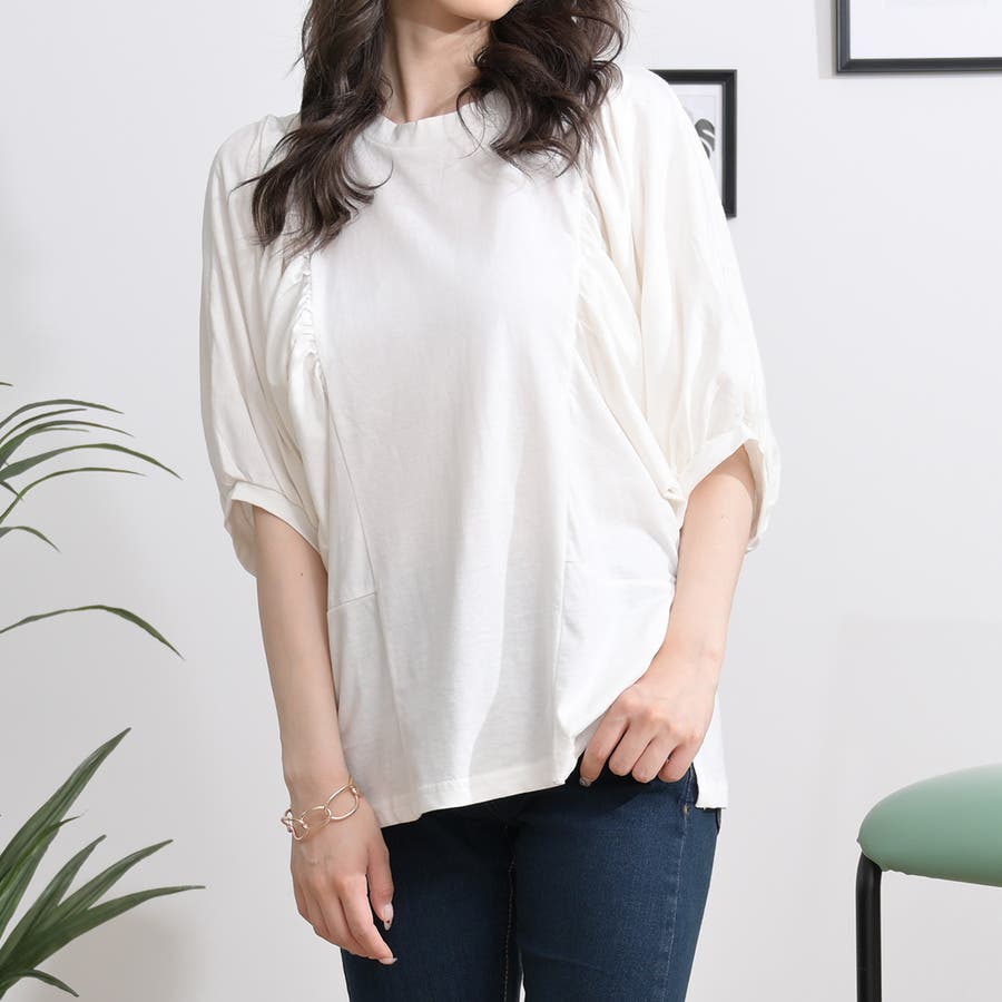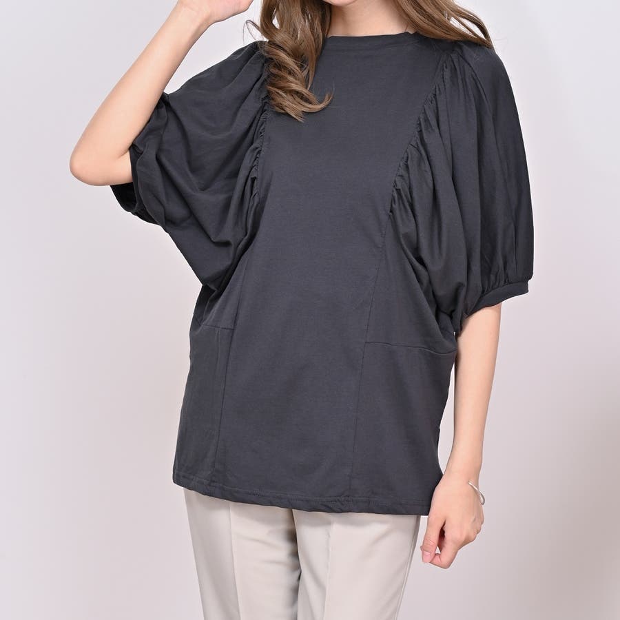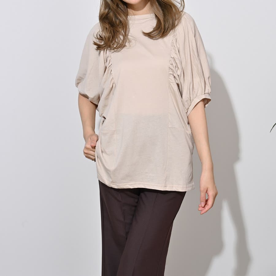 【ライトベージュ】ギャザー袖ドルマンカットソー トップス 夏