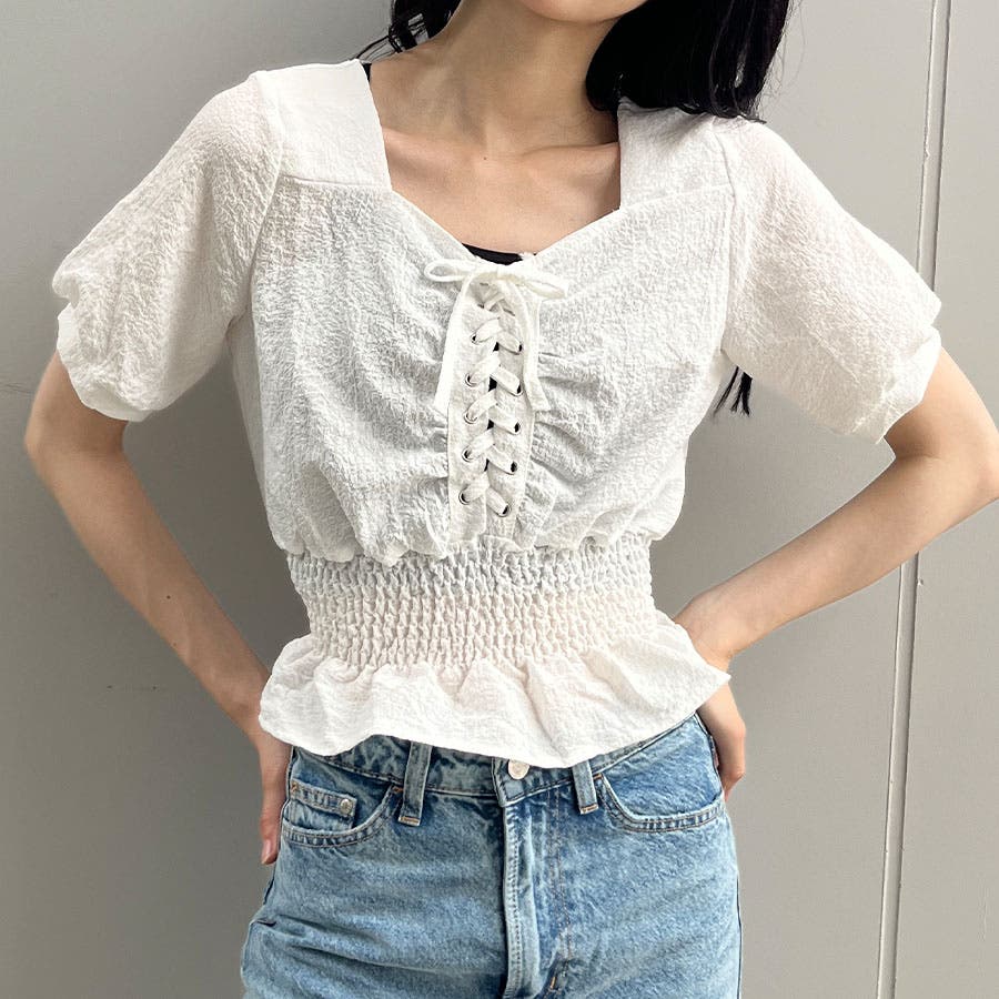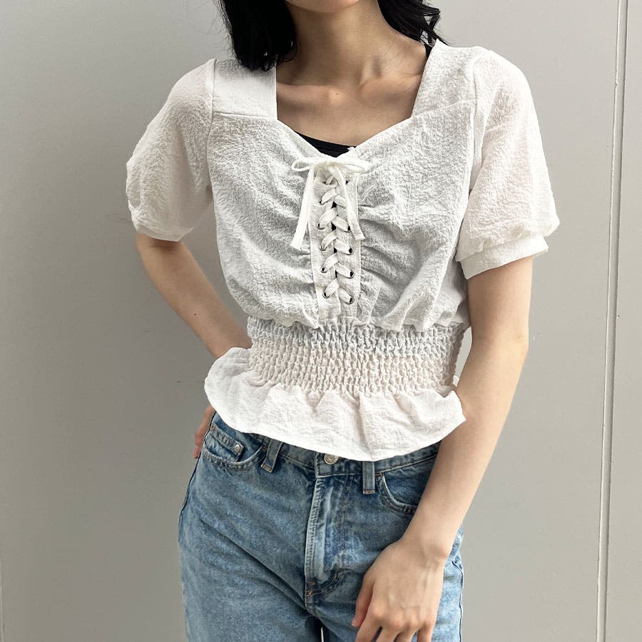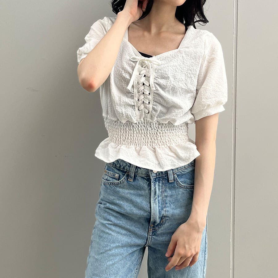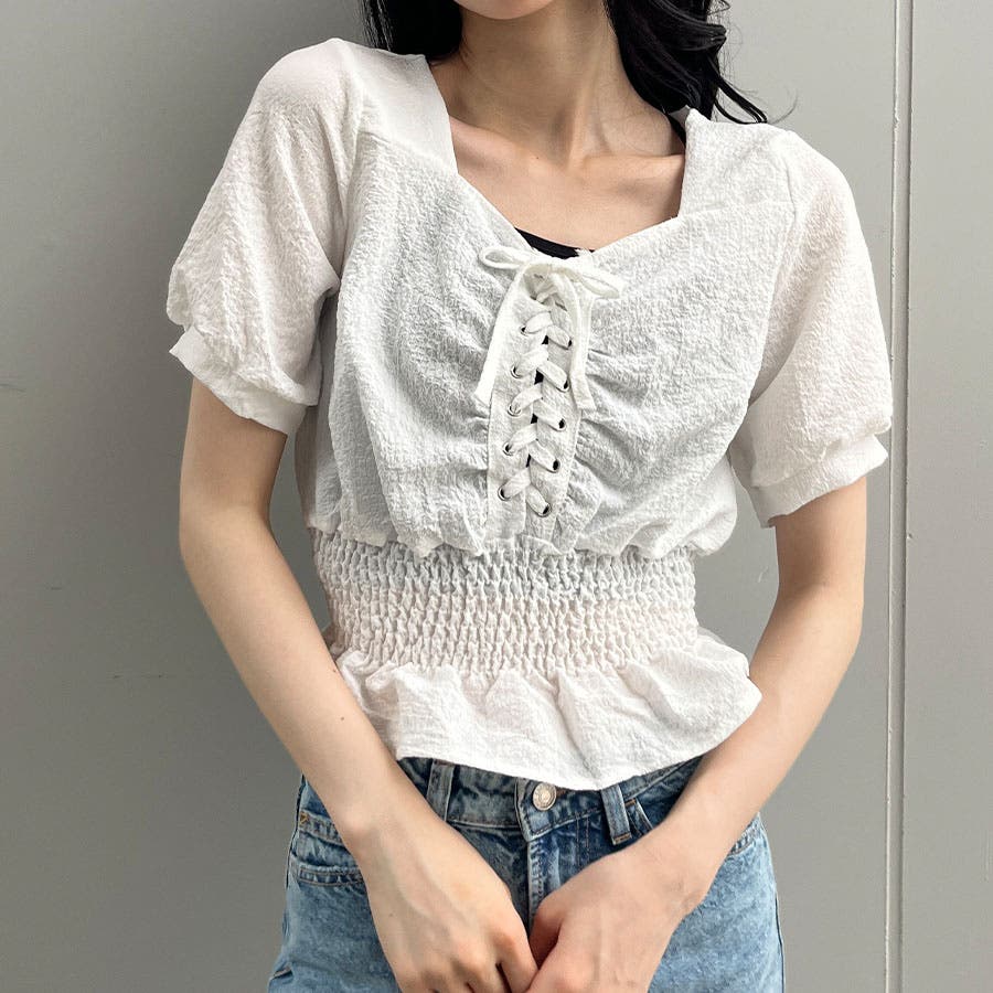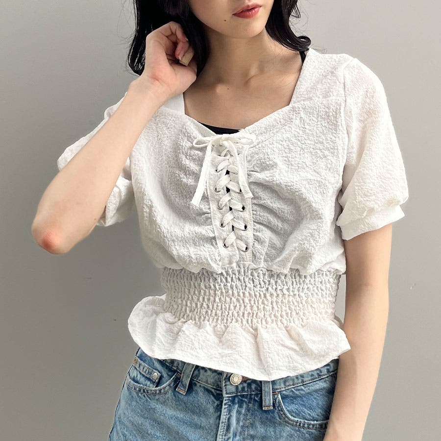 ウエストシャーリングレースアップブラウス 春 韓国トップス
