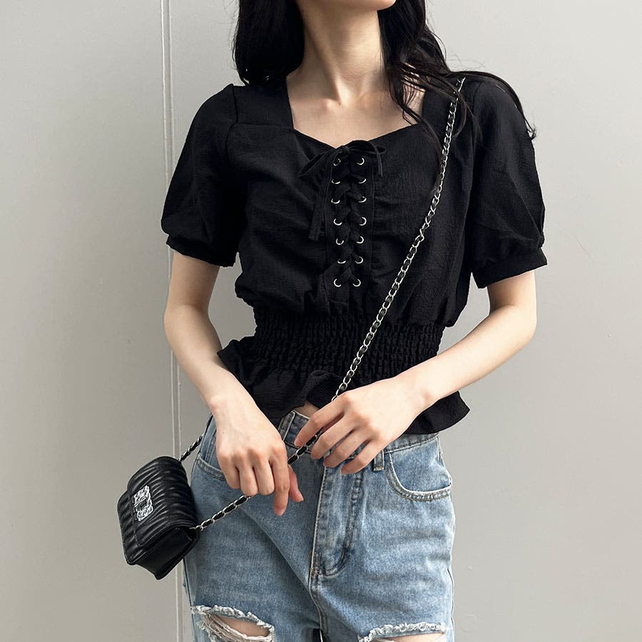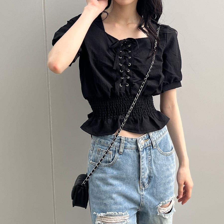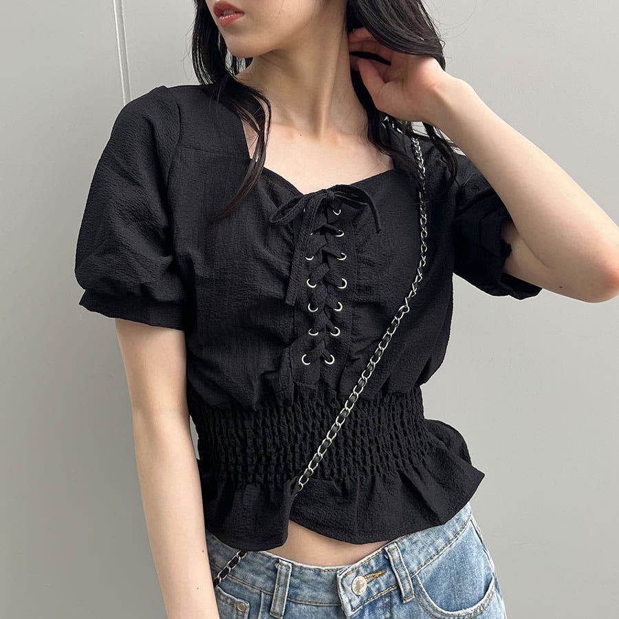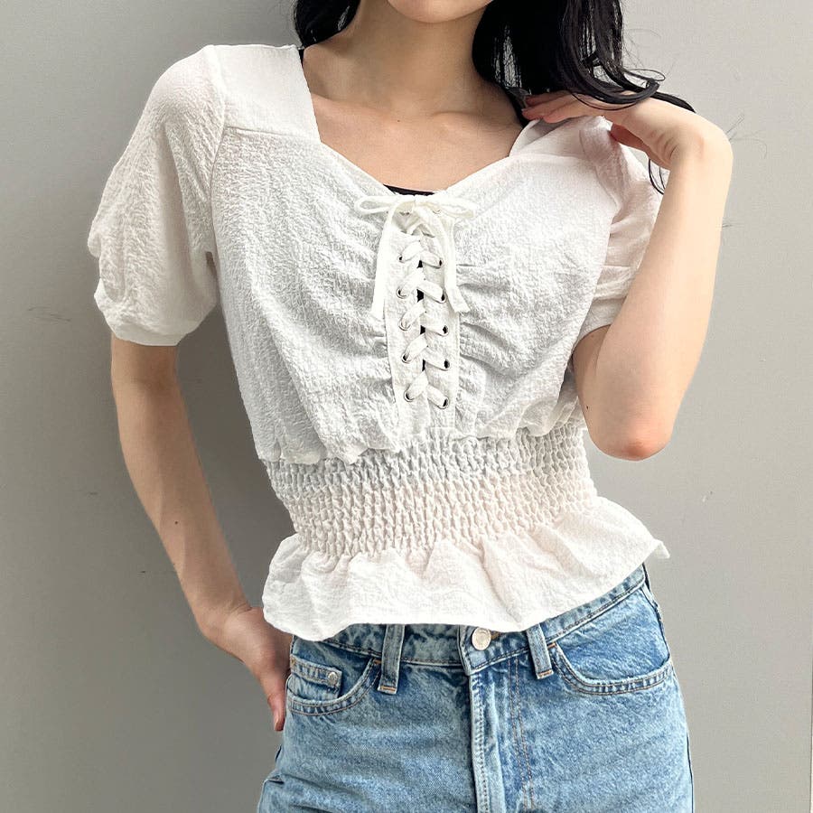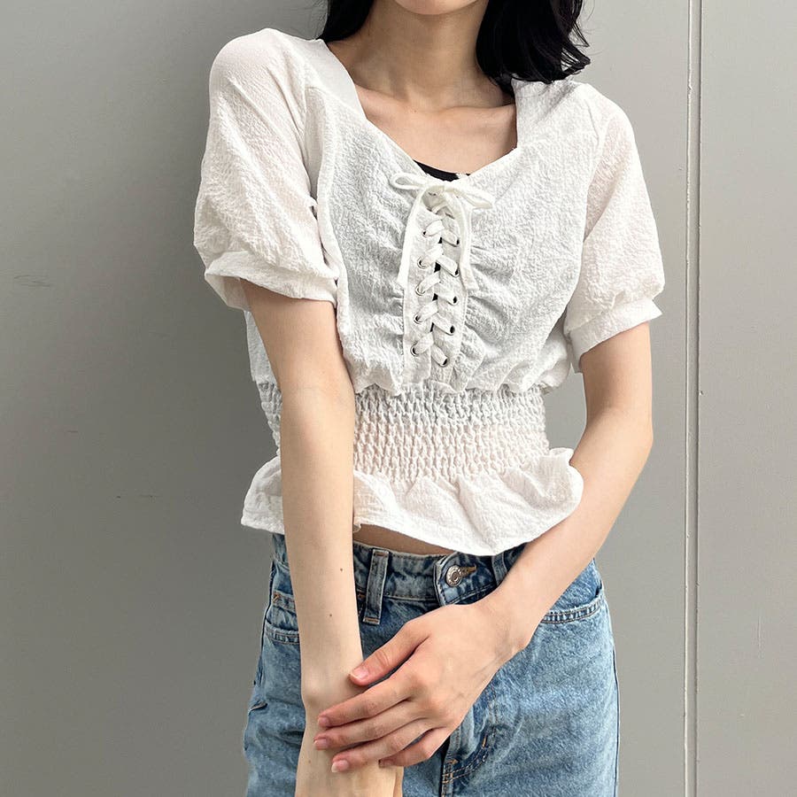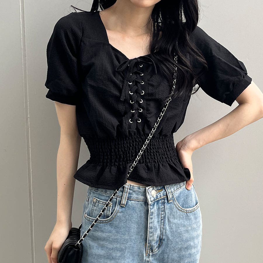 ウエストシャーリングレースアップブラウス 春 韓国トップス