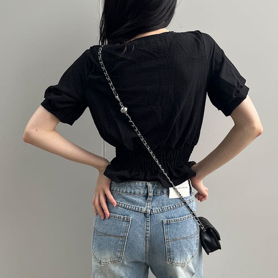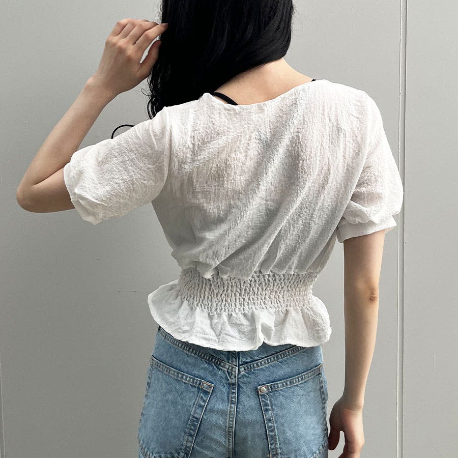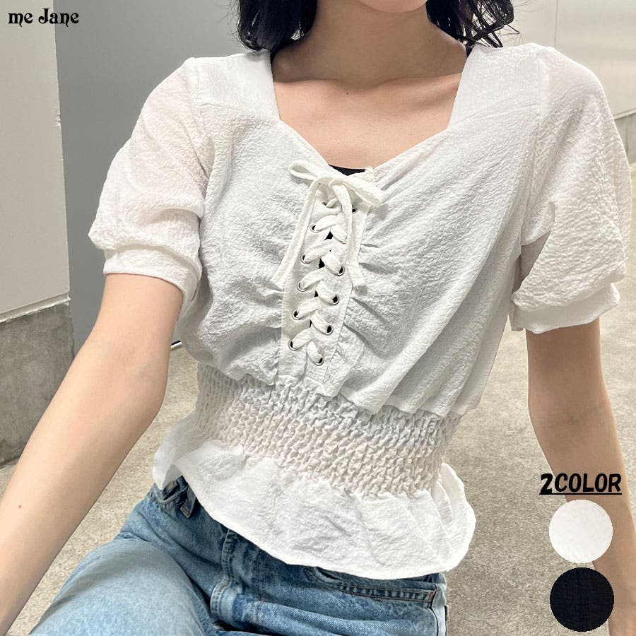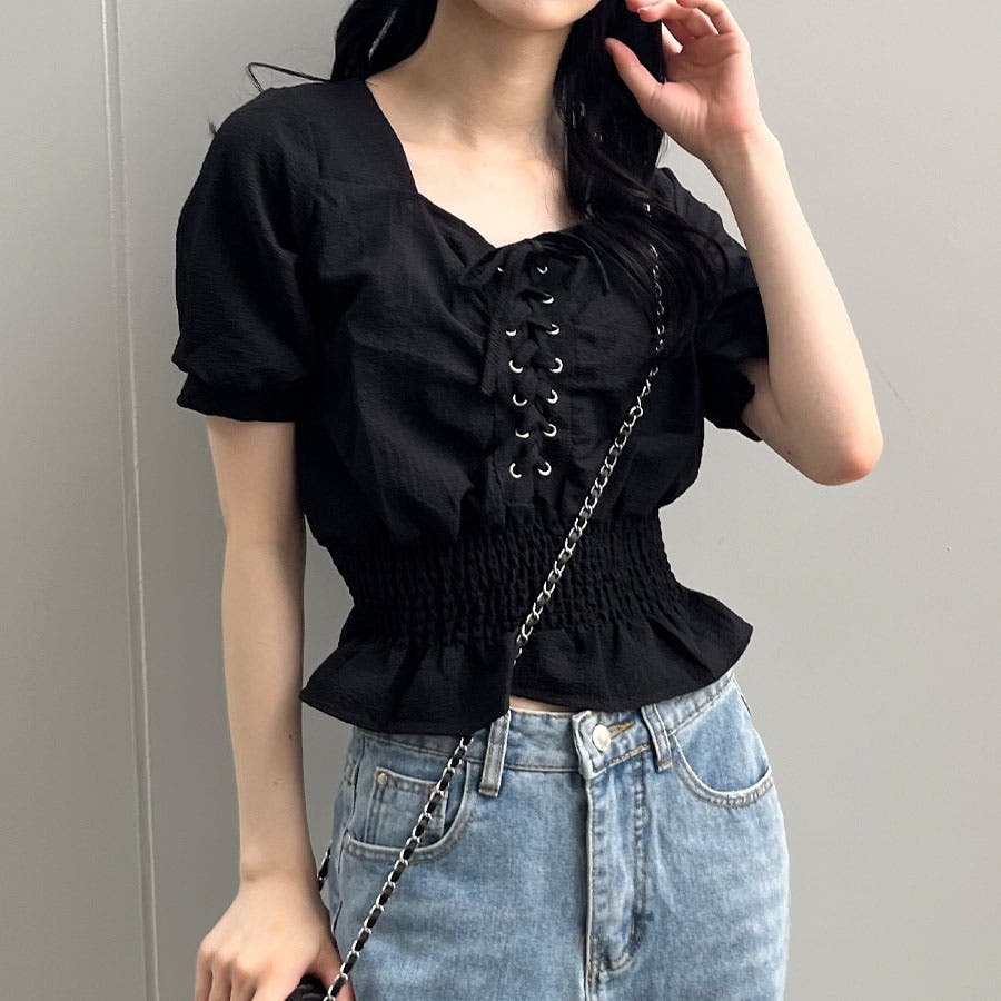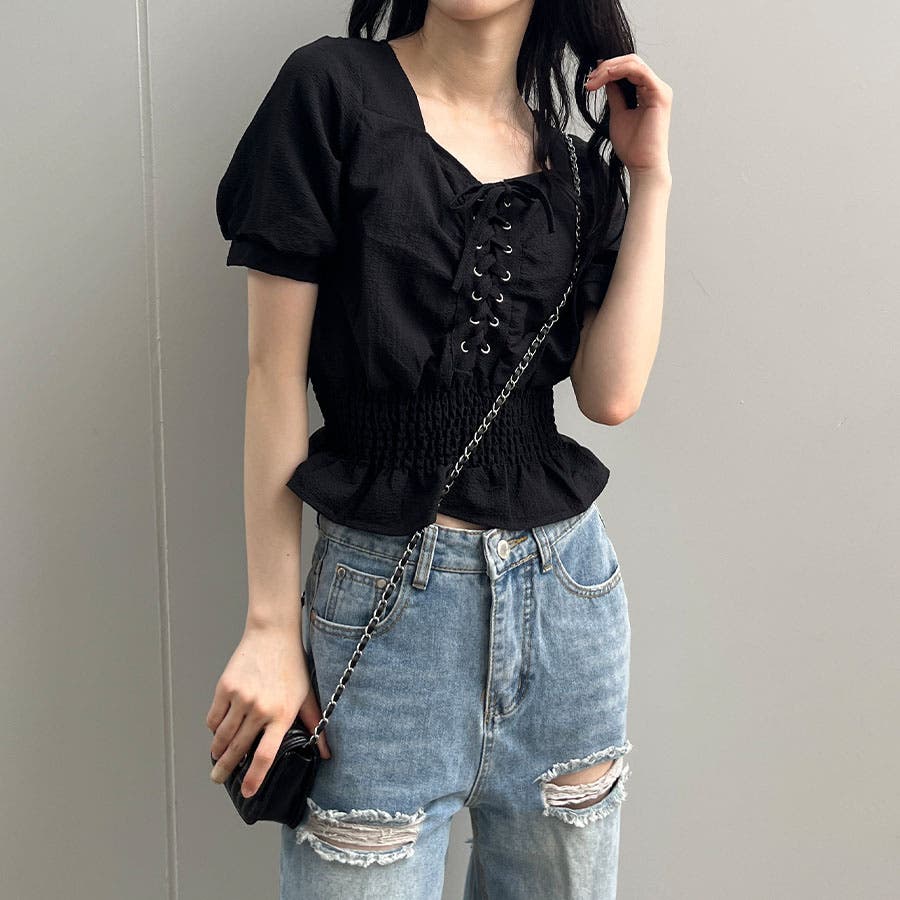 ウエストシャーリングレースアップブラウス 春 韓国トップス