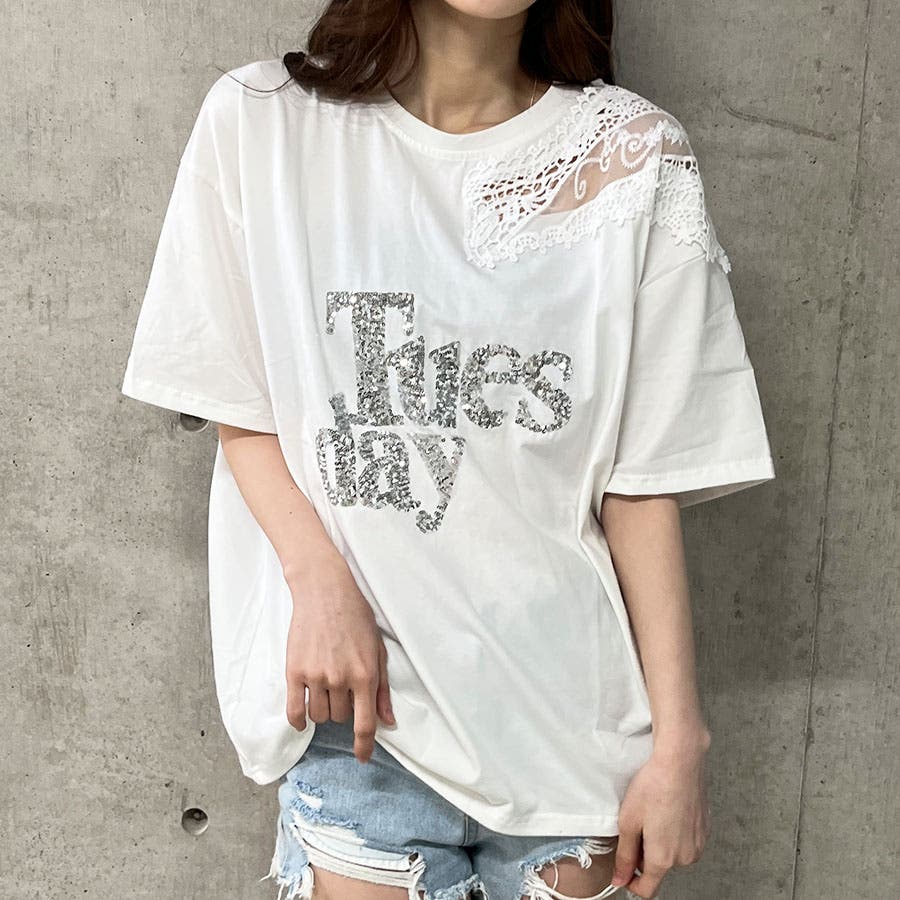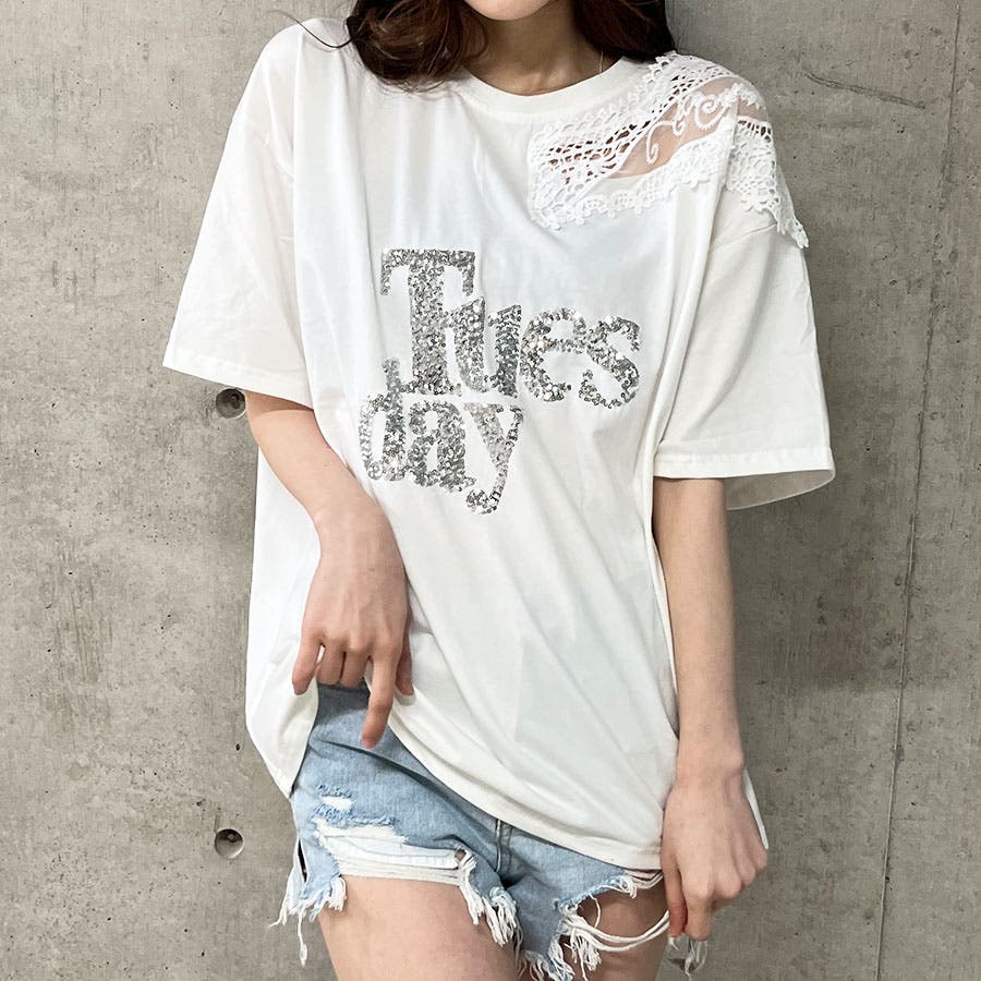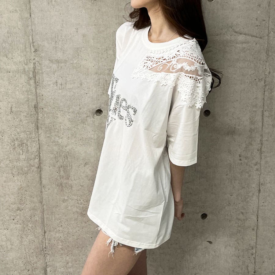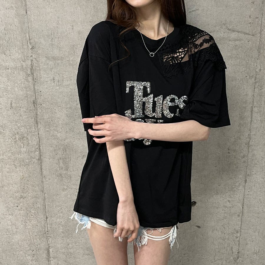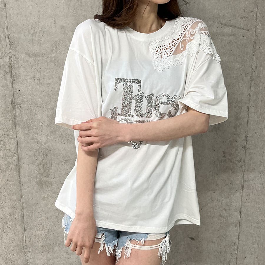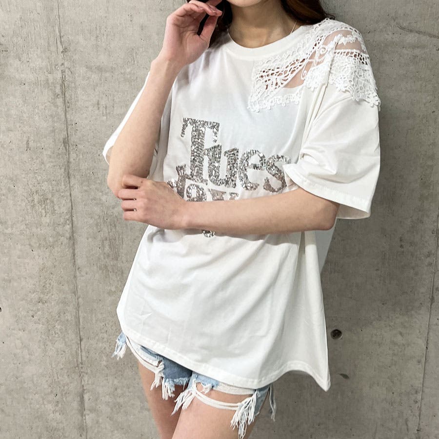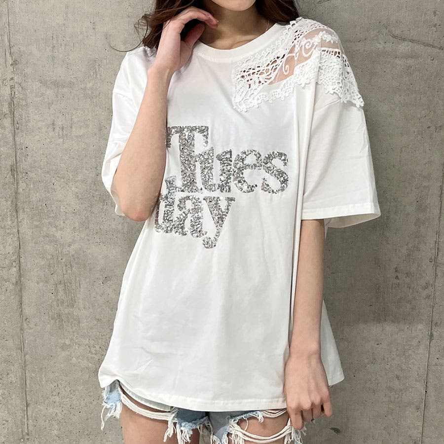 フロントのキラキラのロゴと肩のレースデザインがポイントの半袖Tシャツ!