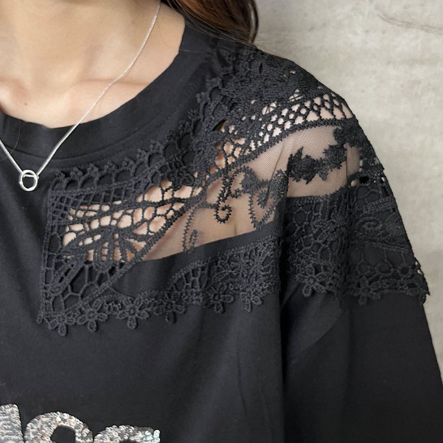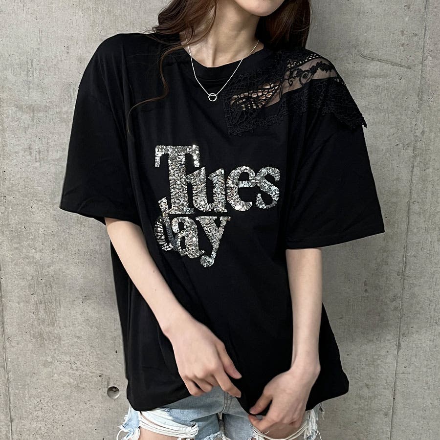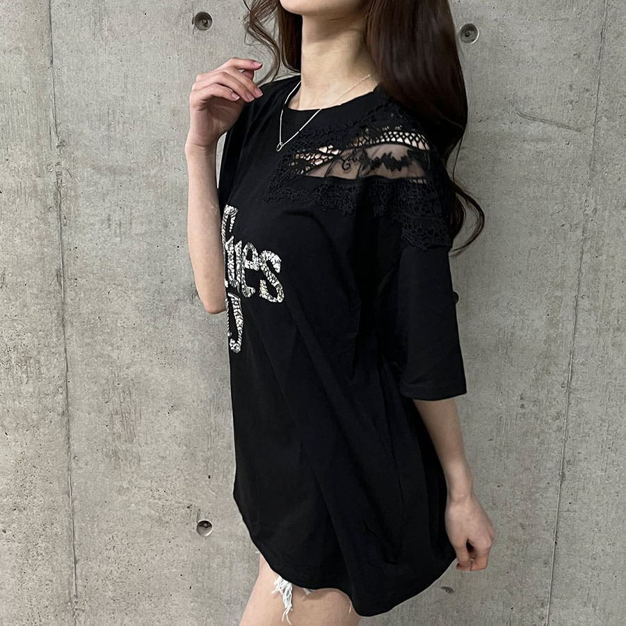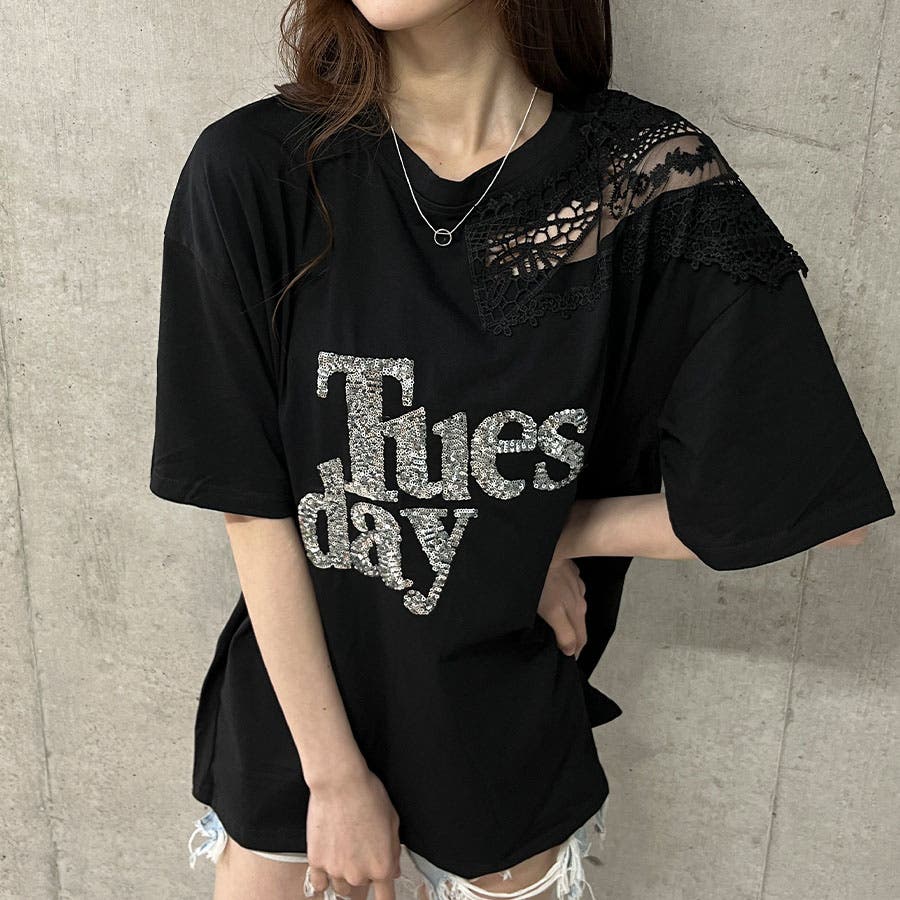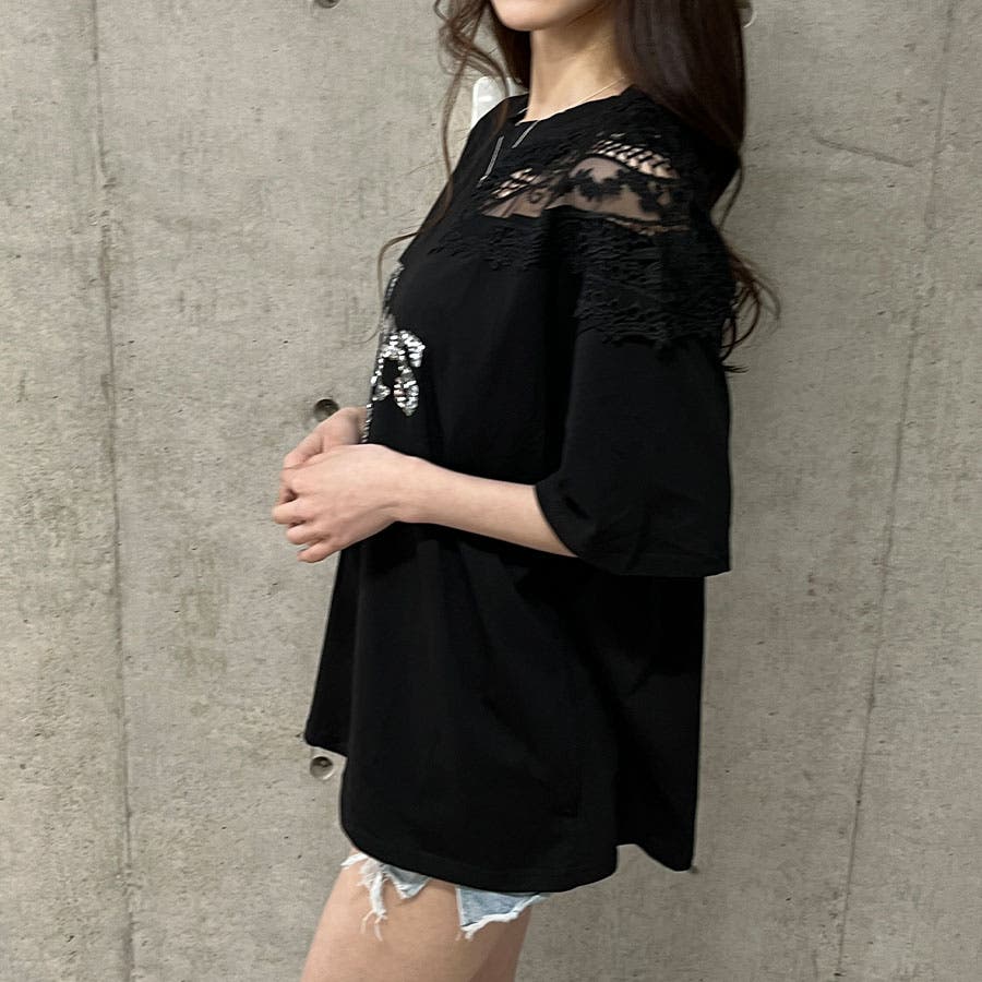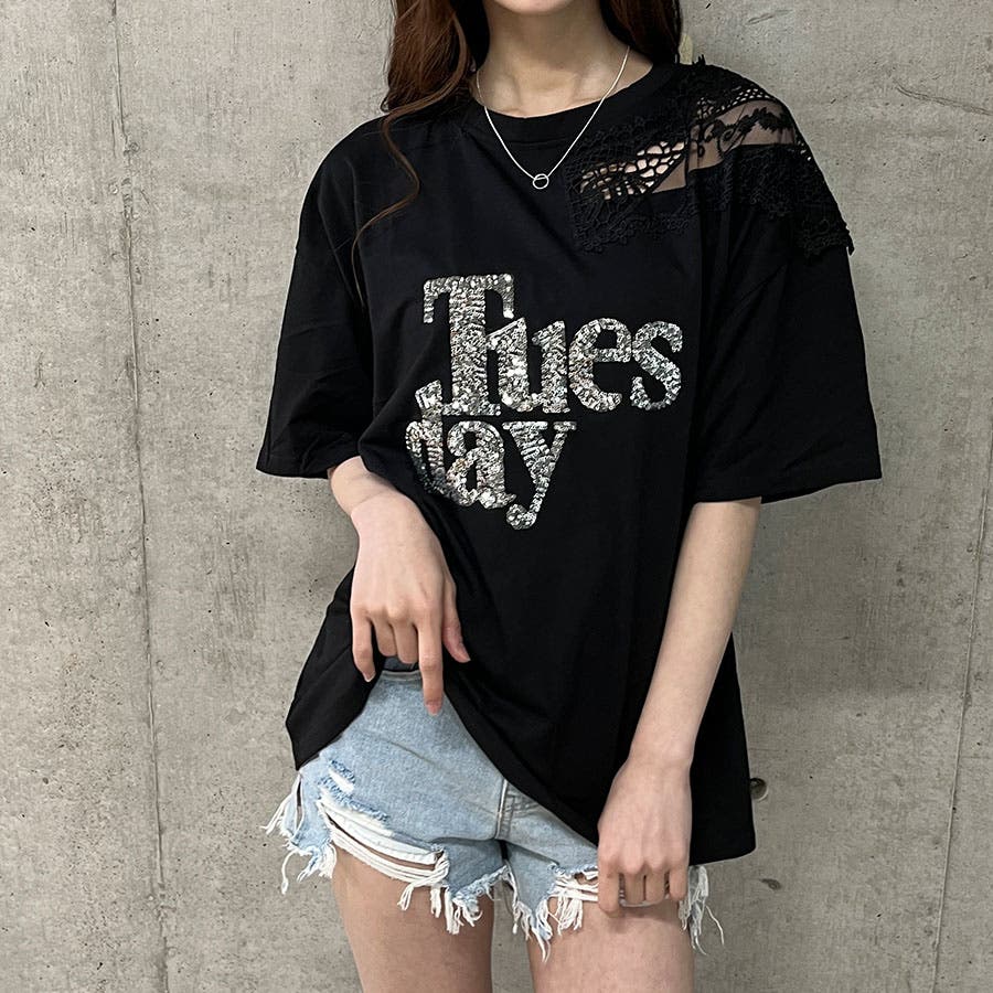 フロントのキラキラのロゴと肩のレースデザインがポイントの半袖Tシャツ!