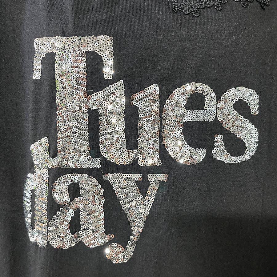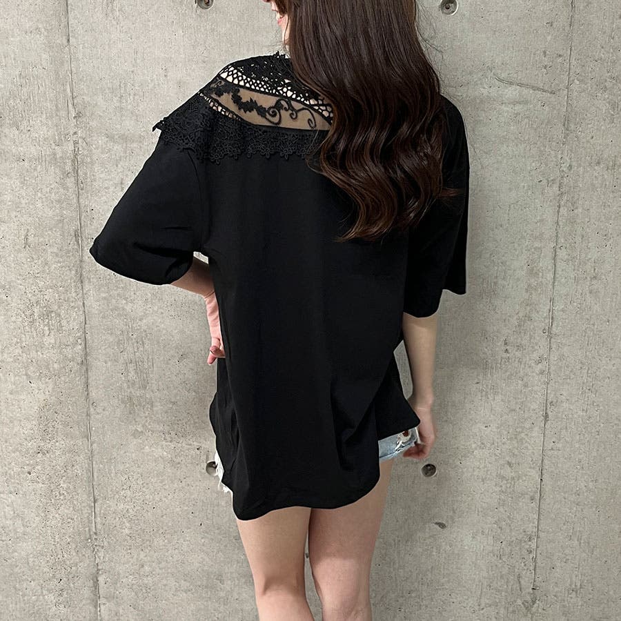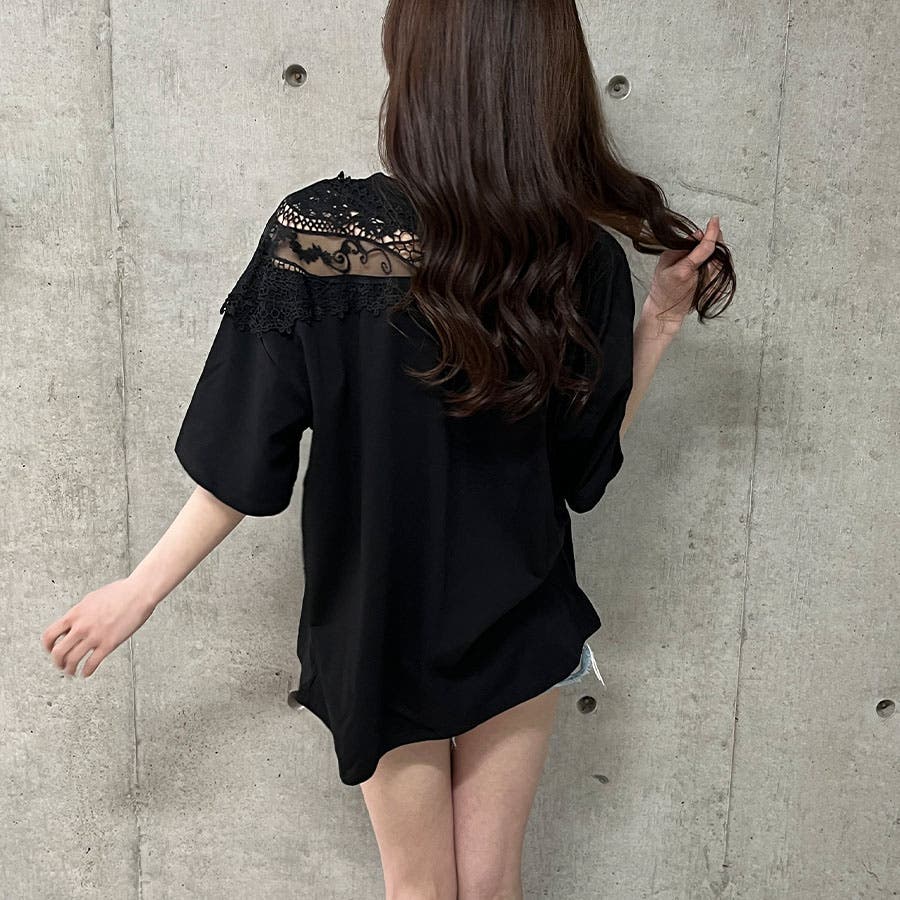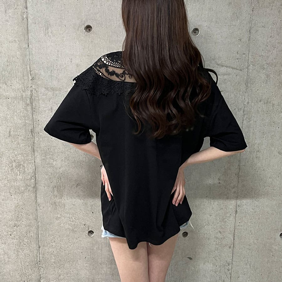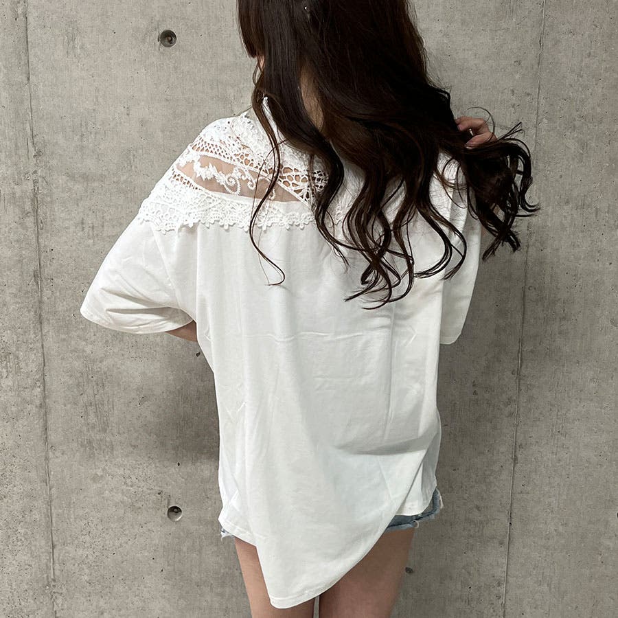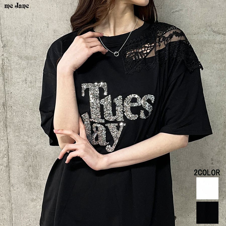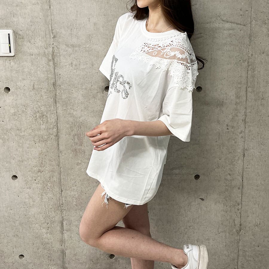 フロントのキラキラのロゴと肩のレースデザインがポイントの半袖Tシャツ!