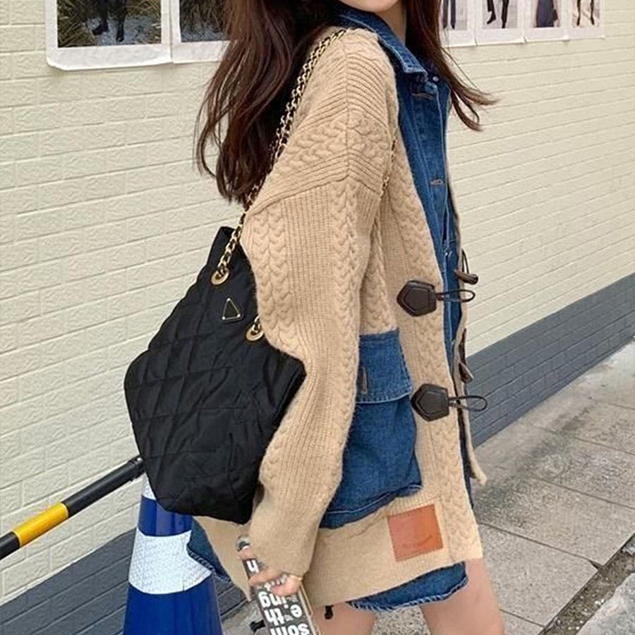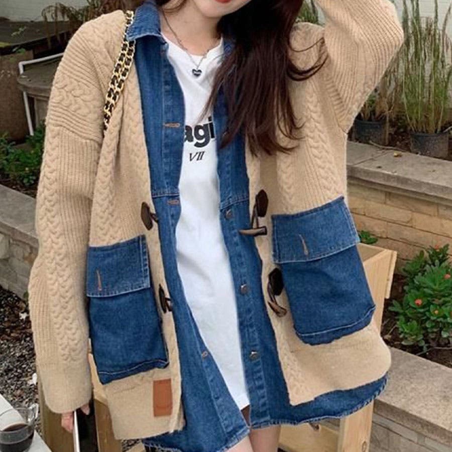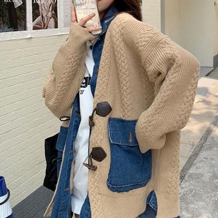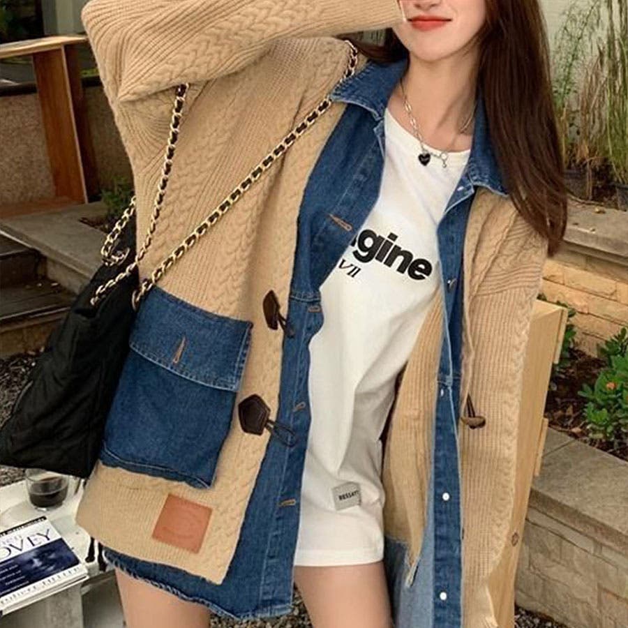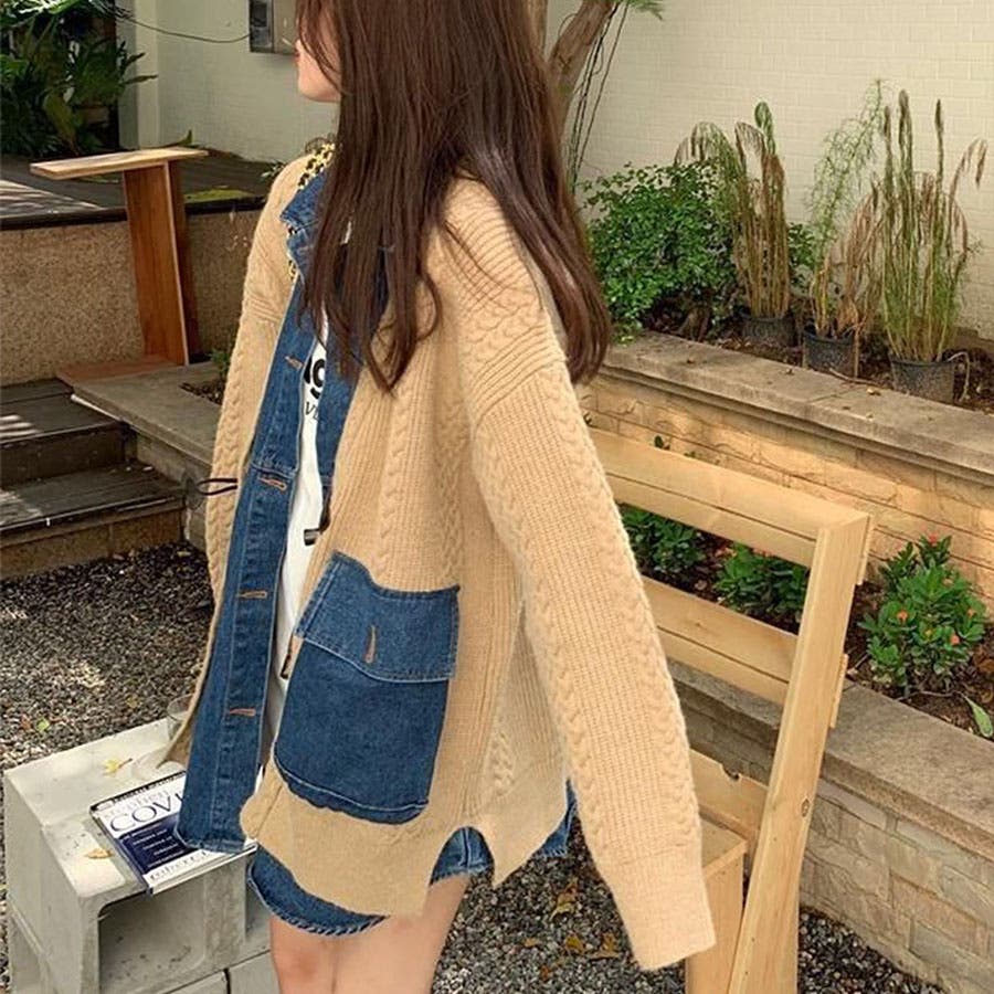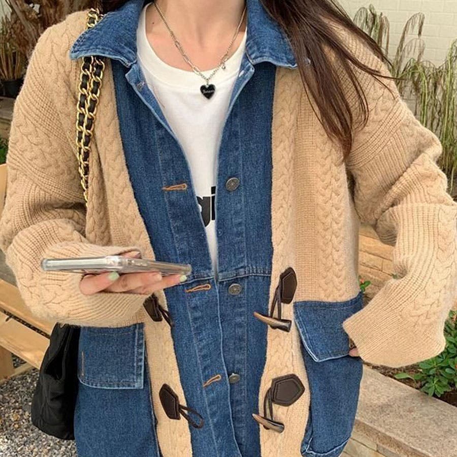 デニム×ケーブルニットレイヤード風カーディガン