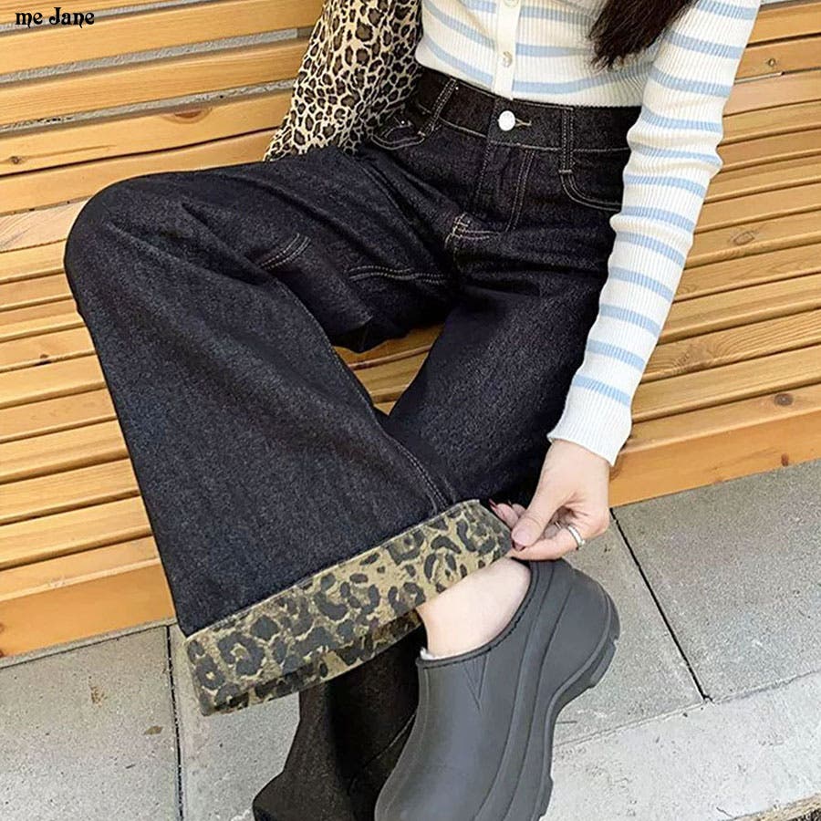 裾レオパード柄デニムルーズパンツ