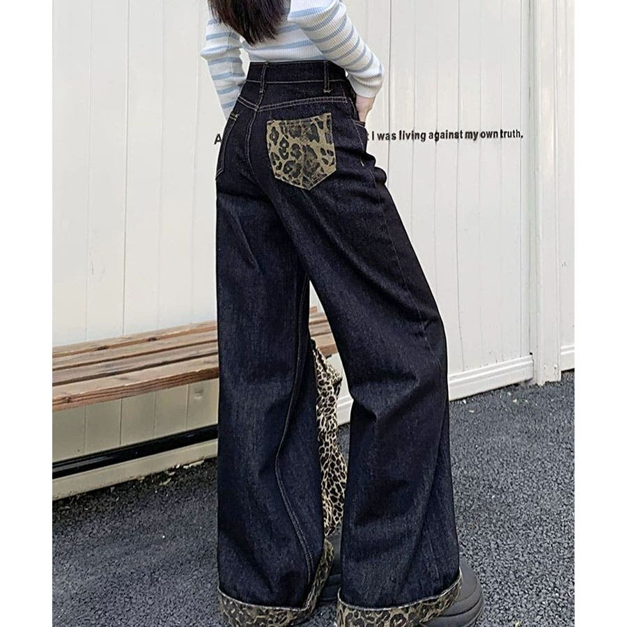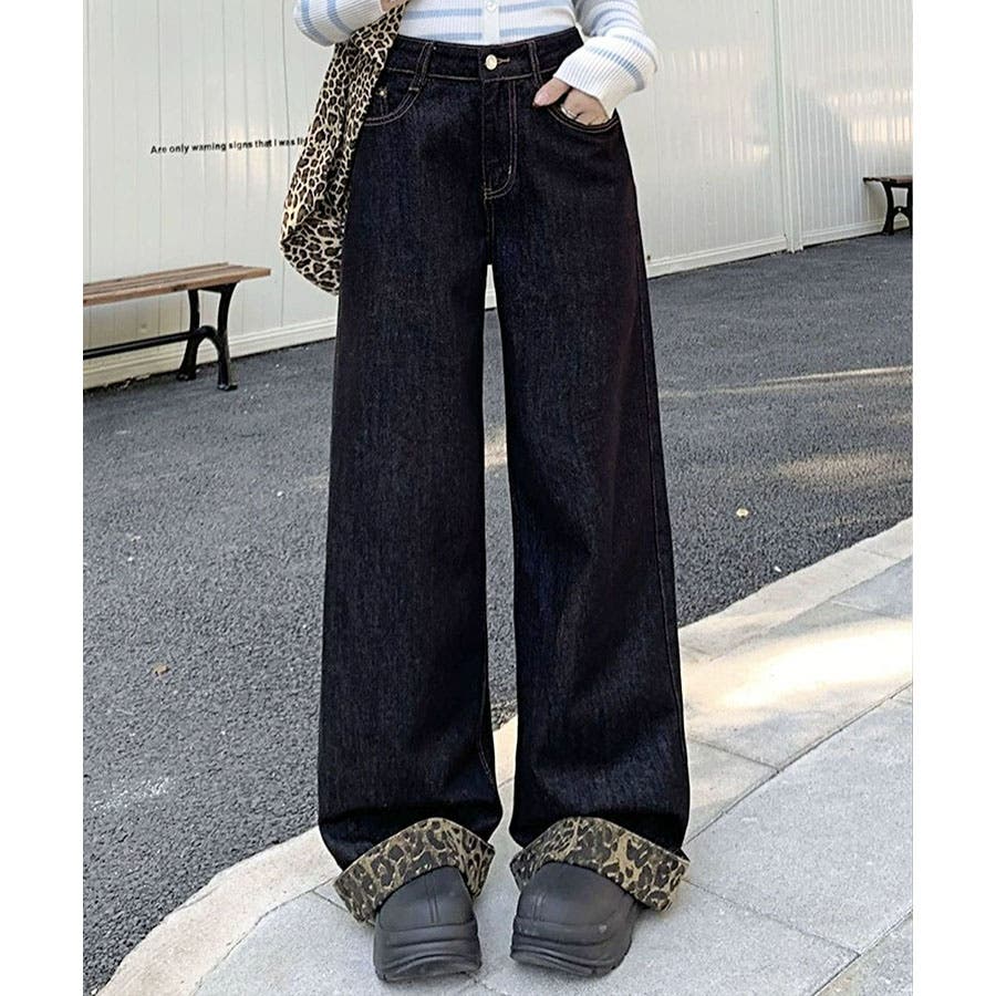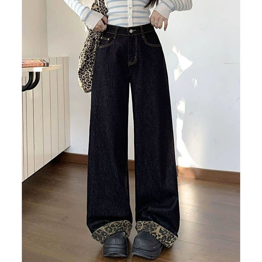 裾&ポケットのレオパード柄がかわいいデニムワイドパンツ!