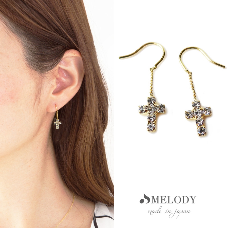6粒のラインストーンが耳元で輝く、定番のクロススイングピアス。