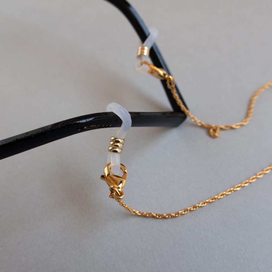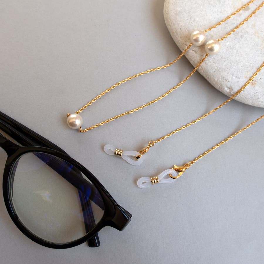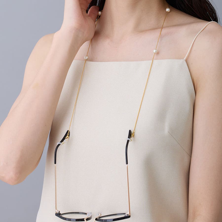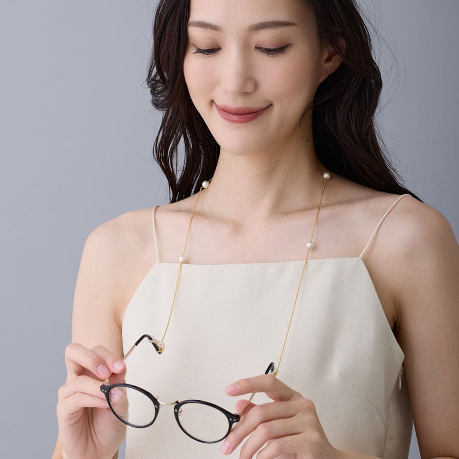 ステーションパールが配された眼鏡チェーンは、とても女性らしい印象。
