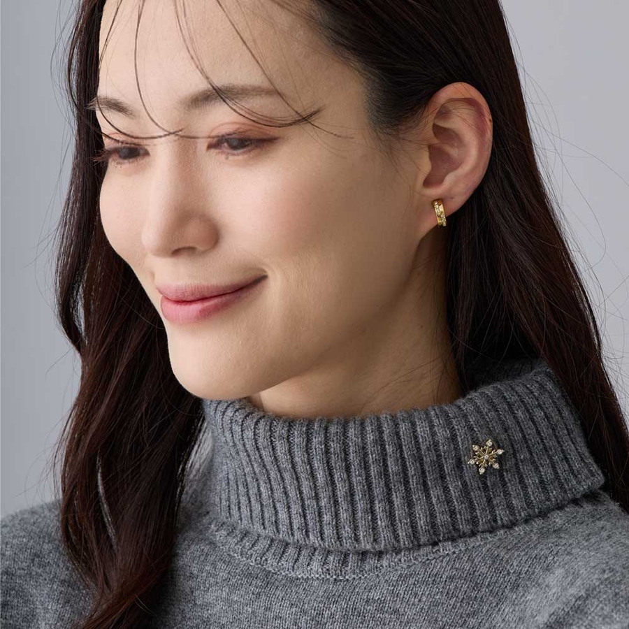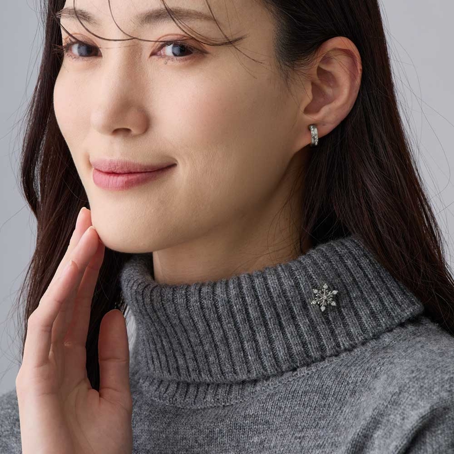 ボタン式のニットピンは簡単に付けられ、暗くなりがちな冬の顔回りを明るくしてくれそう