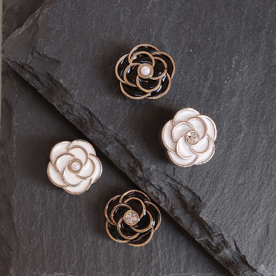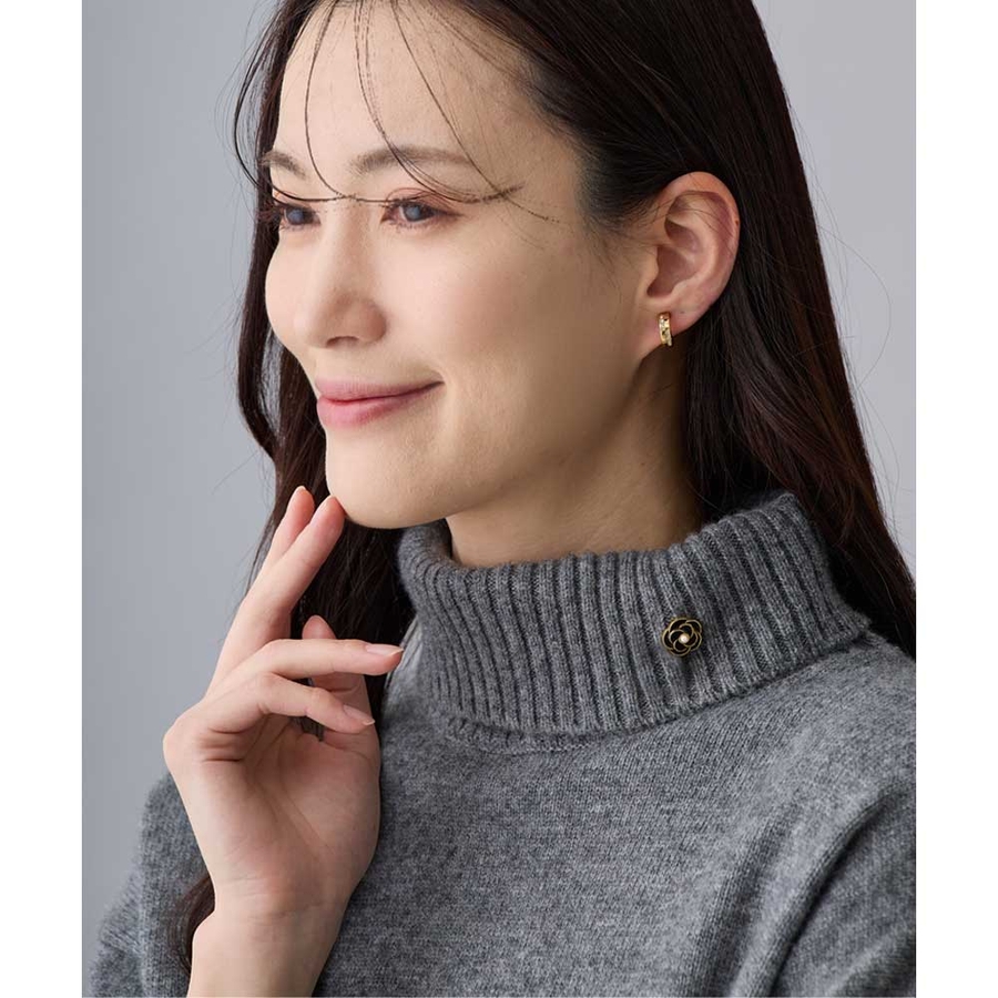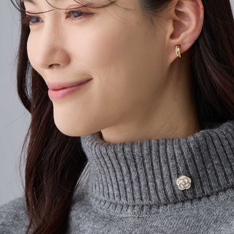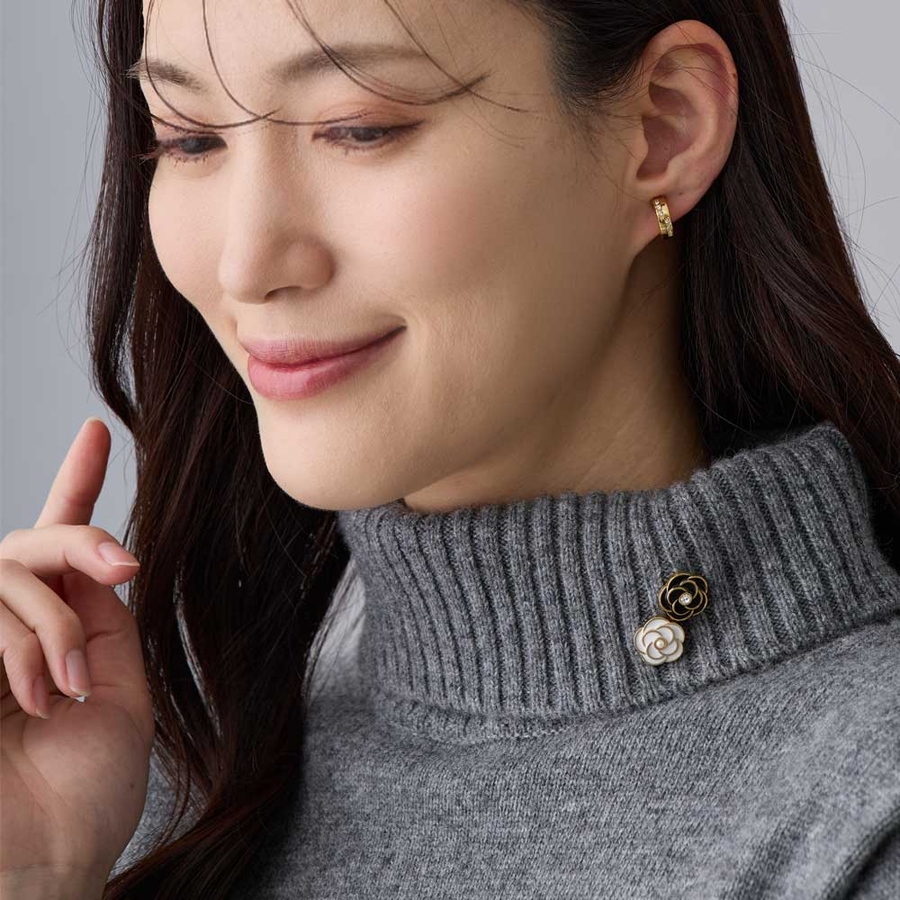 ボタン式のニットピンは簡単に付けられ、暗くなりがちな冬の顔回りを明るくしてくれそう