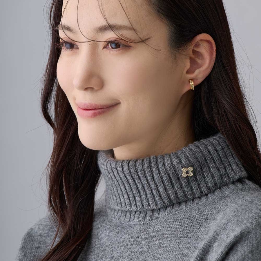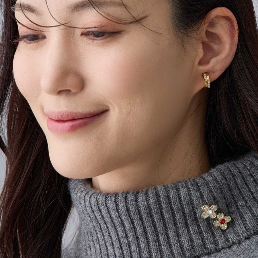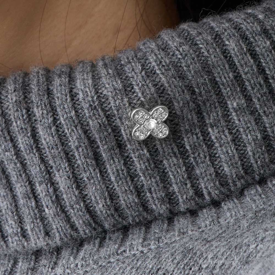 ボタン式のニットピンは簡単に付けられ、暗くなりがちな冬の顔回りを明るくしてくれそう