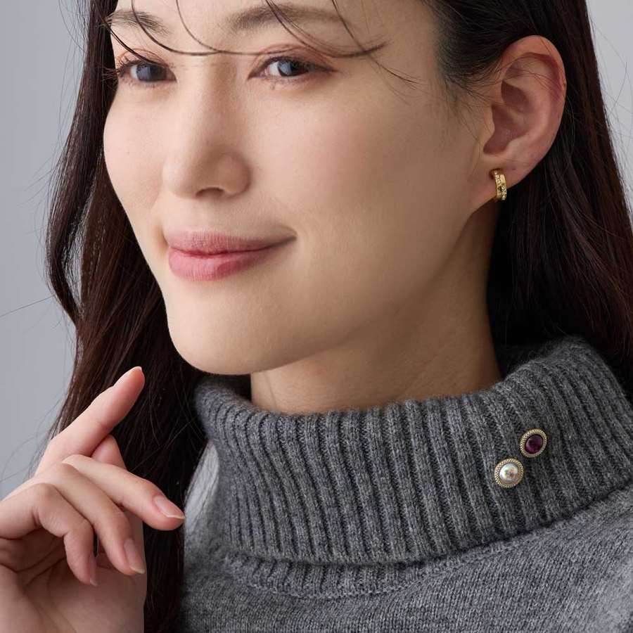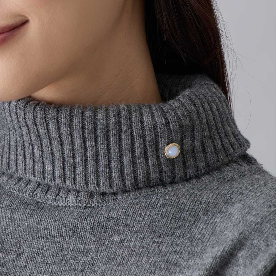 ボタン式のニットピンは簡単に付けられ、暗くなりがちな冬の顔回りを明るくしてくれそう