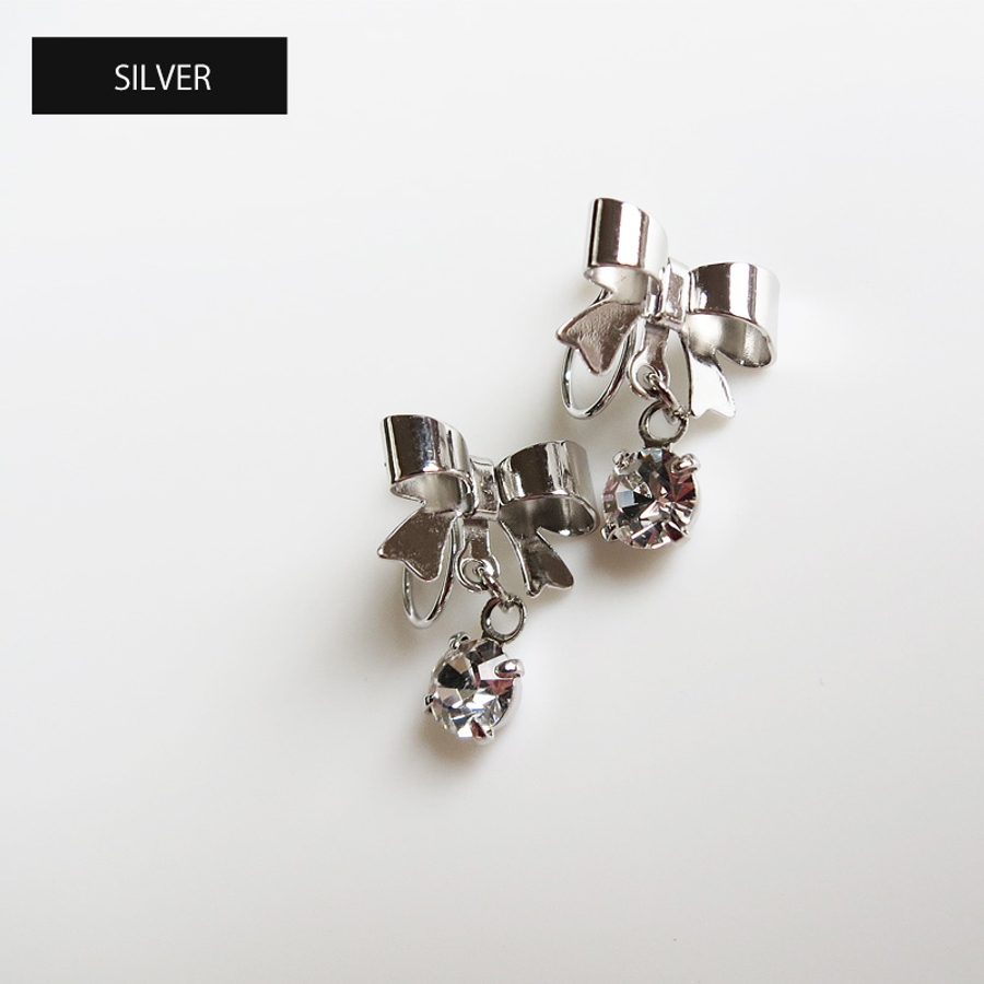 大粒ストーンが揺れて可愛らしいりぼんイヤリング。